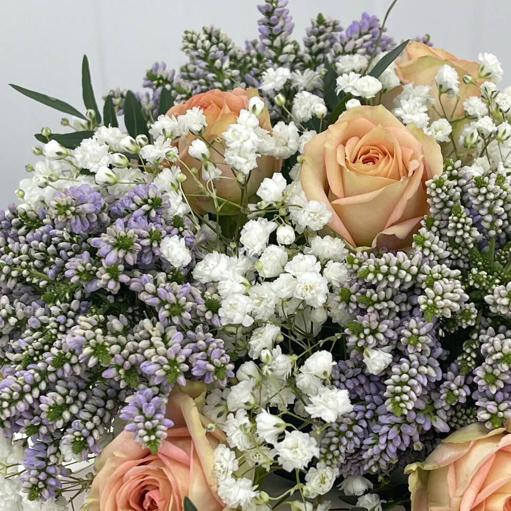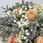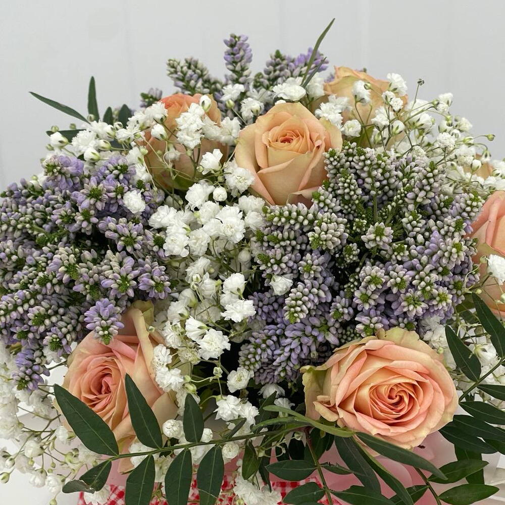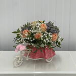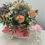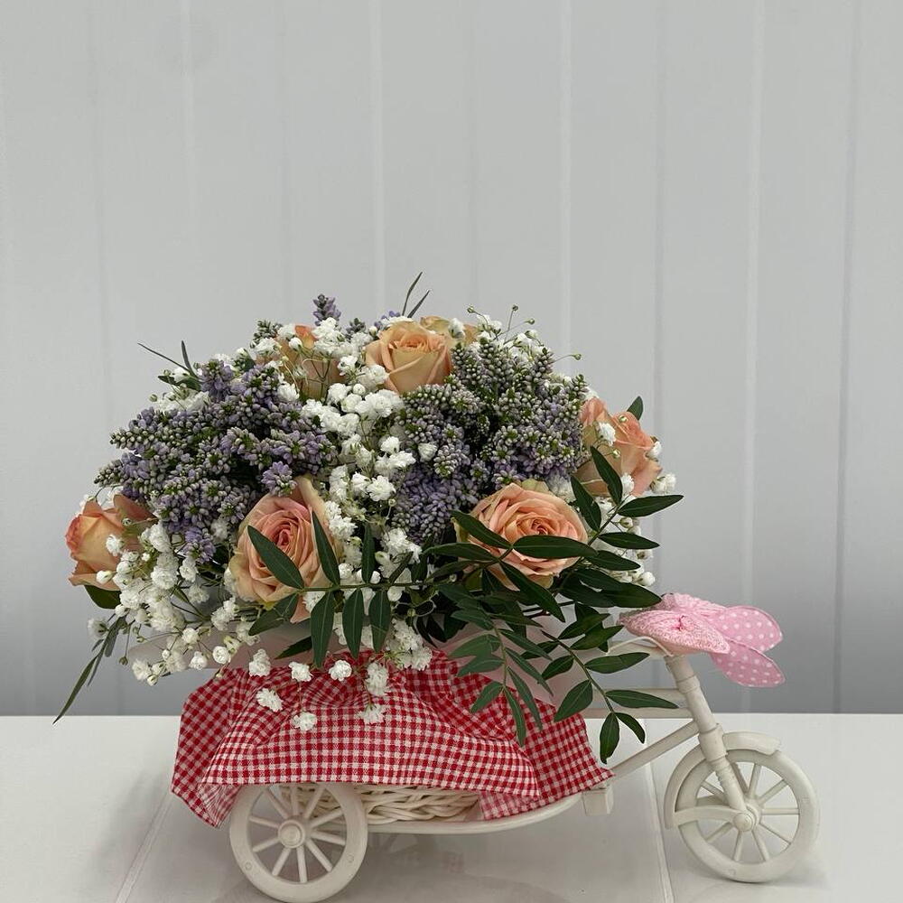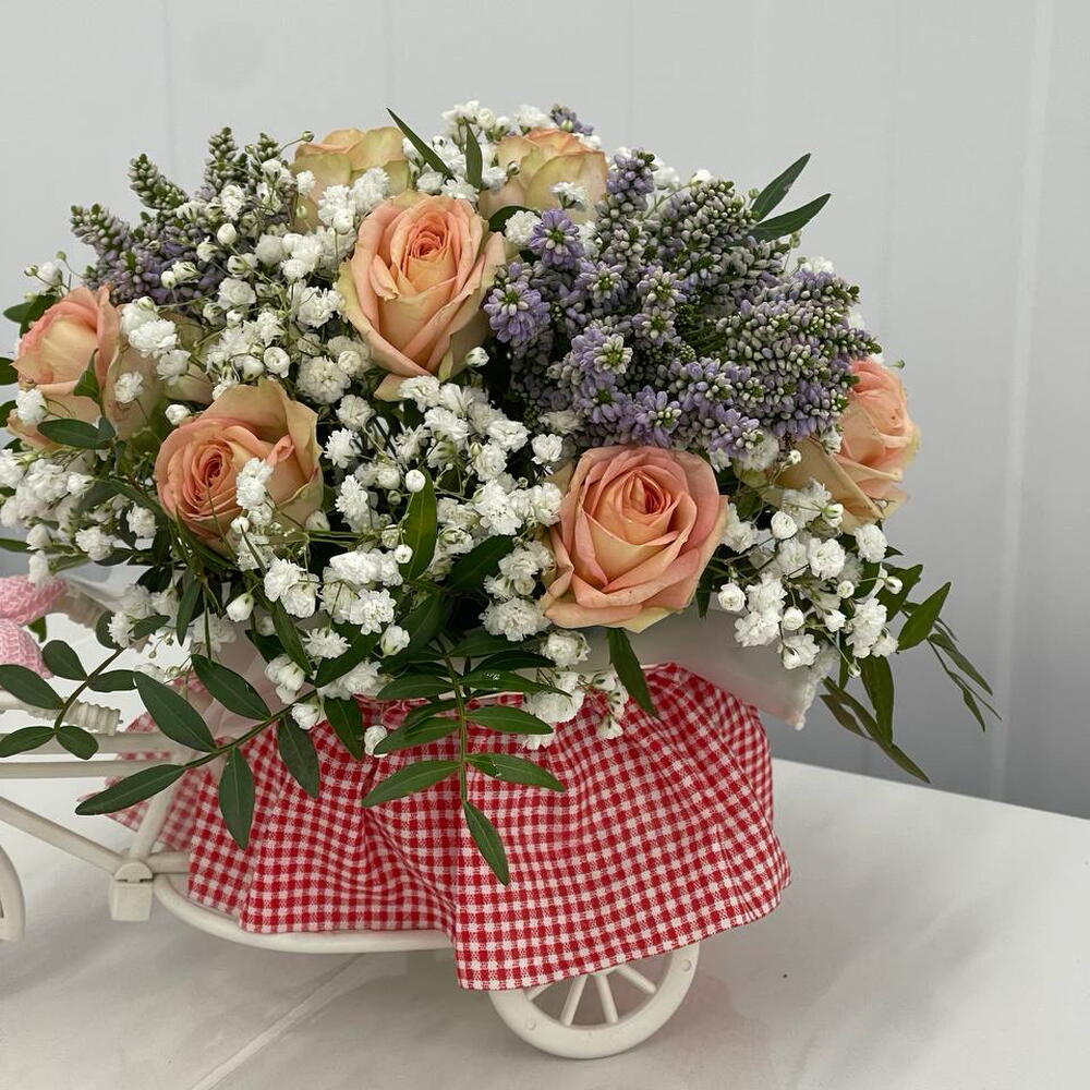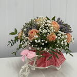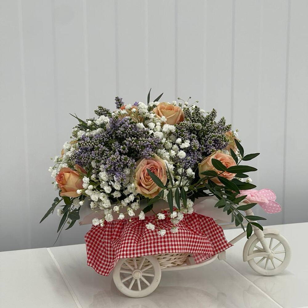 Очаровательная цветочная композиция в декоративной корзинке-велосипеде, наполненная нежностью и уютом. В композиции - изящные персиковые розы с мягкими бархатными лепестками, воздушная белая гипсофила и фактурные соцветия в нежно-лавандовых оттенках, создающие пышный объём и лёгкость. Зелень придаёт композиции свежесть и естественность, а красно-белая ткань в клетку добавляет тёплый, домашний акцент и особый шарм. Композиция выглядит романтично и очень трогательно — словно маленький цветочный подарок с настроением весны и уюта. Идеально подойдёт для милого сюрприза, дня рождения, комплимента, украшения интерьера или подарка с душой 🌸🚲✨