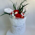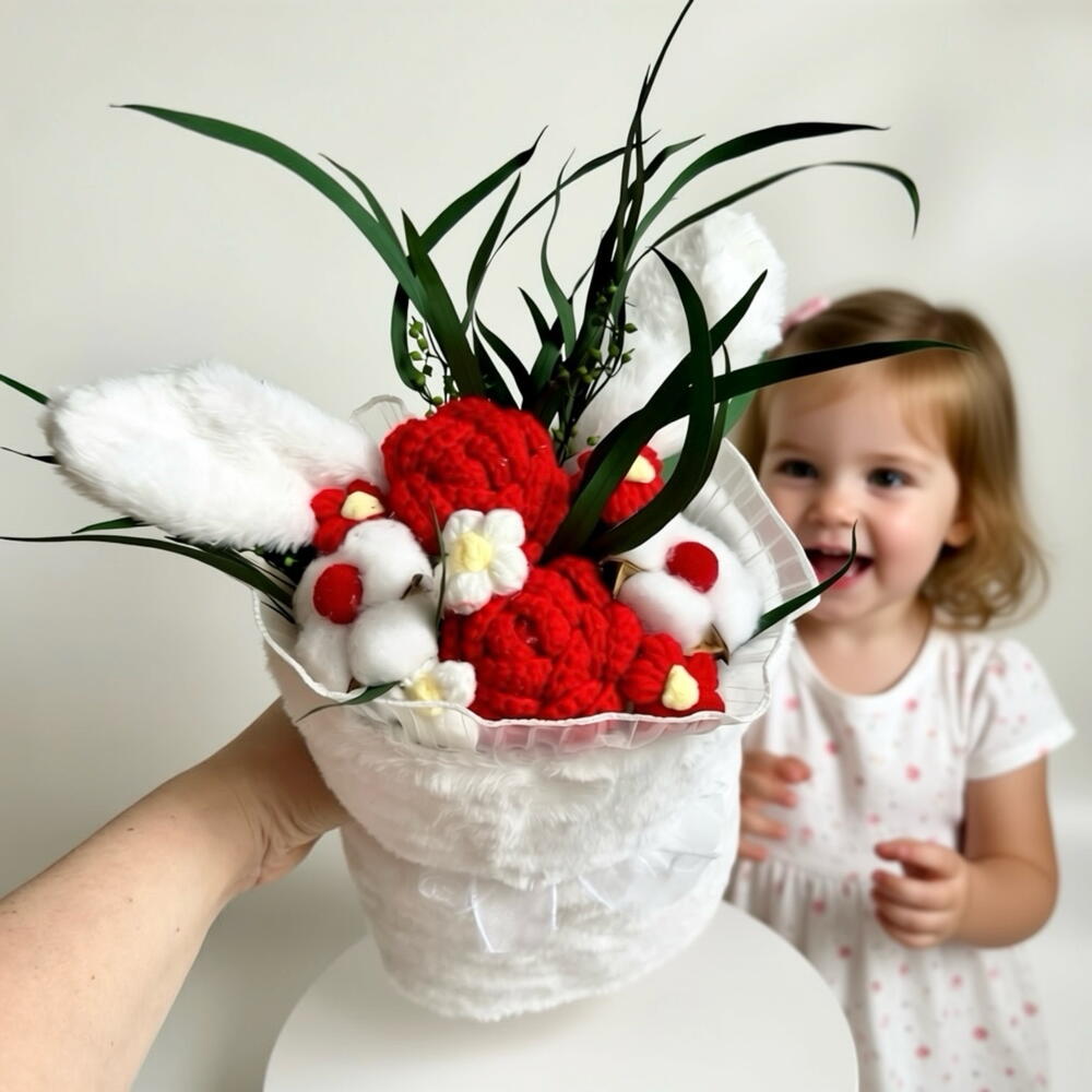 Милый детский букет с ушками в плюшевой упаковке — оригинальный подарок ребёнку и эффектный аксессуар для фото. В составе: нежные вязаные цветы, натуральный хлопок и декоративный эвкалипт, которые создают объёмную, уютную композицию. Такой букет для девочки (подойдёт и мальчику) станет отличным вариантом на день рождения, выпускной в детском саду, 1 сентября или как подарок на праздник. Букет долго сохраняет аккуратный вид, не требует полива и красиво смотрится как декор для детской комнаты. Комплектация: Букет ,открытка и подарочный пакет, 100% отличное настроение