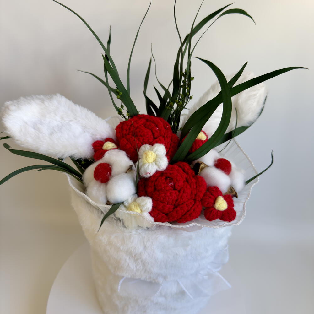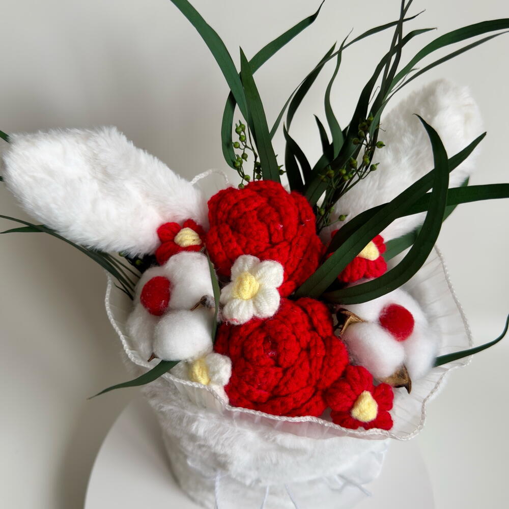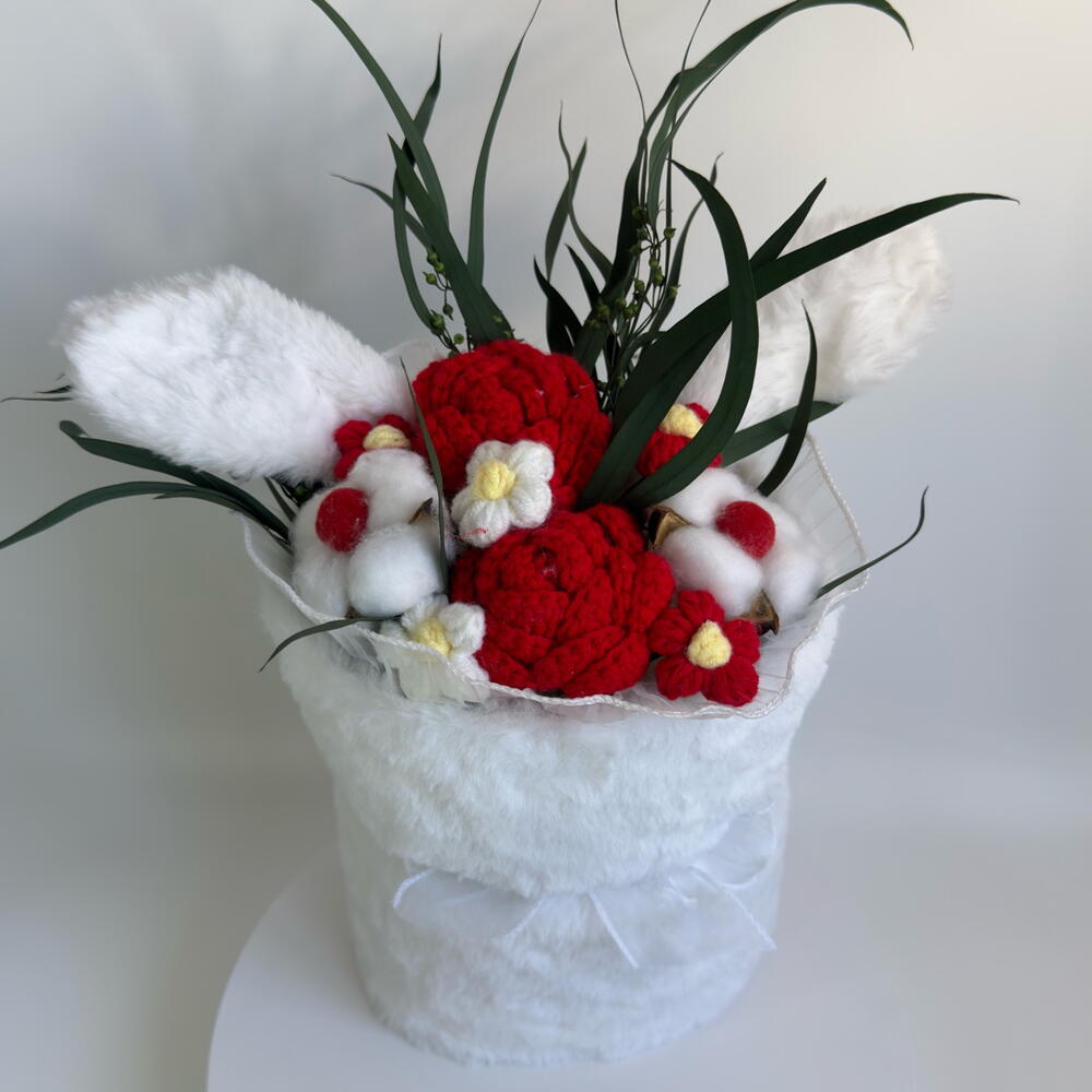 Детский букет с ушками, вязаными цветами, хлопком и эвкалиптом «Зайка»
