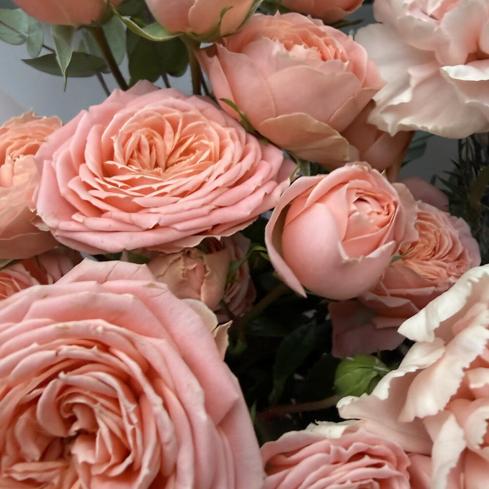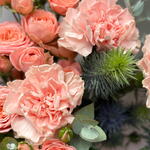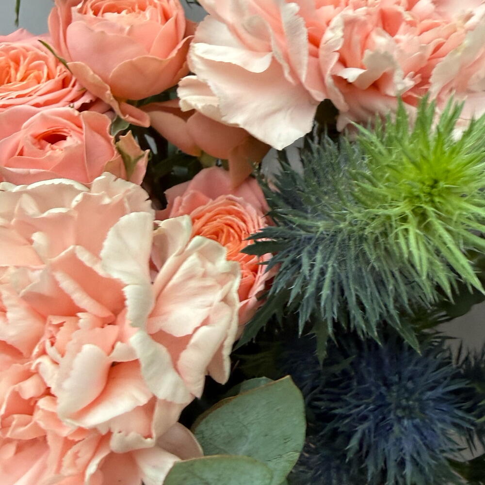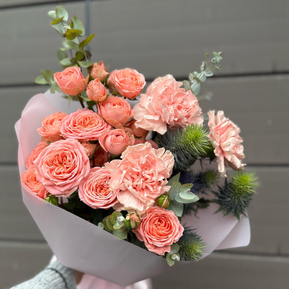 Диантусы и кустовые розы в оттенке клубничного мороженого с эрингиумом