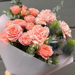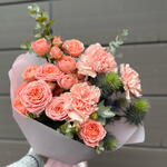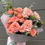 Кустовая пионовидная роза - 2 шт. Открыточка с вашими пожеланиями - 1 шт. Эрингиум Синий - 1 шт. Эвкалипт Цинерея - 1 шт. Средство для продления жизни цветов - 1 шт. диантус гвоздика - 3 шт. упаковка транспортировочная - 1 шт. упаковка матовая корейская пленка - 1 шт.