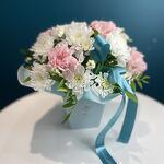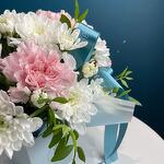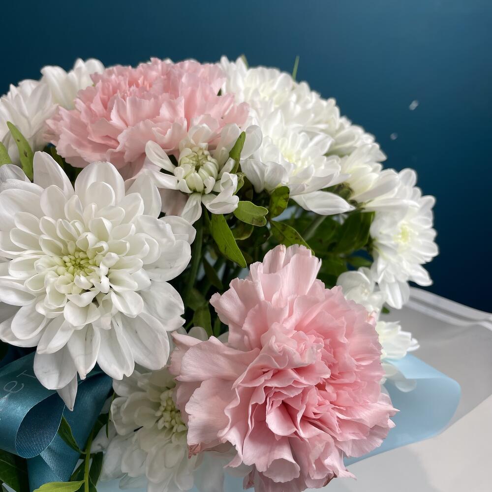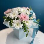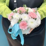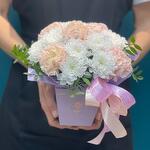 Представляем вашему вниманию великолепный букет из белоснежных хризантем и диантусов в коробке, созданный профессиональными флористами. Это идеальный подарок для любого торжества: дня рождения, годовщины, свадьбы или просто как знак внимания близкому человеку. Состав композиции🌿 Наши флористы создают каждый букет индивидуально, учитывая сезонность, доступность цветов и ваши пожелания. Мы можем дополнить композицию приятными сюрпризами: • Конфетами Rafaello • Мягкими игрушками • Открытками • Воздушными шарами Важная информация 🪷 Поскольку цветы — это живой материал, возможны незначительные изменения в сортах или оттенках при сохранении общей концепции и настроения композиции.