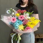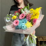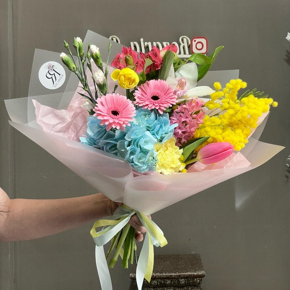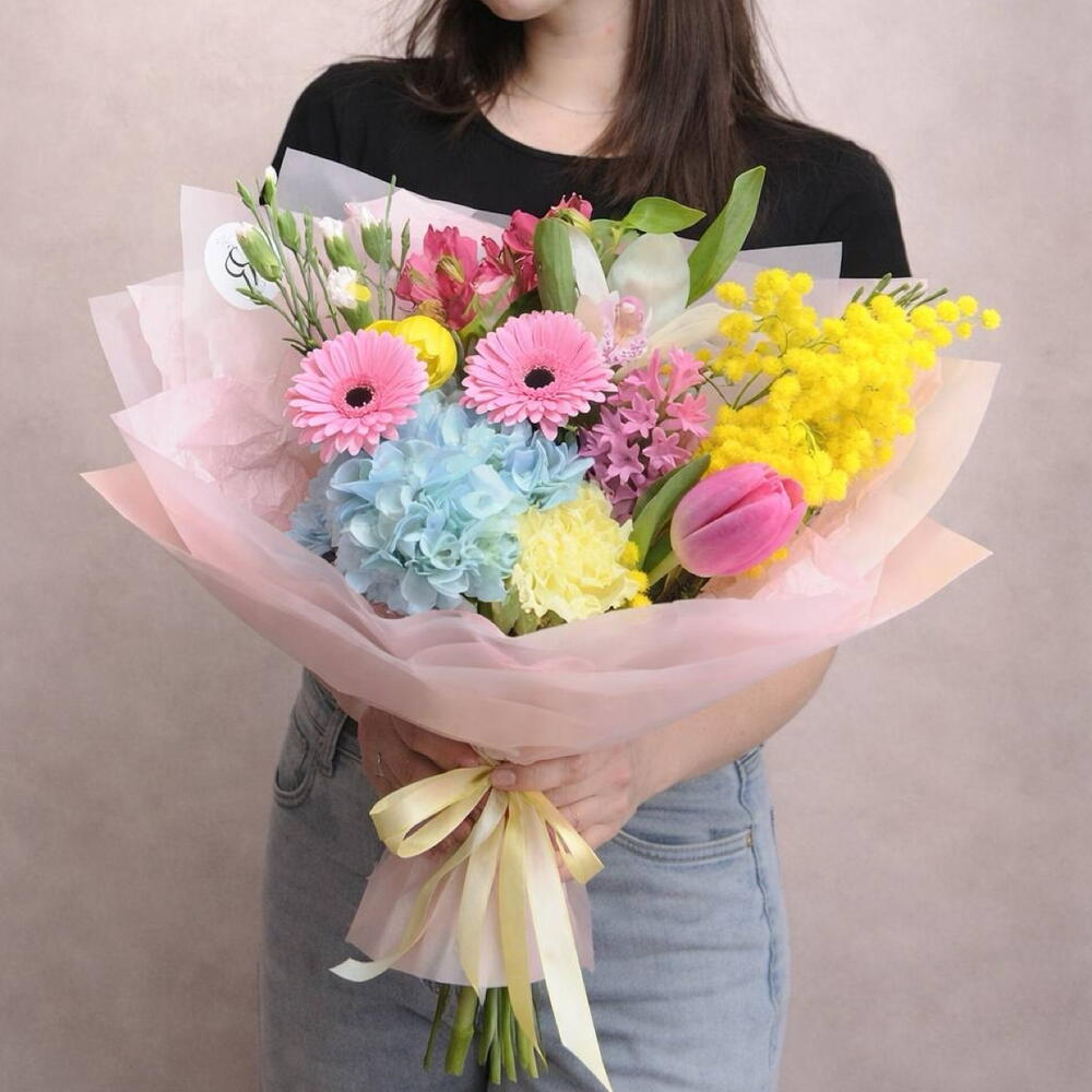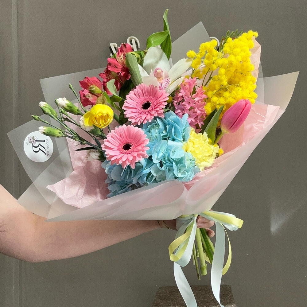 Альстромерия - 1 шт. Гермини - 2 шт. Гортензия - 1 шт. Мимоза - 1 шт. Нарцисс - 1 шт. Тюльпан - 1 шт. Диантус - 1 шт. ЦИМБИДИУМ - 1 шт. Диантус кустовой - 1 шт. Гиацинты - 1 шт.