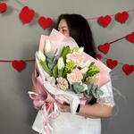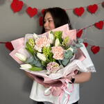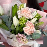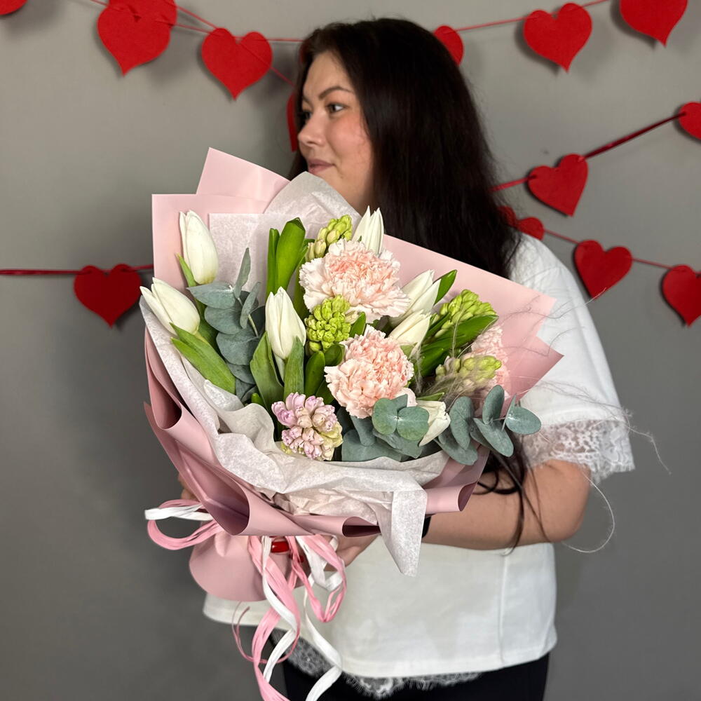 Гиацинт - 5 шт. Тюльпан - 7 шт. Эвкалипт - 3 шт. Лента атласная - 3 шт. Диантус - 3 шт. Упаковка дизайнерская - 3 шт. Стифа - 2 шт.