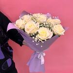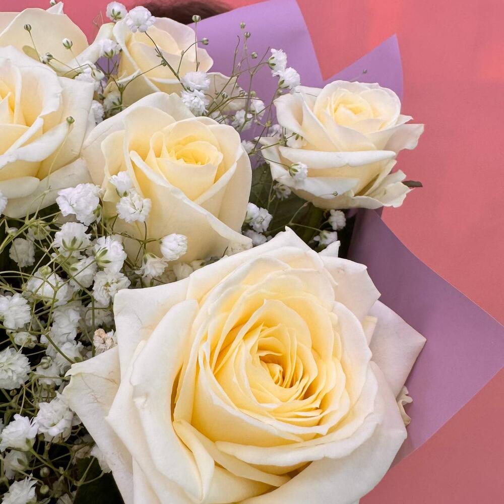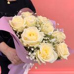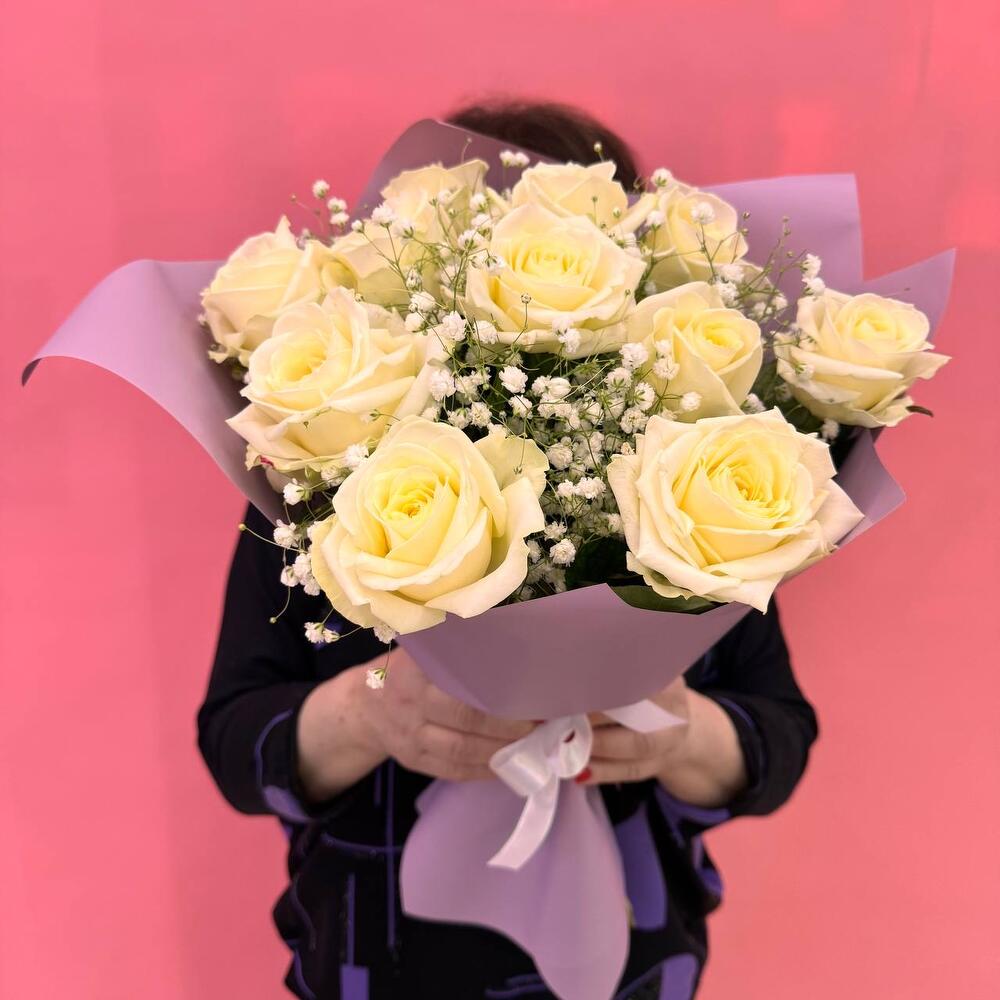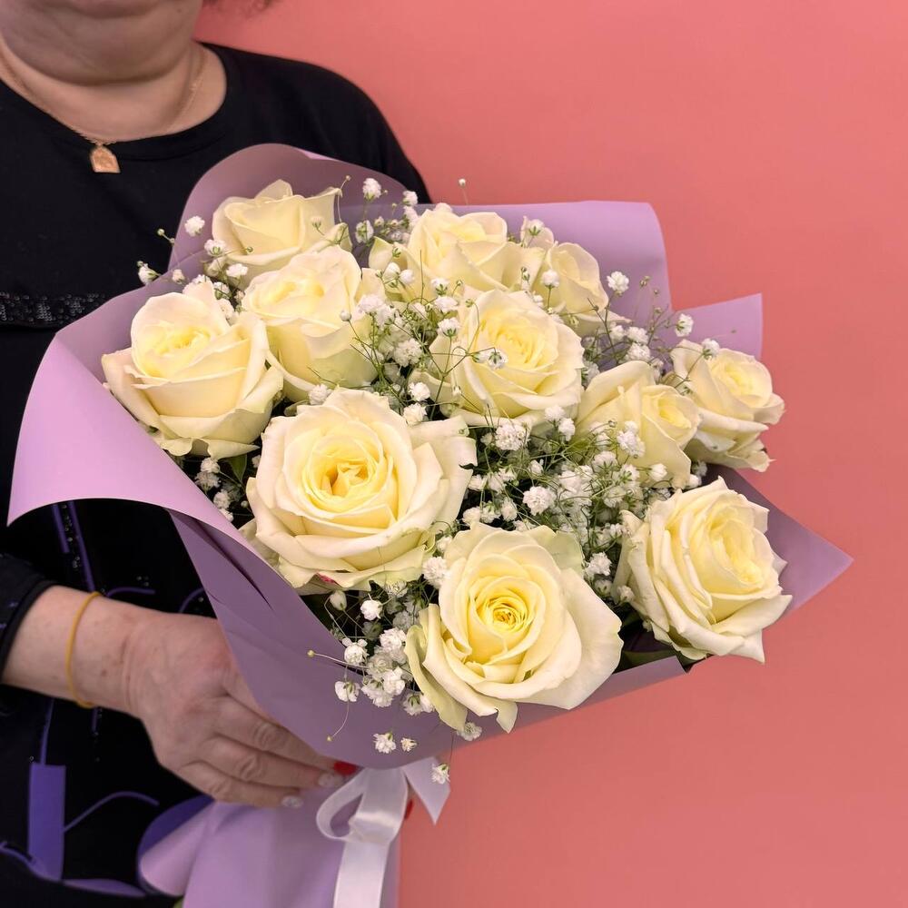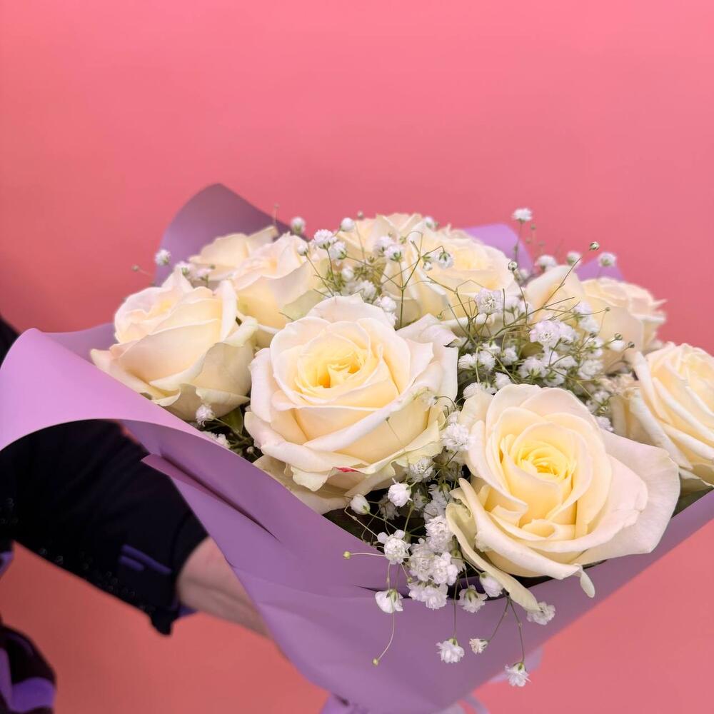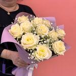 Гипсофила - 2 шт. Роза Аваланж - 11 шт. Атласная лента - 1 шт. Дизайнерская упаковка - 1 шт.