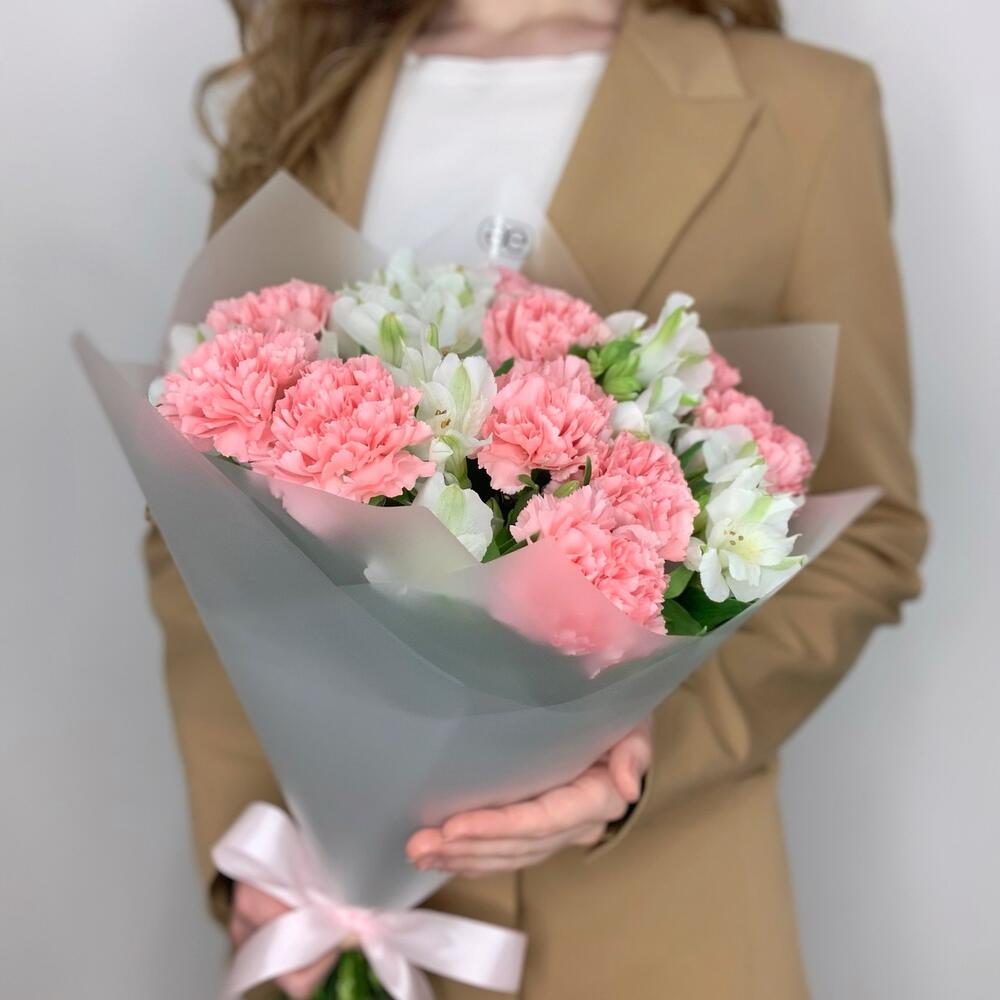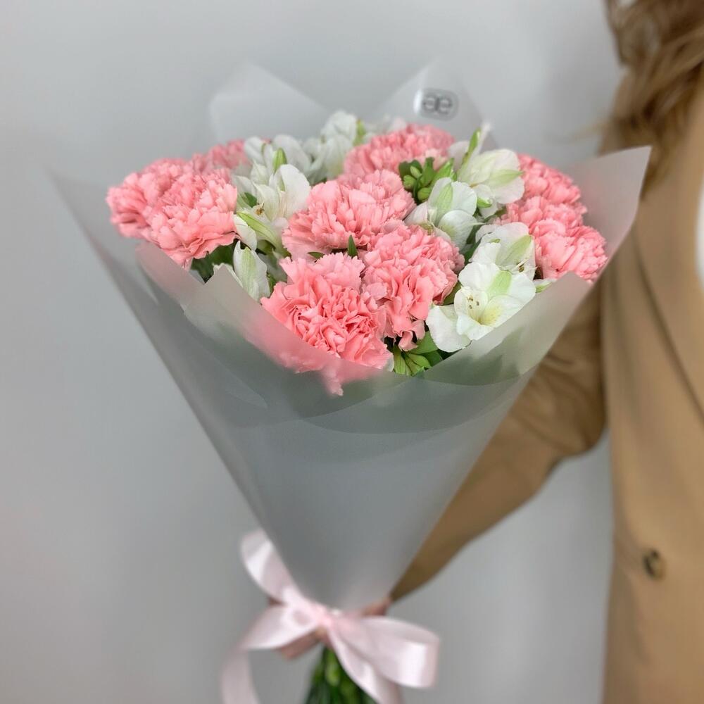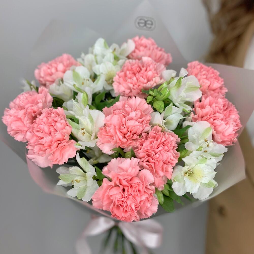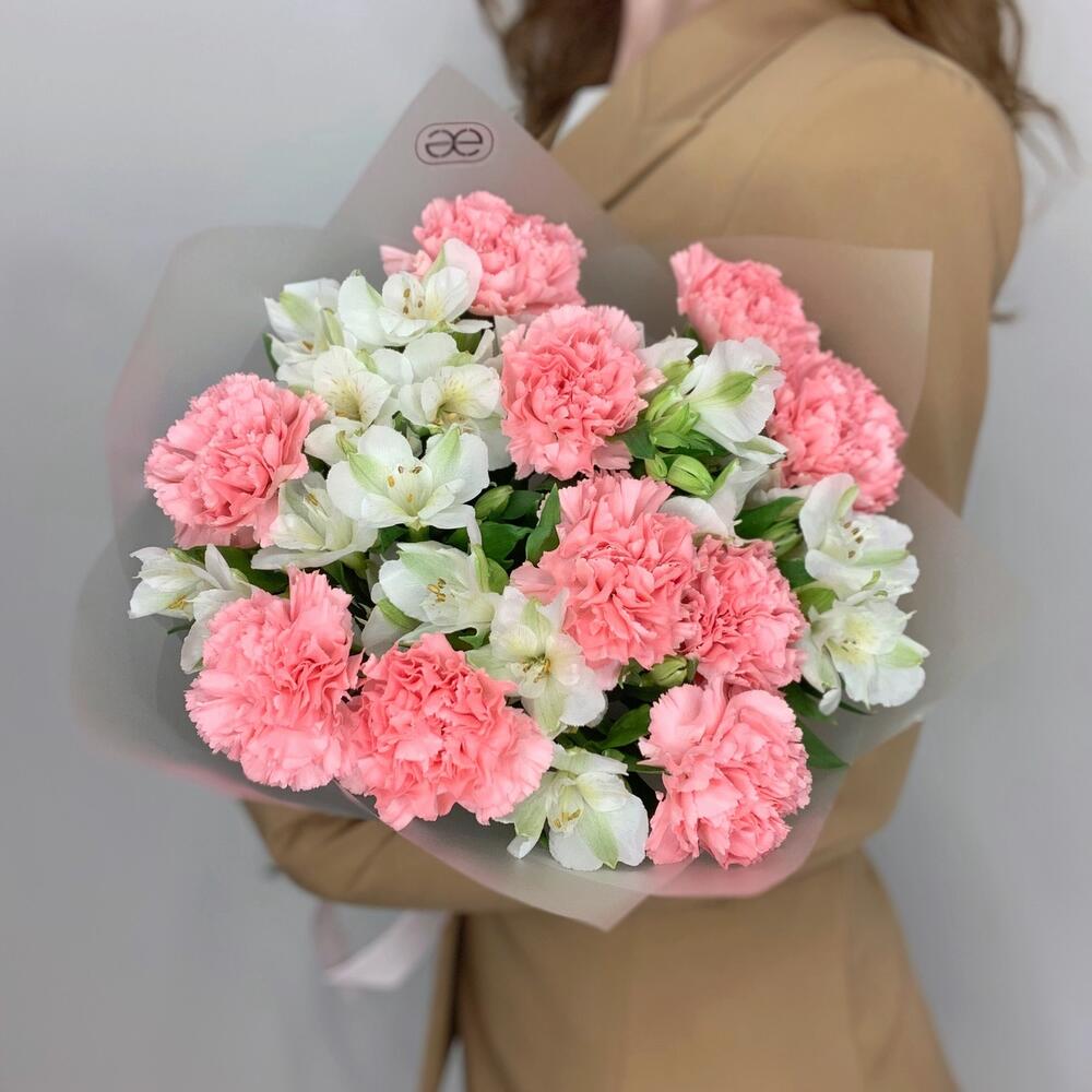 Дуобукет из розовых гвоздик и белых альстромерий