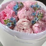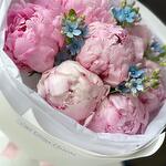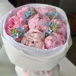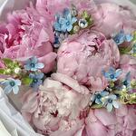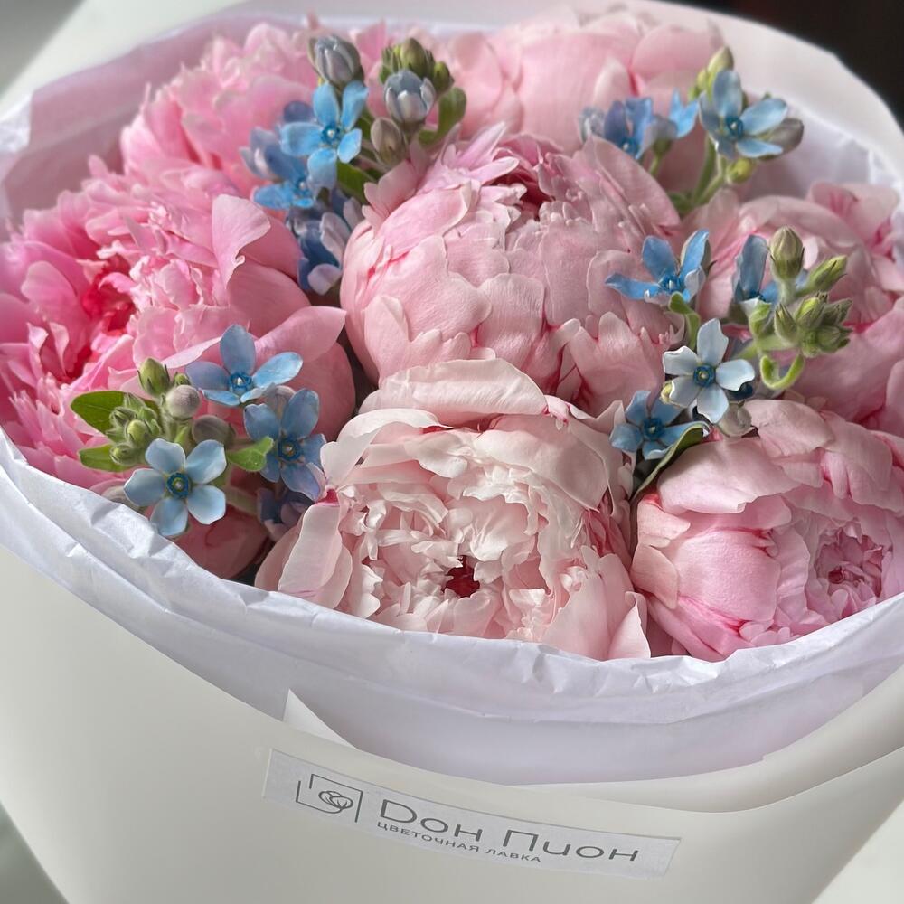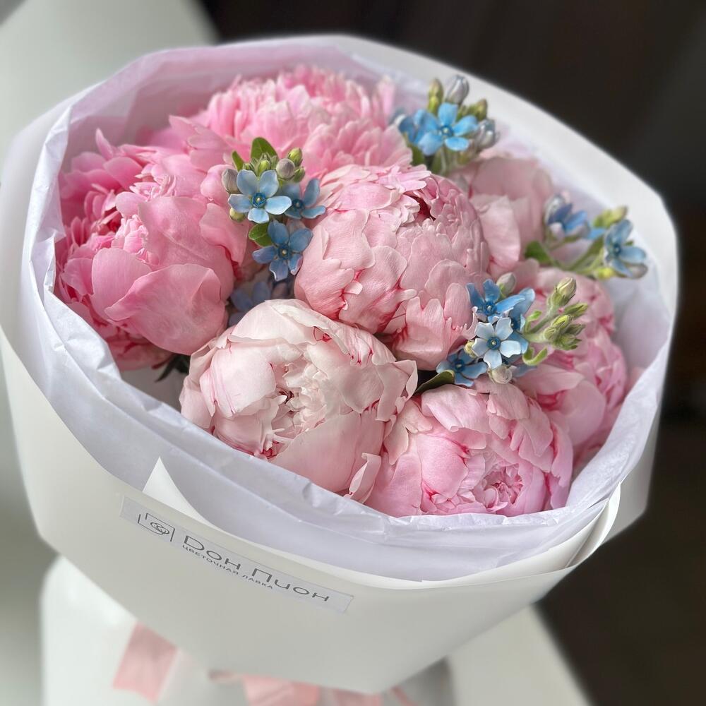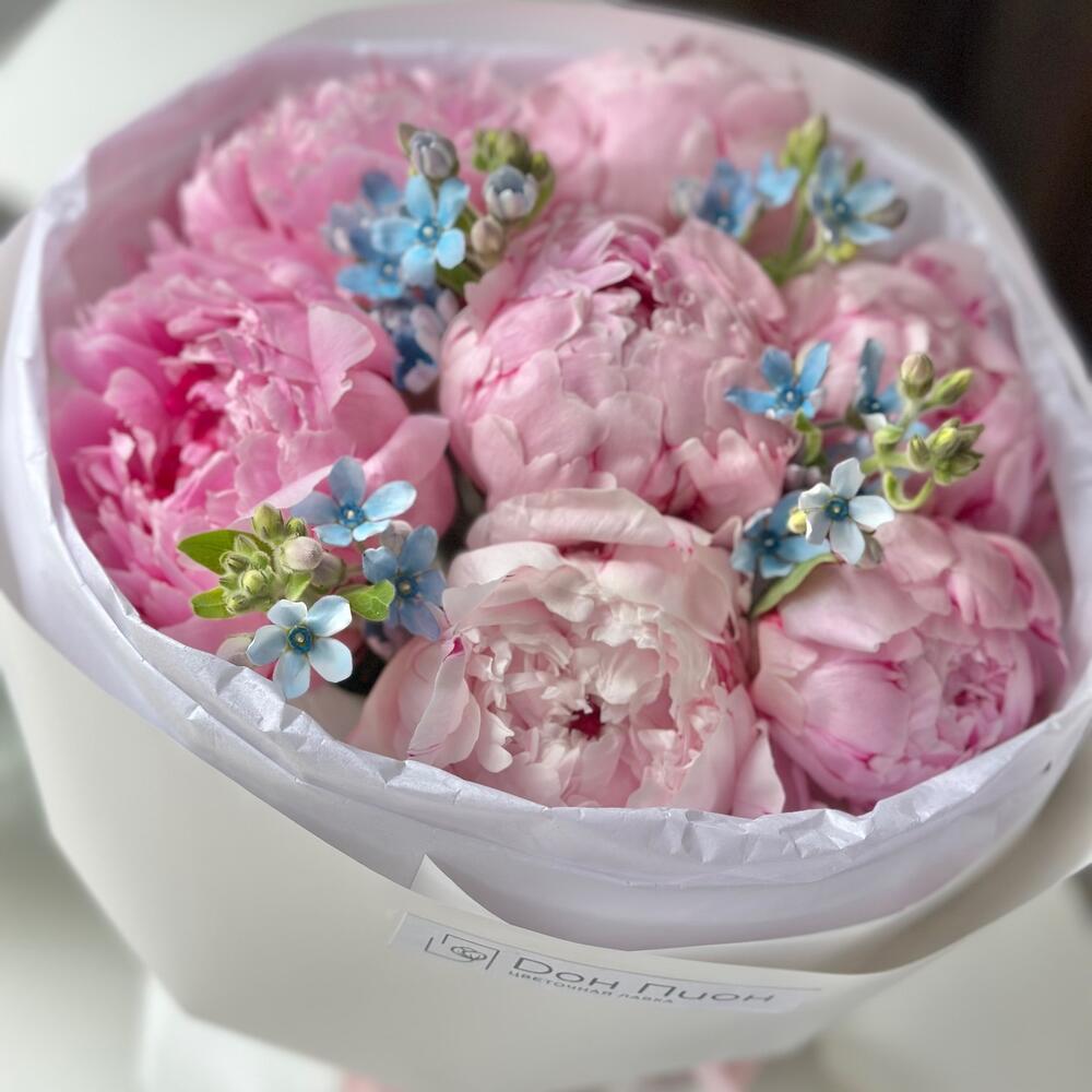 Пион Розовый - 7 шт. Пленка матовая - 1 шт. Тишью белое - 2 шт. оксипеталум голубой - 4 шт.