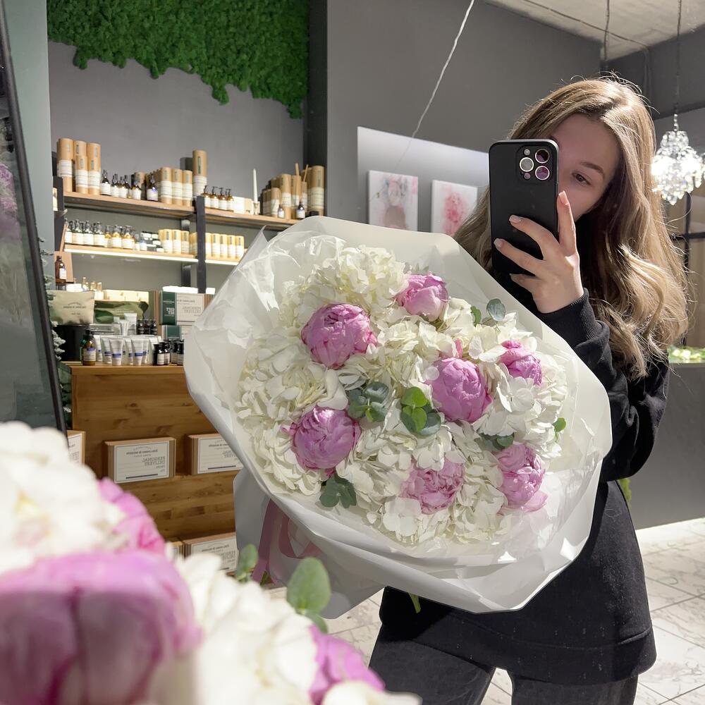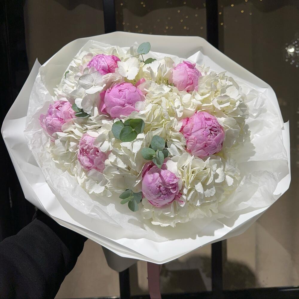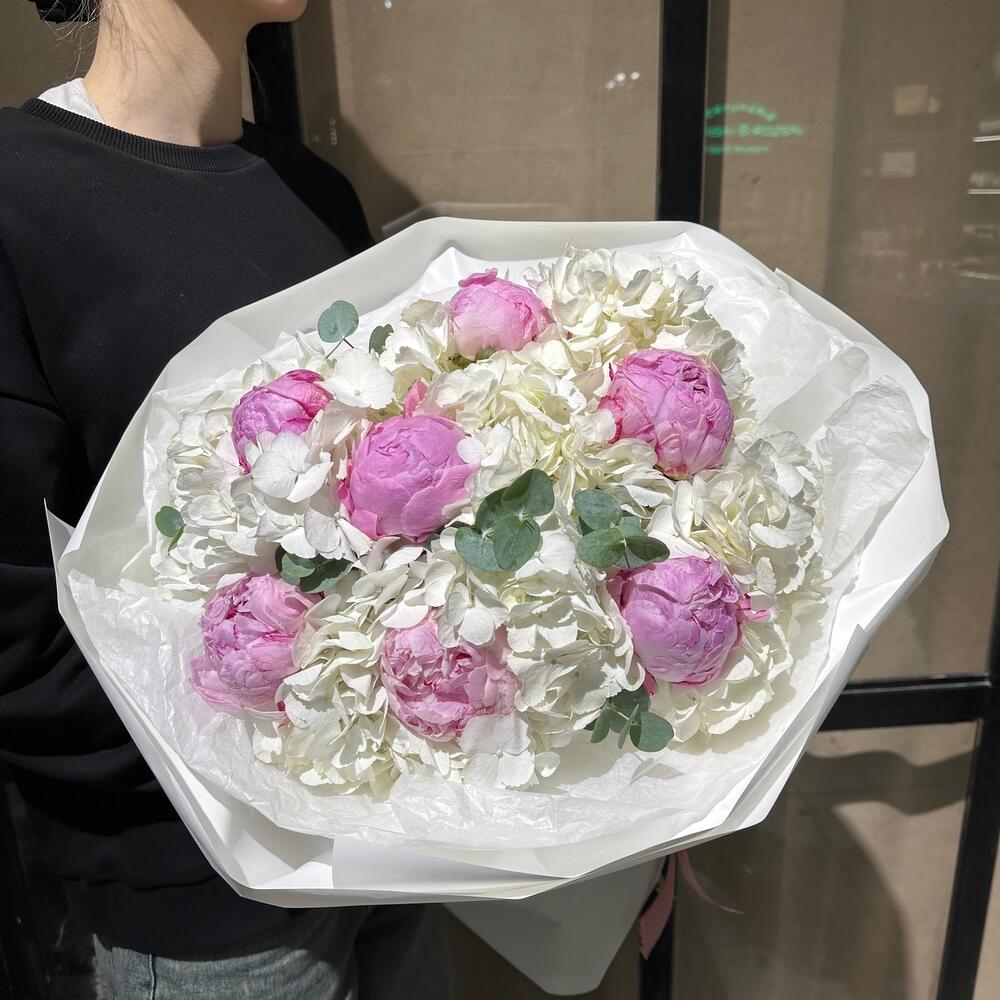 Гортензия - 5 шт. Пион - 7 шт. Эвкалипт - 3 шт. Упаковка - 2 шт.