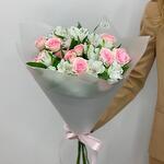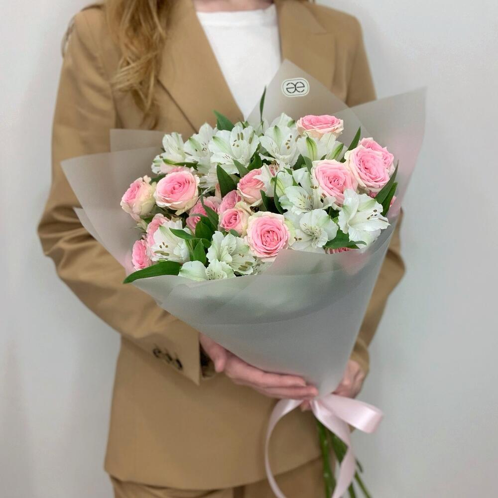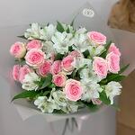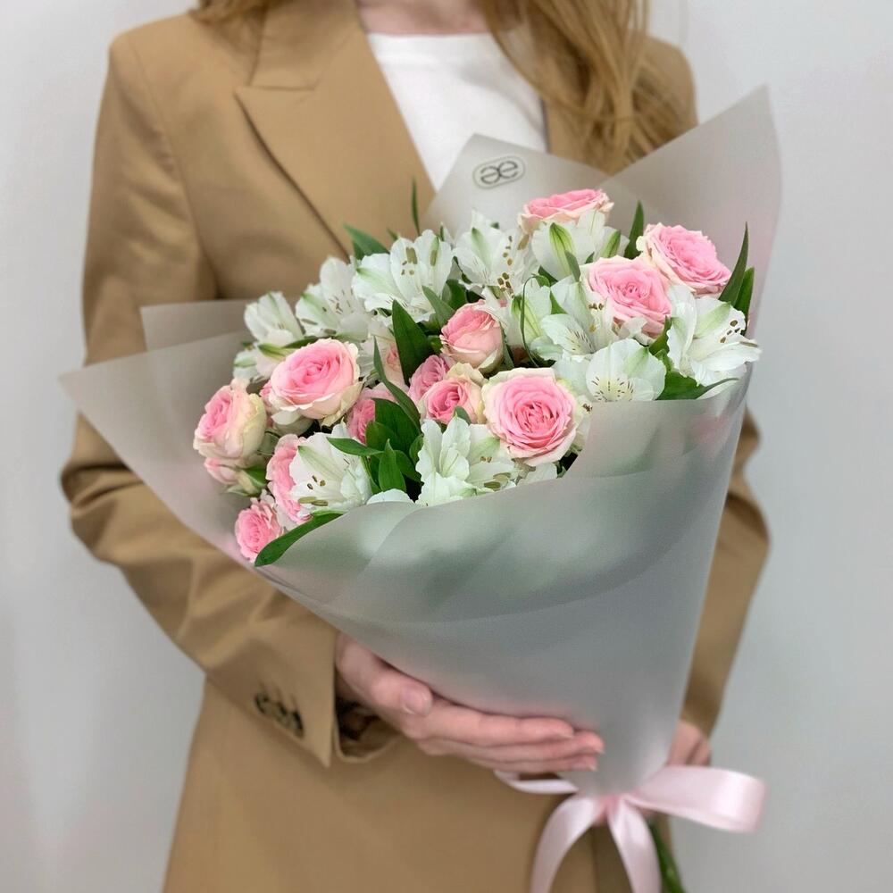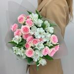 Дуобукет из кустовых роз "Динара" и белых альстромерий 4|3