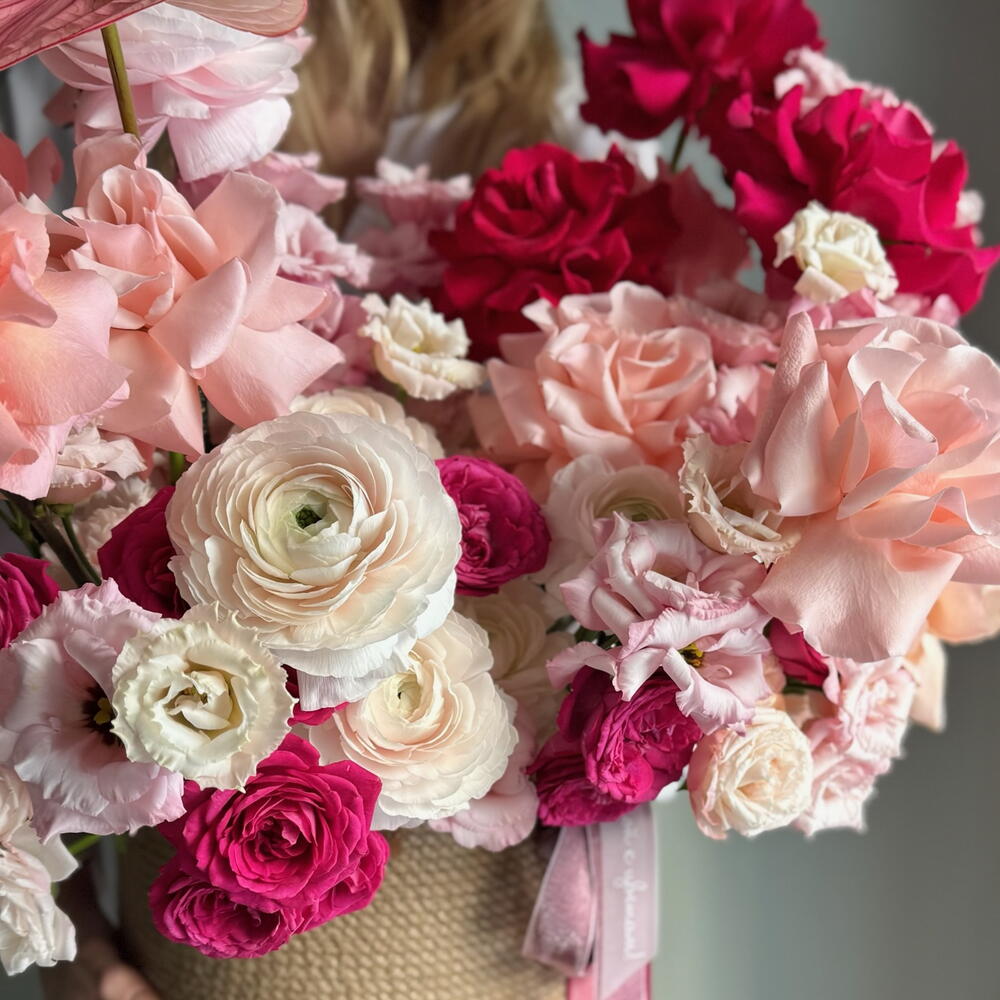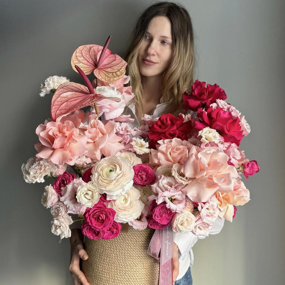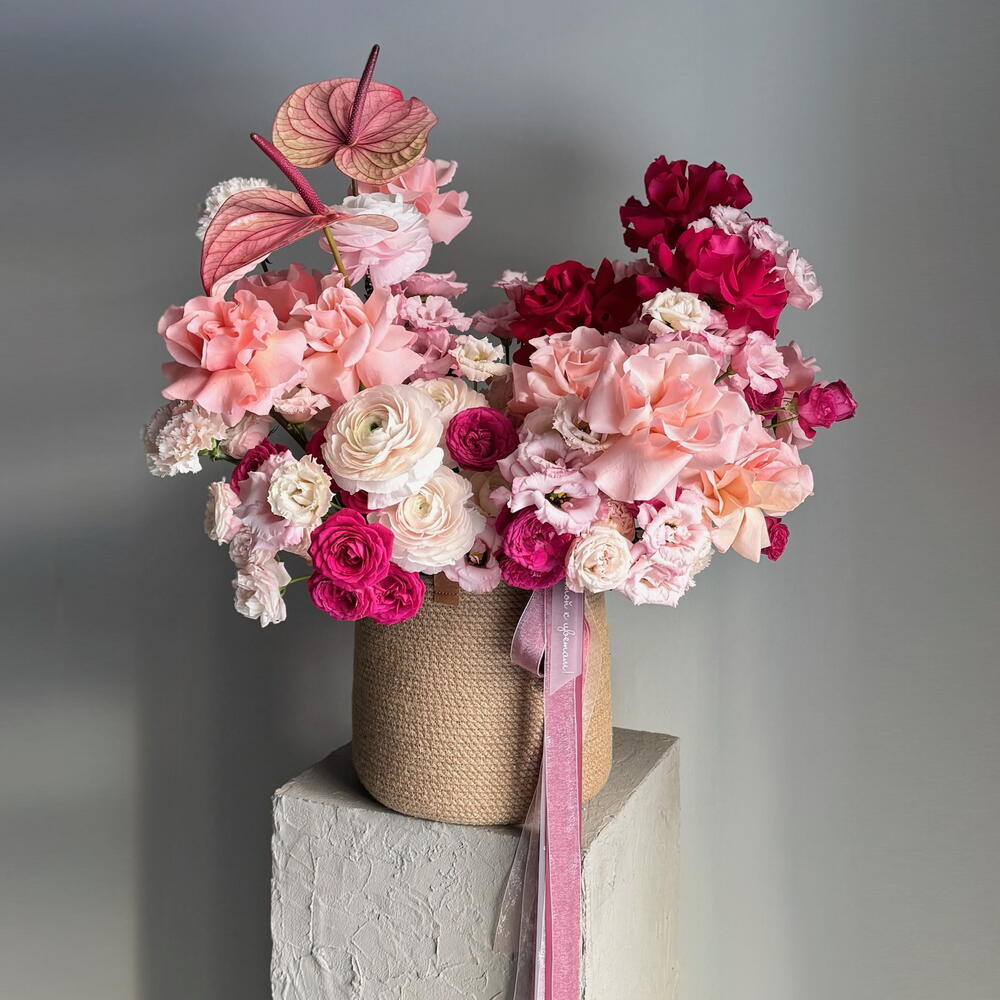 Нежные и смелые оттенки розового в одной композиции. Акцентом является ярко-розовая французская роза Готча и экзотический антуриум, а мягкости добавляют роза Бисвит, пышные бутоны ранункулюсов и эустома. Каждый цветок подобран не случайно, а сама композиция оформлена в плетеной корзине ручной работы. Подойдет в подарок для тех, кто заслуживает вашего особого внимания. Цветы - это живые и хрупкие создания. Чтобы они радовали Вас дольше не забывайте ежедневно ухаживать за композицией 💚 Оформляя заказ у нас Вы выбираете уникальность, качество, заботу и быструю бережную доставку цветов до адреса Вашего близкого человека по любому случаю, будь то день рождения, профессиональный праздник, торжество или комплимент без повода. В нашей цветочной мастерской Вы найдёте богатый выбор букетов, композиций, корзин и шляпных коробок с такими цветами как французская роза, ранункулюс, гортензия, хризантема, гвоздика (диантус), гербера, кустовая и пионовидная роза, которым аккомпанирует эвкалипт, молюцелла, вибурнум, писташ. В состав наших букетов и композиций входят самые интересные сорта из Голландии, Италии, Эквадора, Колумбии и других плантаций разных стран, а также локальные фермерские цветы премиального качества, которые смогут выразить Ваши самые глубокие, тëплые или смелые чувства.