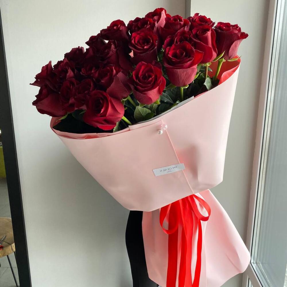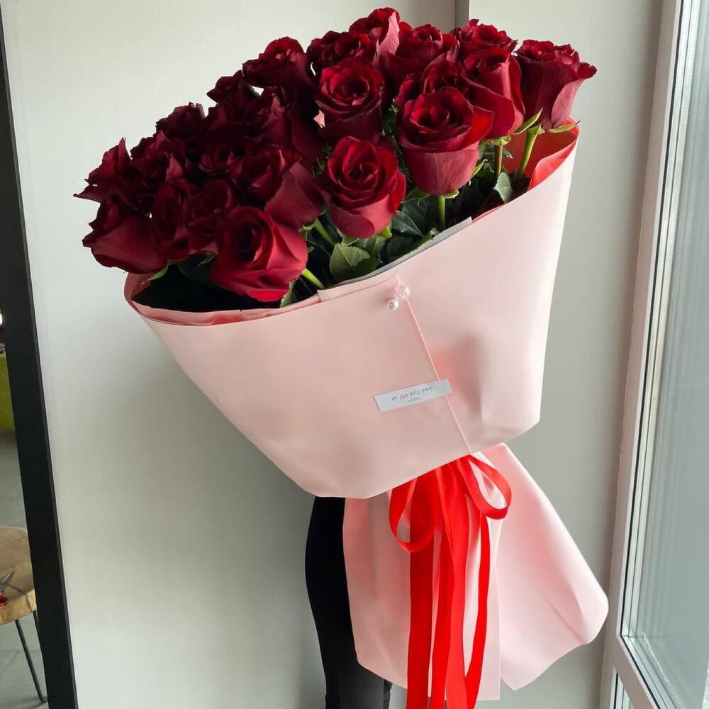 Лента - 1 шт. Упаковка дизайнерская - 2 шт. Бусина - 1 шт. аквапак с водой - 1 шт. эквадорская роза - 25 шт. памятка по уходу и подкормка для цветов - 1 шт.