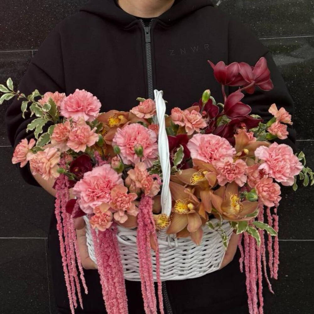 Лента атласная - 2 шт. Диантус - 5 шт. Амарант - 5 шт. ЦИМБИДИУМ - 5 шт. Корзина плетеная - 1 шт. Питтоспорум Нигра - 4 шт. Оазис флористический - 2 шт. Кустовой диантус - 5 шт.