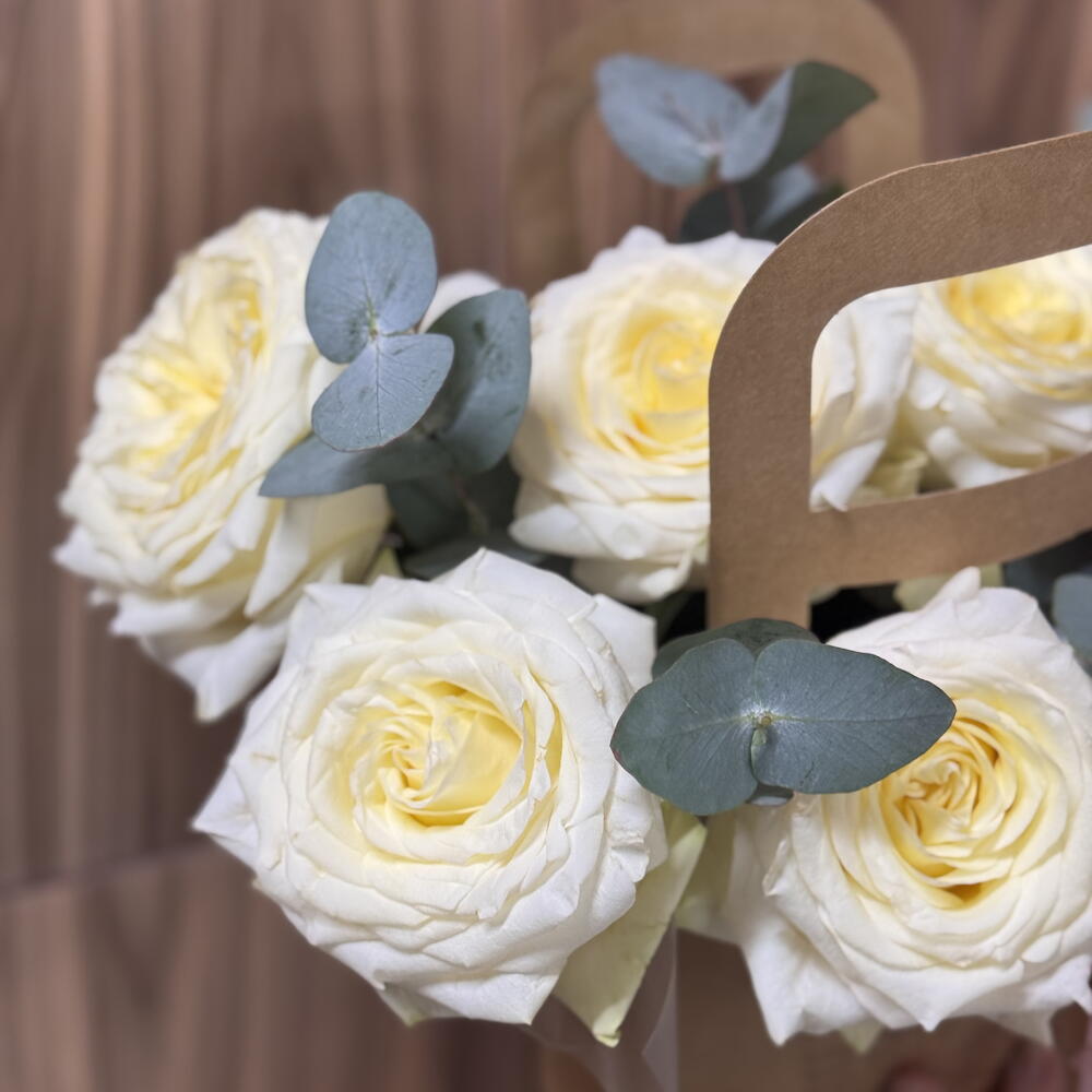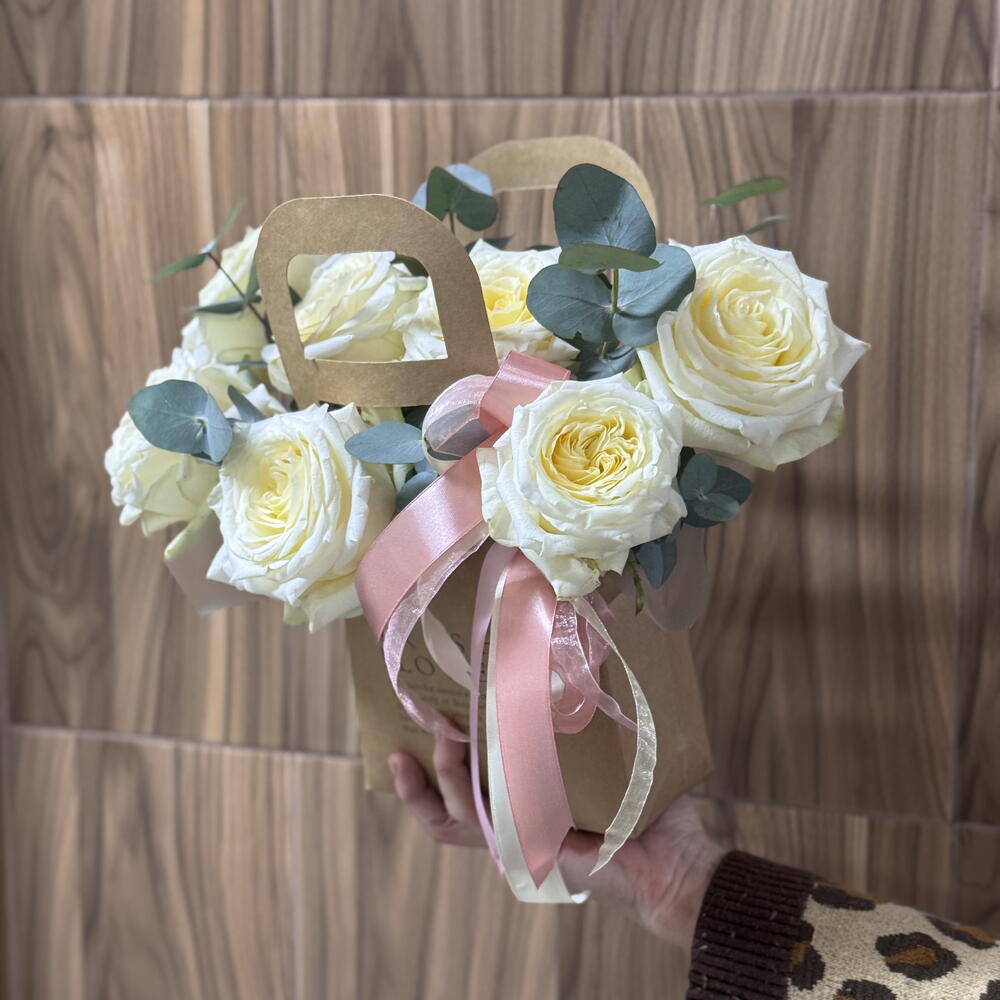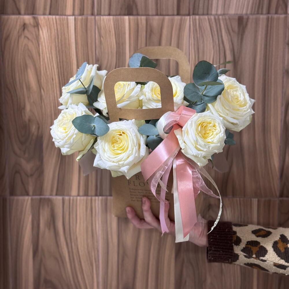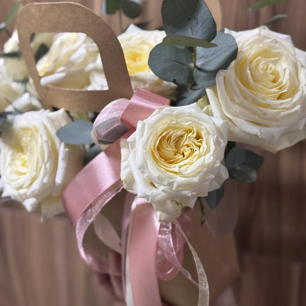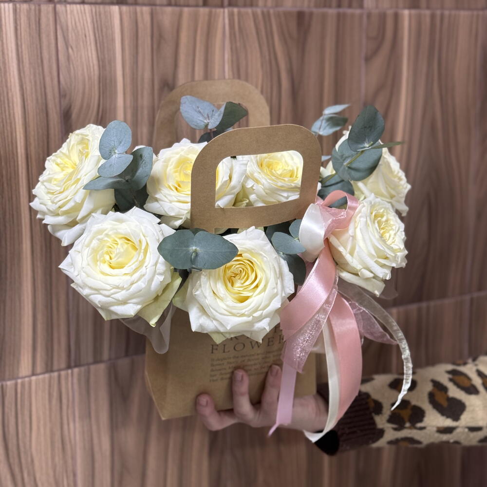 Элегантная цветочная сумочка с кремовыми розами — идеальный комплимент, который говорит о чувствах без слов. Бархатные кремовые розы, дополненные свежими веточками эвкалипта, создают утончённую и лёгкую композицию. Минималистичная крафтовая упаковка с аккуратной ручкой подчёркивает стиль и делает букет готовым подарком — без лишних деталей. Этот букет подойдёт для: • признания в любви • поздравления с важным событием • знака внимания без повода • стильного подарка коллеге или близкому человеку Нежный, воздушный и очень эстетичный — он оставляет тёплое послевкусие и долго радует взгляд 🤍