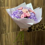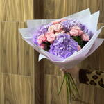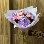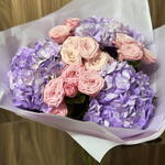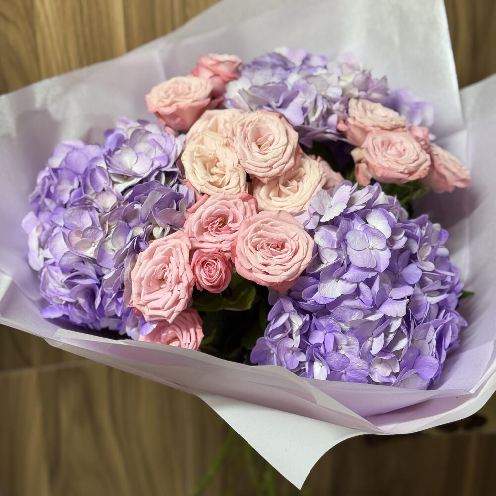 Нежный, воздушный и очень элегантный букет в пастельной гамме — идеальный способ сказать о чувствах без слов. Сиреневые гортензии создают объем и ощущение облака, а пудрово-розовые кустовые розы добавляют композиции тепла и утончённой романтики. Букет выглядит лёгким, свежим и одновременно благородным — он притягивает взгляд и создаёт ощущение спокойствия и заботы. Подойдёт для дня рождения, свидания, благодарности, поздравления или просто как знак внимания, который запомнится. Упакован в полупрозрачную матовую бумагу, подчёркивающую нежность оттенков и аккуратность формы. ✨ Букет, который дарит ощущение уюта, нежности и искренних эмоций.