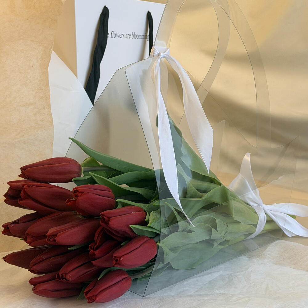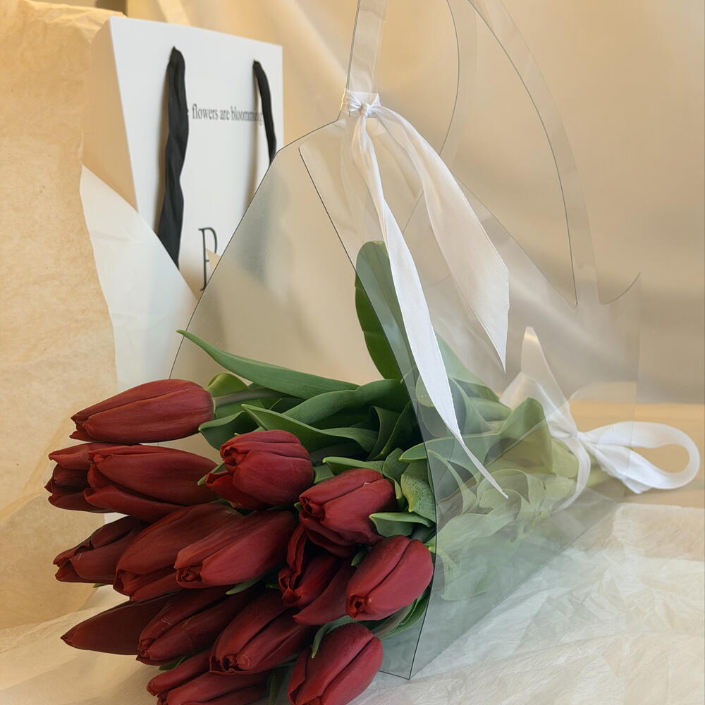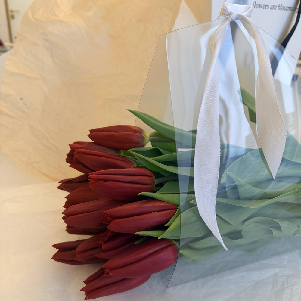 Букет красных тюльпанов в стильной прозрачной упаковке — яркий и элегантный подарок, который идеально подойдёт для признания в чувствах или приятного сюрприза. Свежие красные тюльпаны символизируют любовь, страсть и искренние эмоции. Букет выглядит современно и минималистично благодаря прозрачной дизайнерской упаковке с ручками и аккуратной ленте. Такой букет тюльпанов удобно дарить и переносить, а насыщенный красный оттенок цветов делает композицию эффектной и запоминающейся. Красные тюльпаны — один из самых популярных цветов для романтических подарков. Букет прекрасно подойдёт для девушки, любимой, жены или для особенного повода. Свежие тюльпаны создают атмосферу весны и наполняют подарок теплом и вниманием.