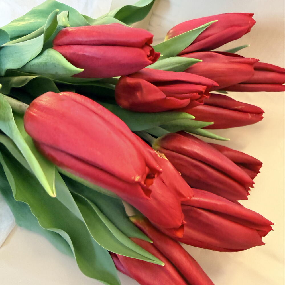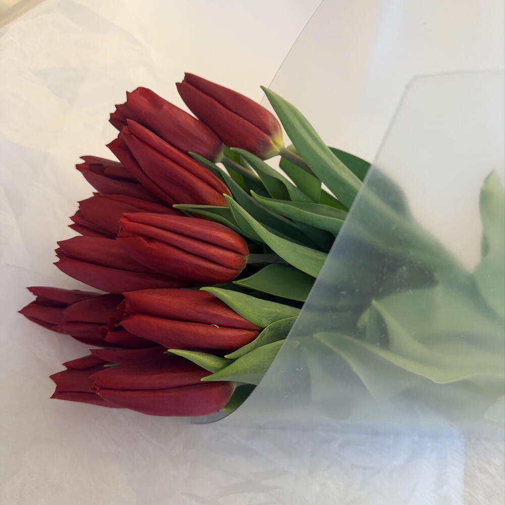 Элегантный букет из красных тюльпанов в прозрачной стильной упаковке — яркий и романтичный подарок для любимого человека. 🌷