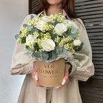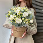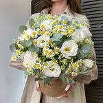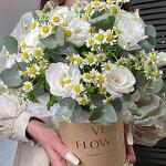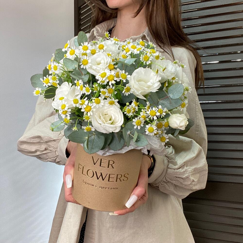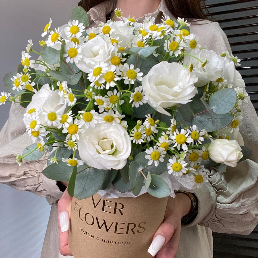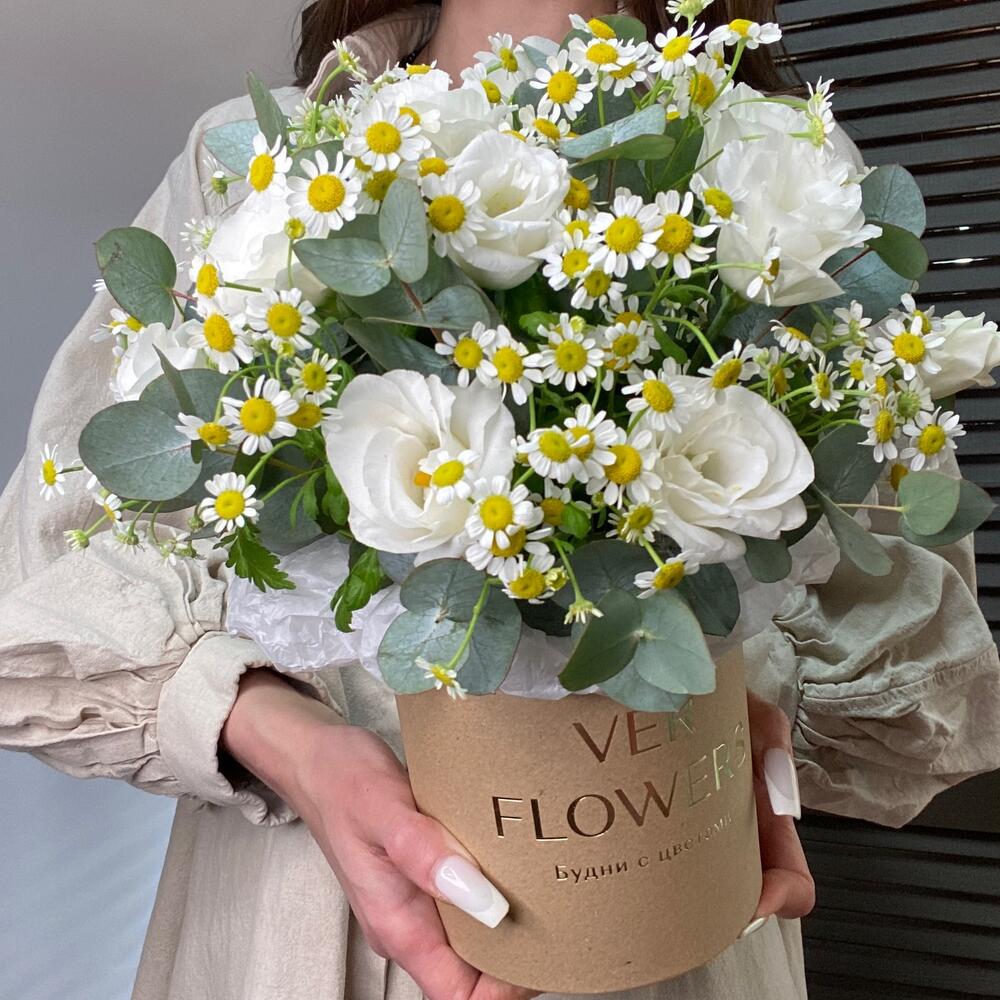 Эвкалипт - 1 шт. Коробка шляпная - 1 шт. Ромашка кустовая - 5 шт. Оазис флористический - 1 шт. эустома белая - 2 шт.