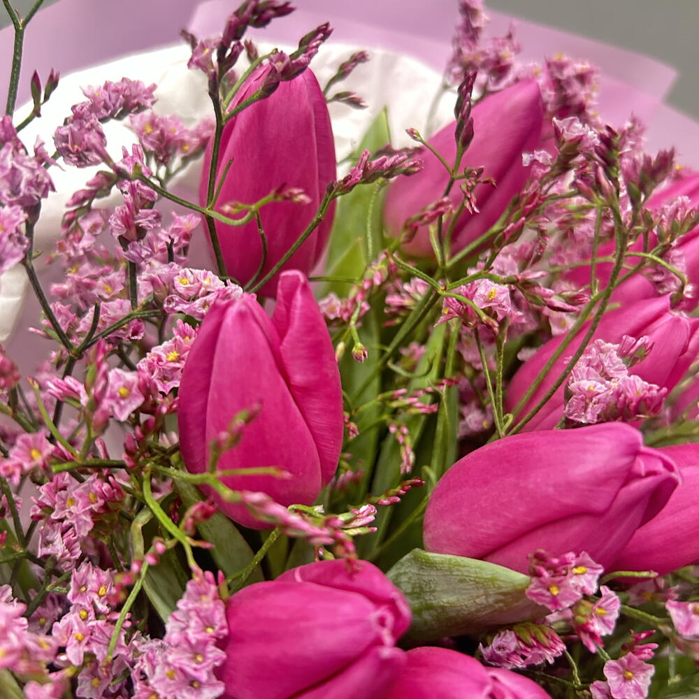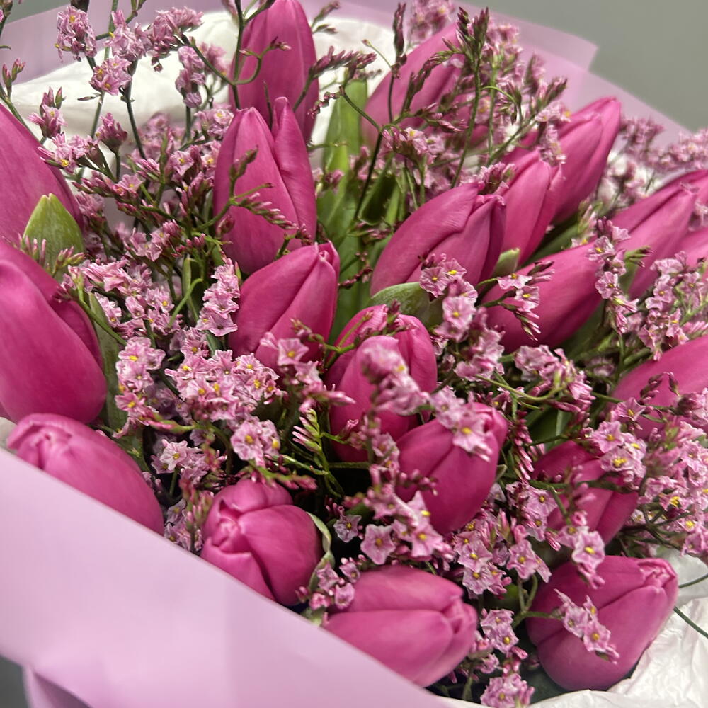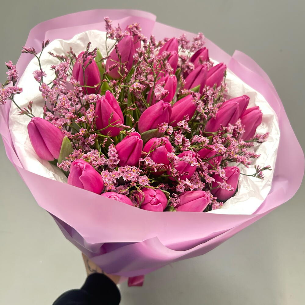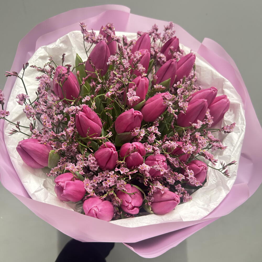Лимониум - 3 шт. Тюльпан - 25 шт. Упаковка дизайнерская - 1 шт.