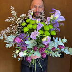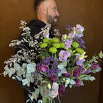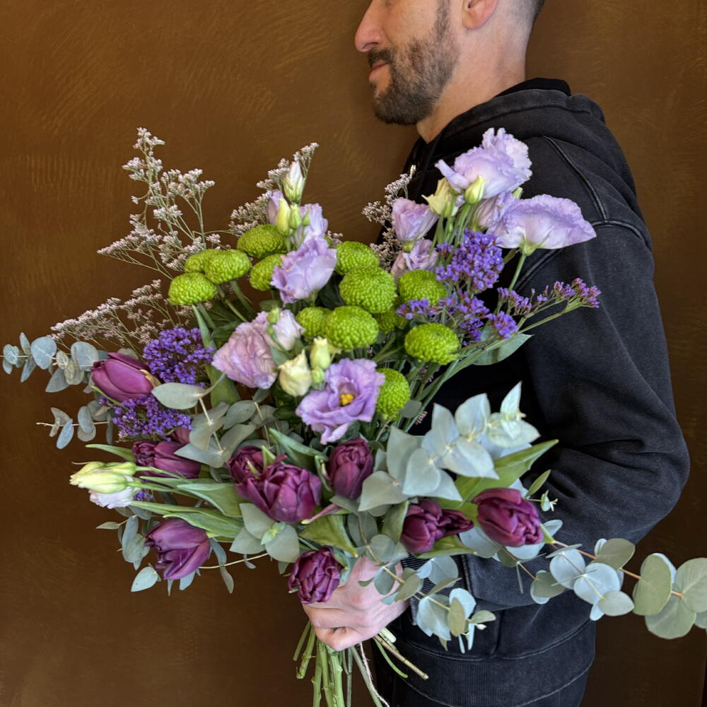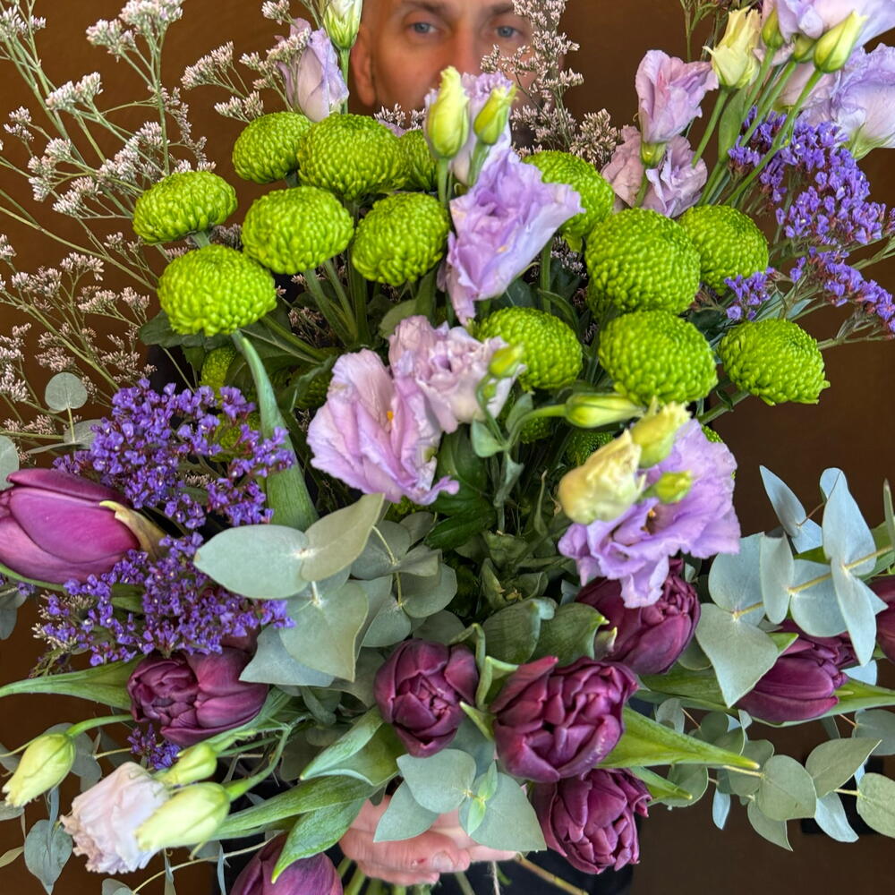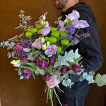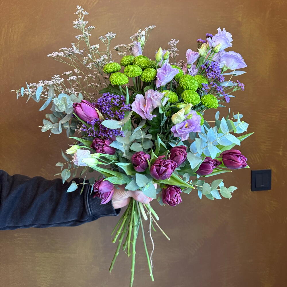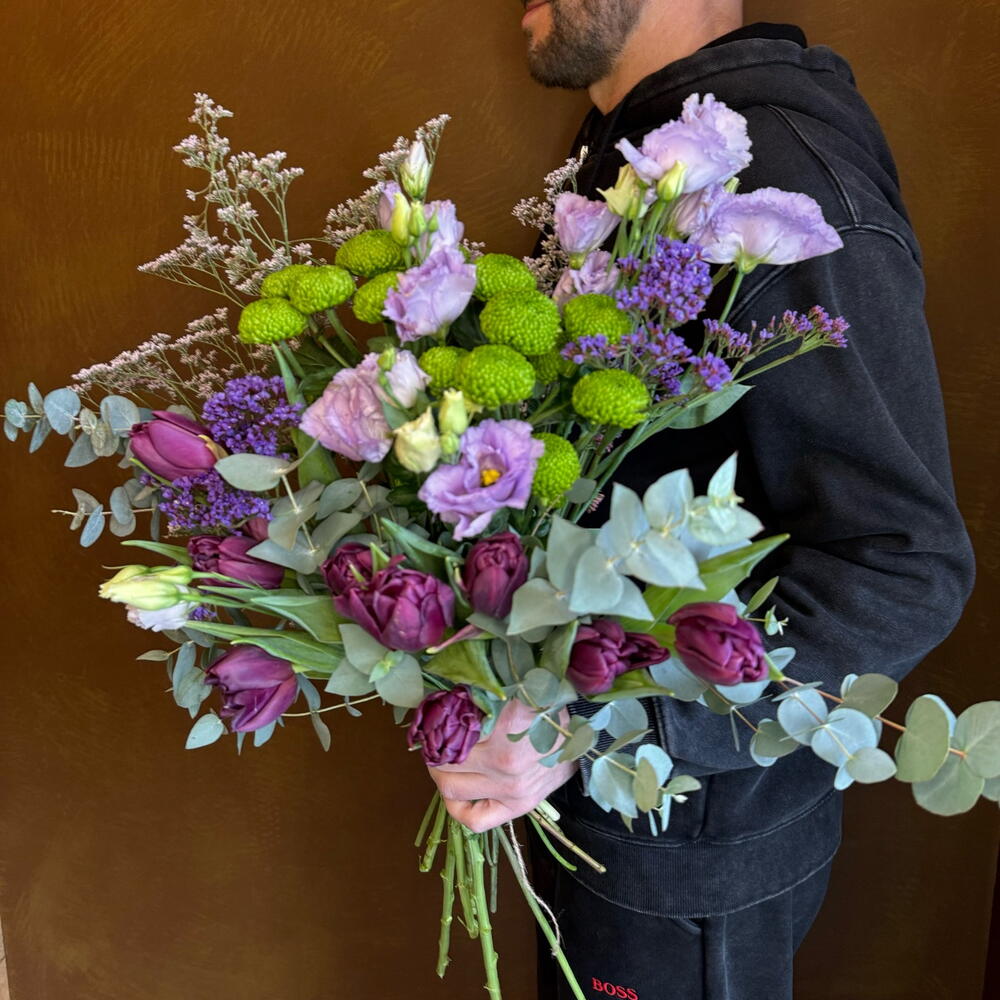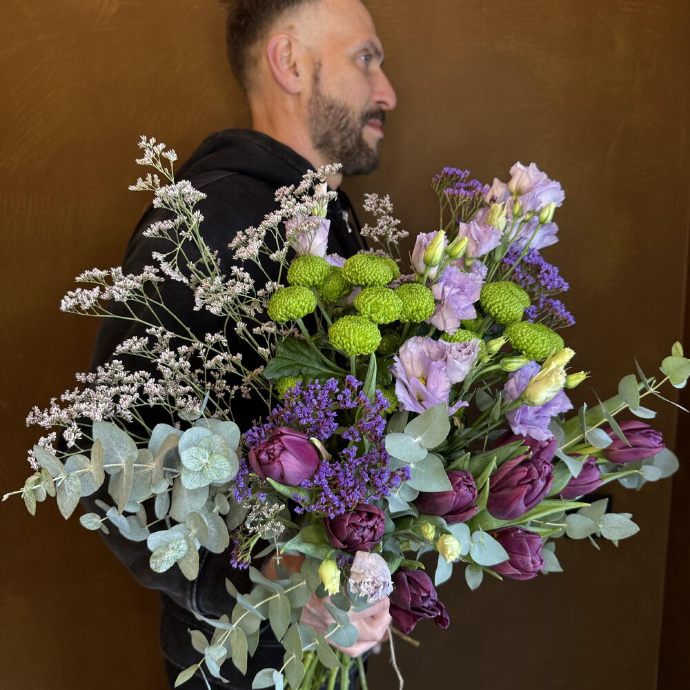 Лента атласная - 1 шт. Лимониум Микс - 3 шт. Хризантема кустовая зеленая пуговка - 2 шт. Эвкалипт Цинерея - 3 шт. Средство для продления жизни цветов - 1 шт. упаковка транспортировочная - 1 шт. октрыточка с вашими пожеланиями - 1 шт. упаковка матовая корейская пленка - 1 шт. тюльпан пионовидный сливовый - 9 шт. лизиантус эустома фиолетовый - 3 шт.
