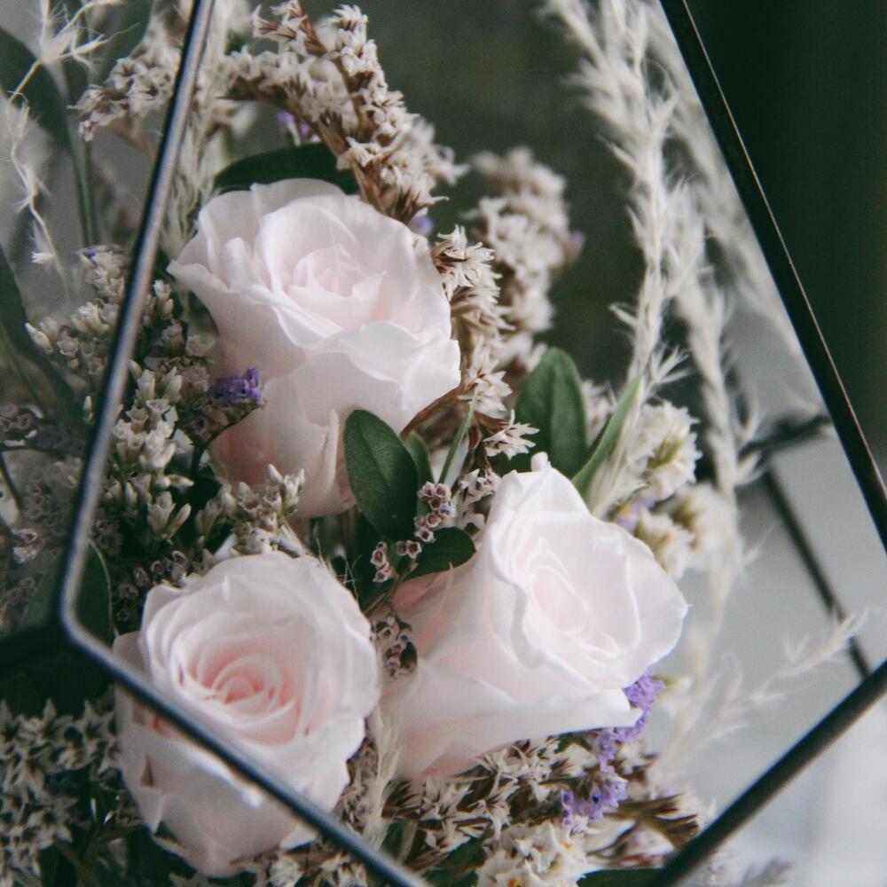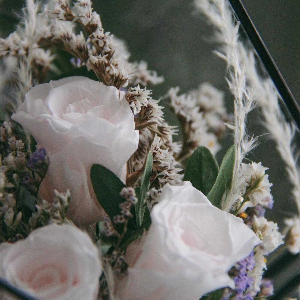 Роза стабилизированная - 3 шт. Эвкалипт сухоцвет - 5 шт. лимониум сиреневый сухоцвет - 10 шт. лимониум белый сухоцвет - 5 шт. эулалия сухоцвет - 5 шт.