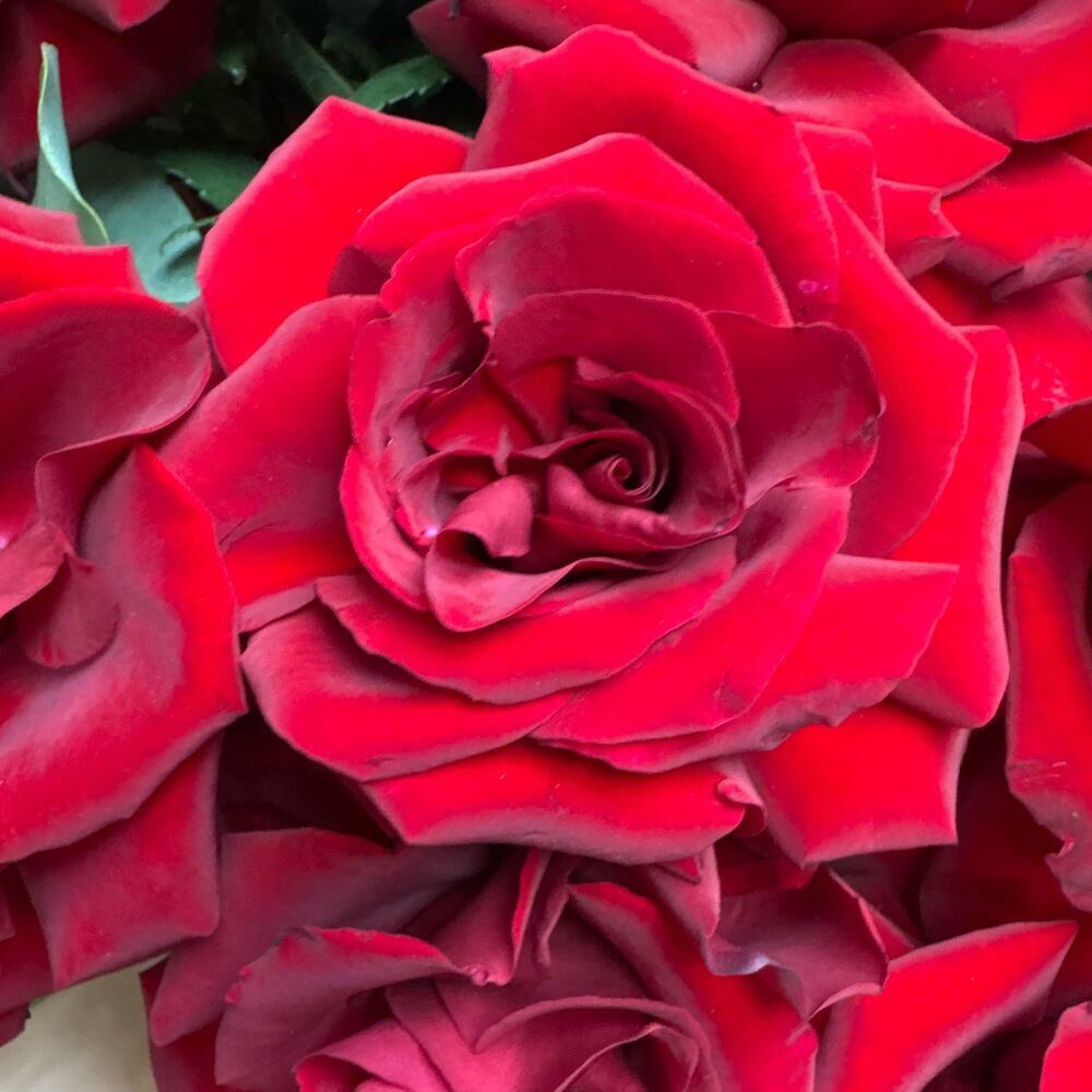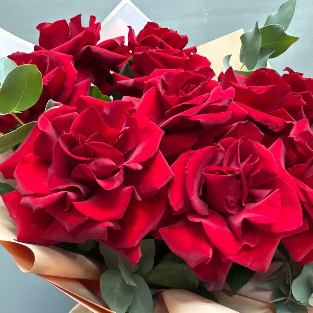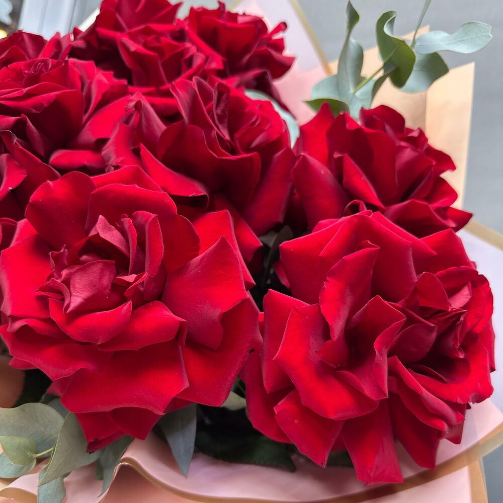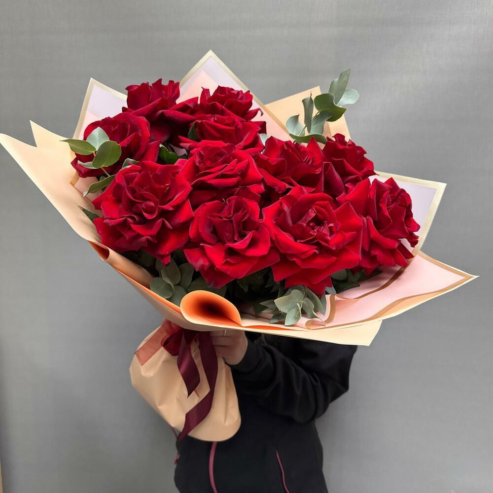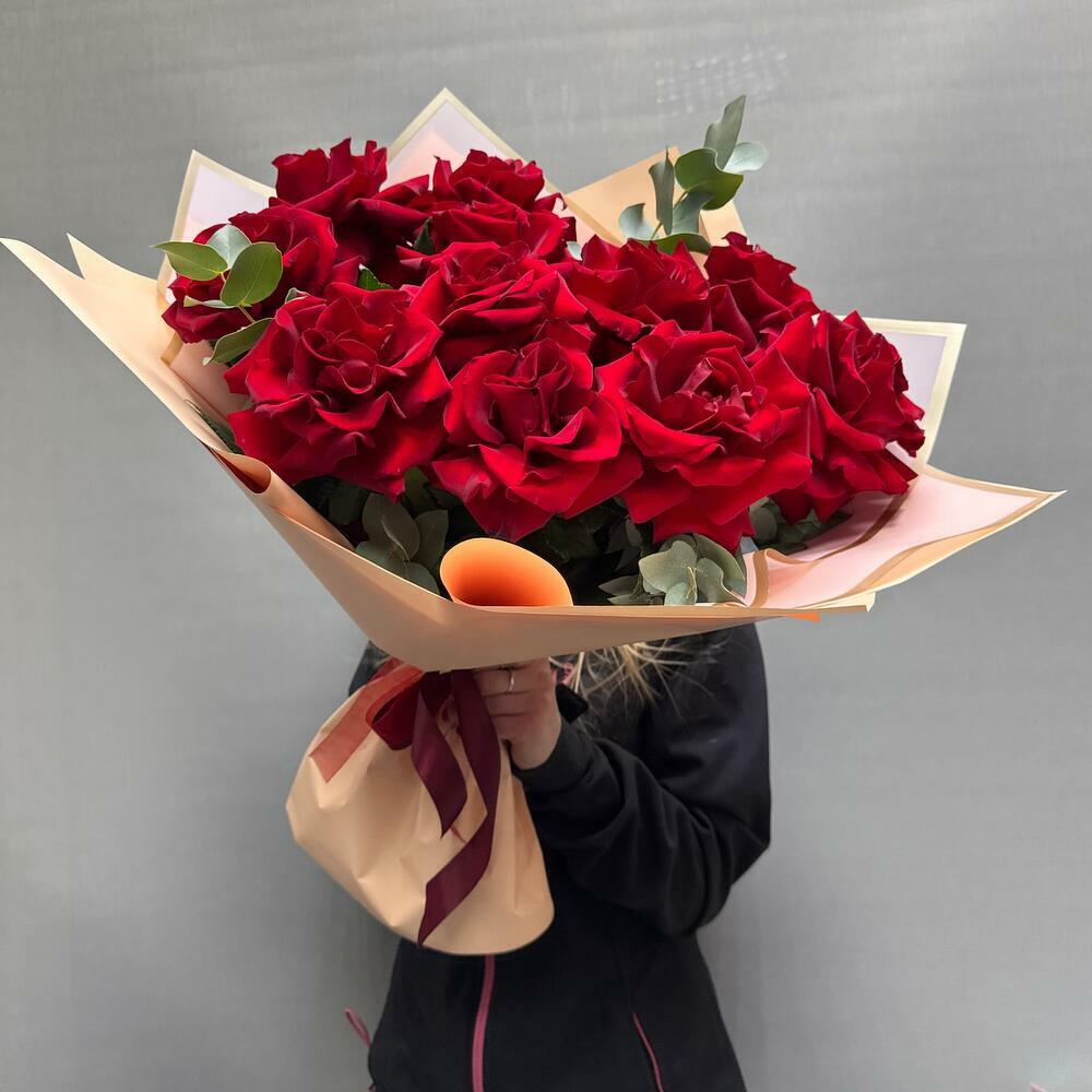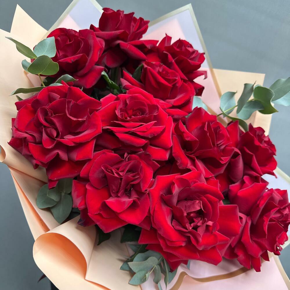 Французские красные розы с эвкалиптом