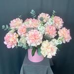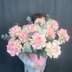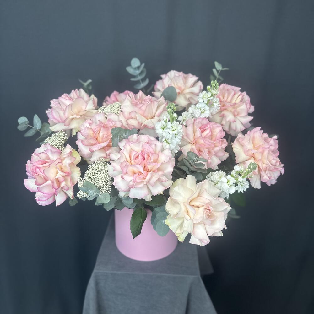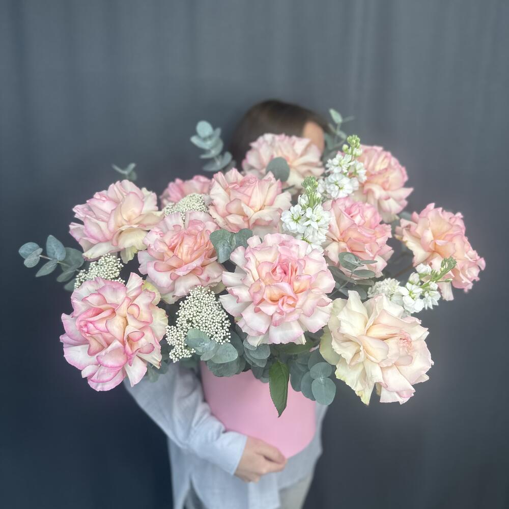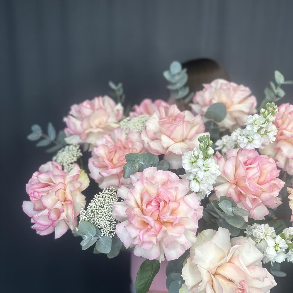 Маттиола - 3 шт. Эвкалипт - 4 шт. Коробка шляпная - 1 шт. Озотамнус Белый - 3 шт. Оазис флористический - 3 шт. Эквадор роза - 11 шт.