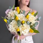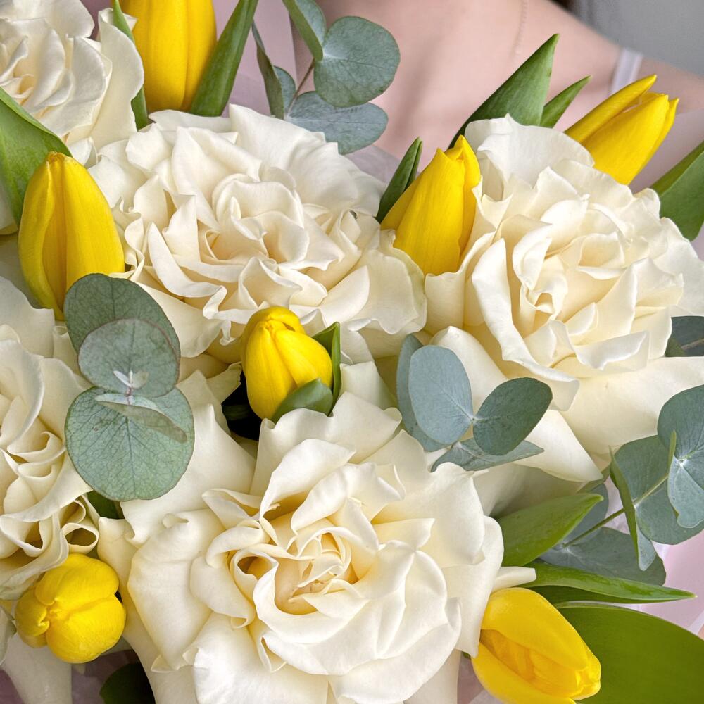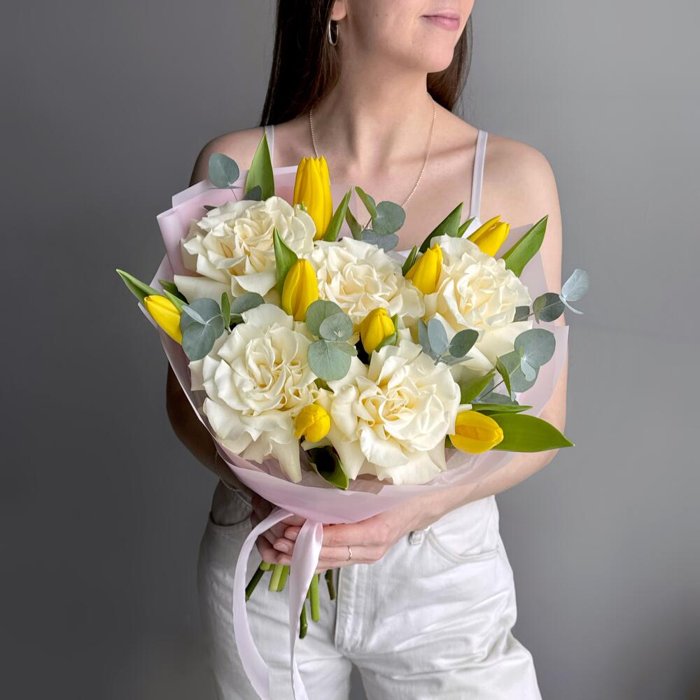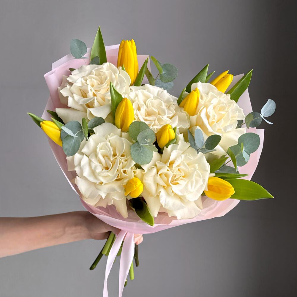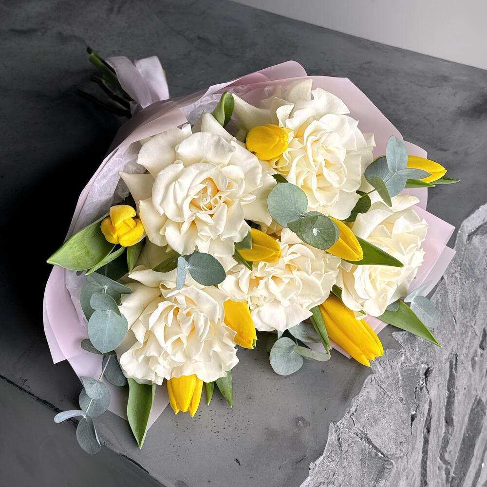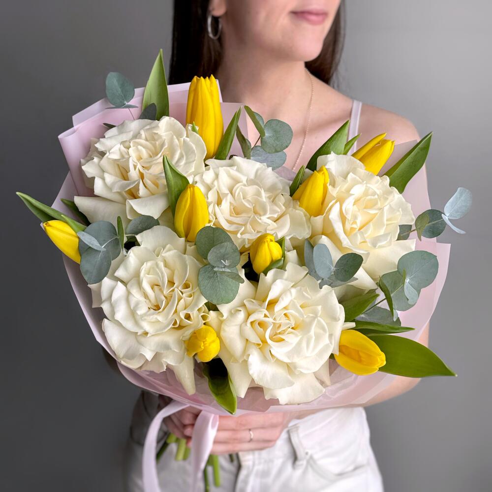 Французские розы и желтые тюльпаны с эвкалиптом нежный букет