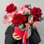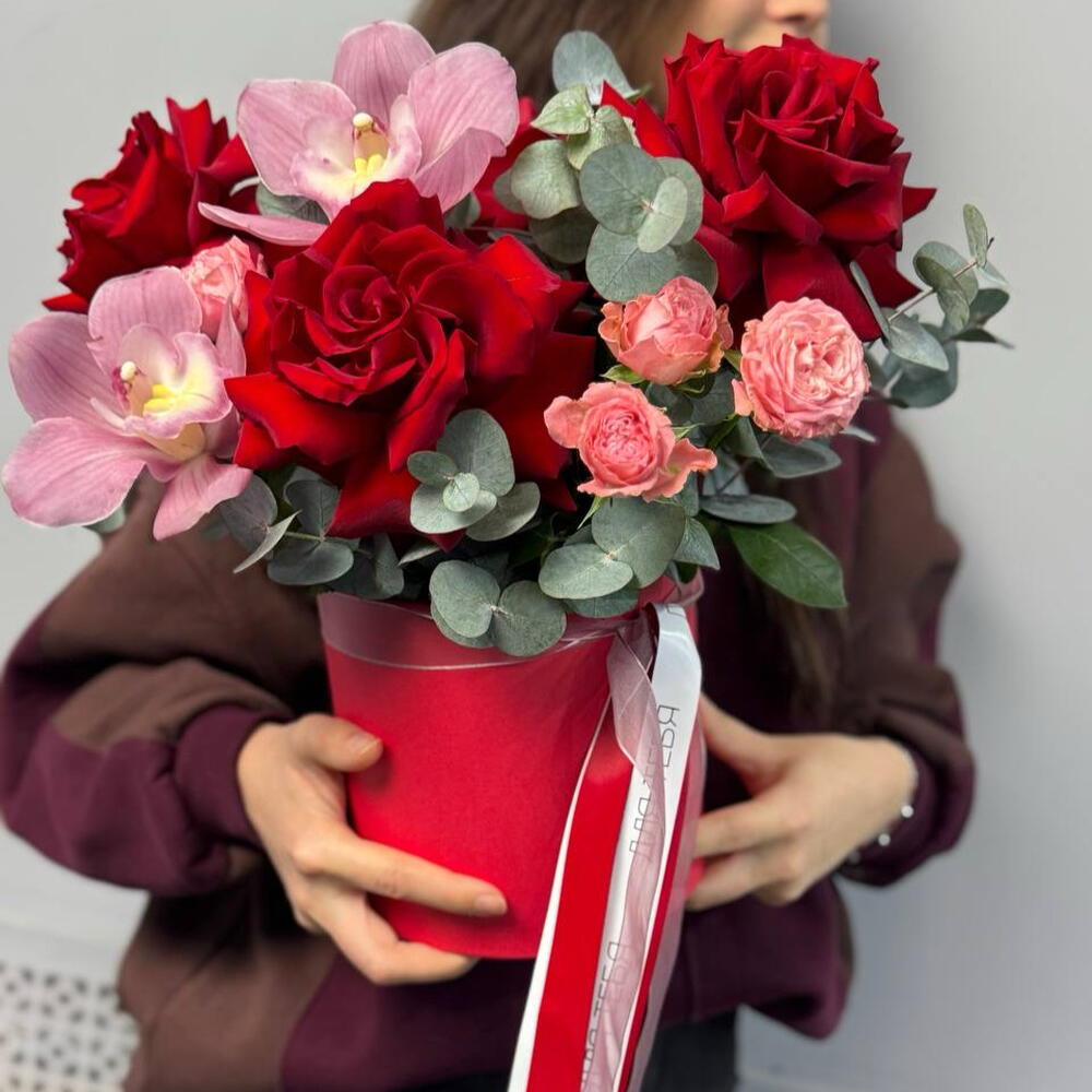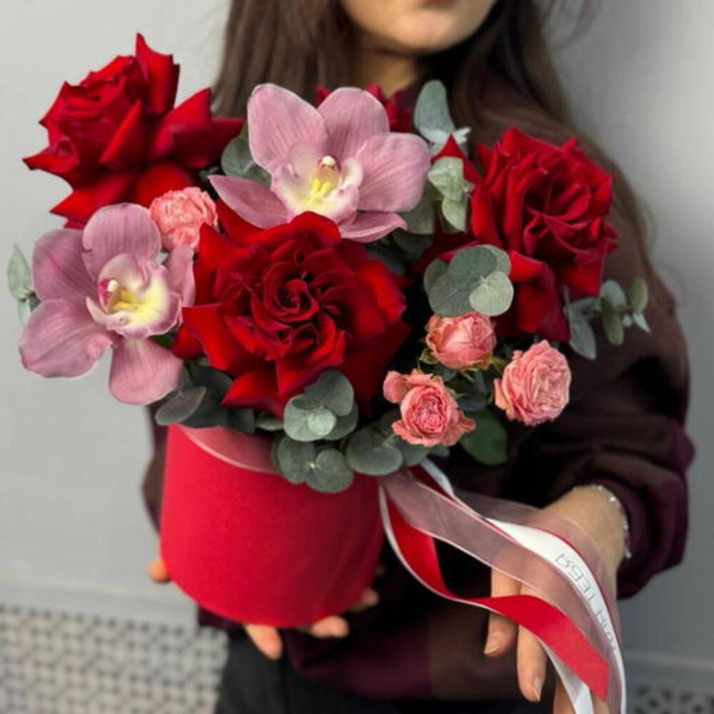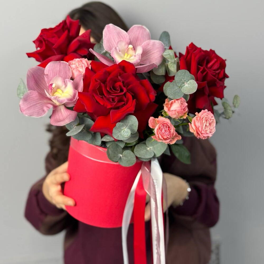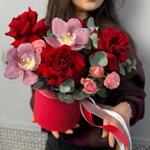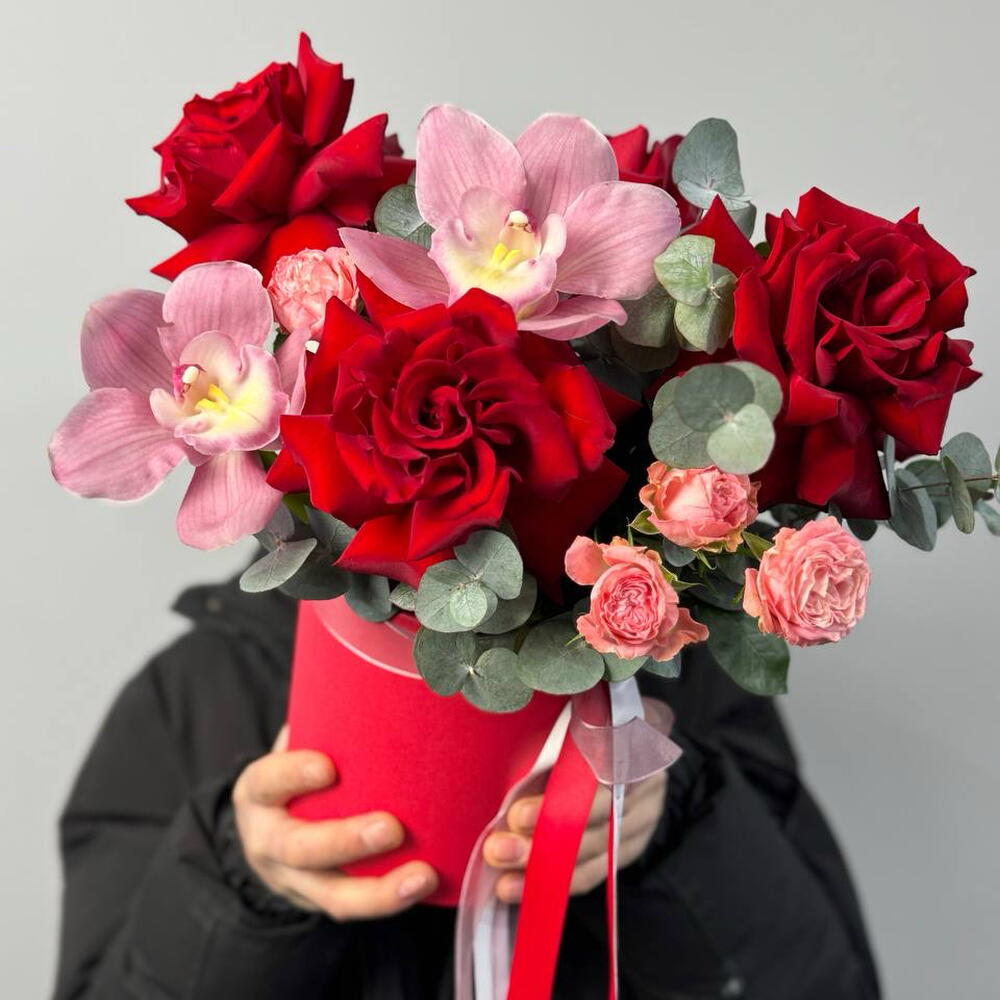 Эвкалипт - 10 шт. Кустовая роза - 1 шт. Лента атласная - 2 шт. Коробка шляпная - 1 шт. Оазис флористический - 1 шт. орхидеи цимбидиум - 2 шт. французские розы - 3 шт.