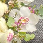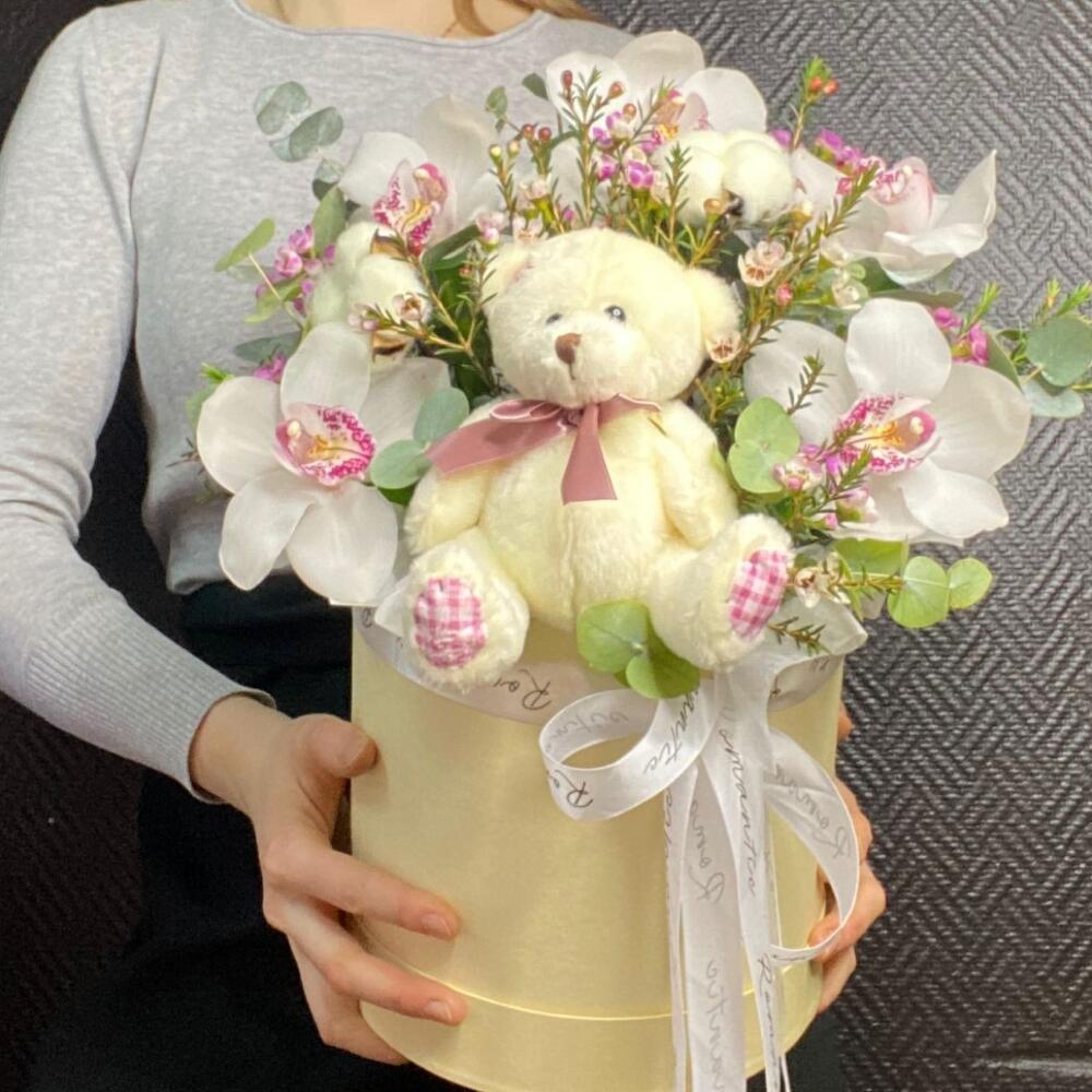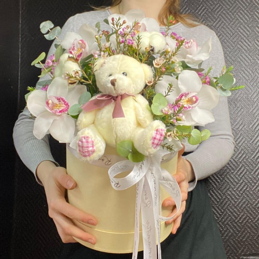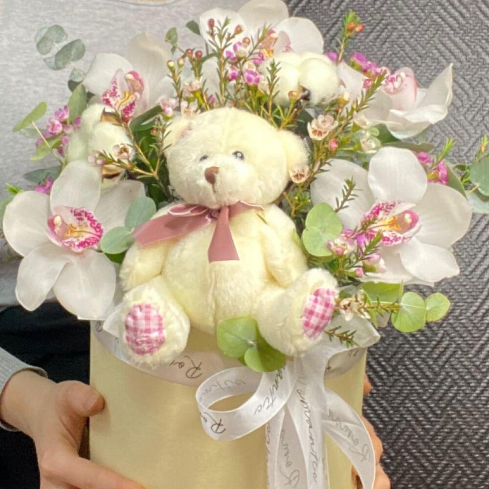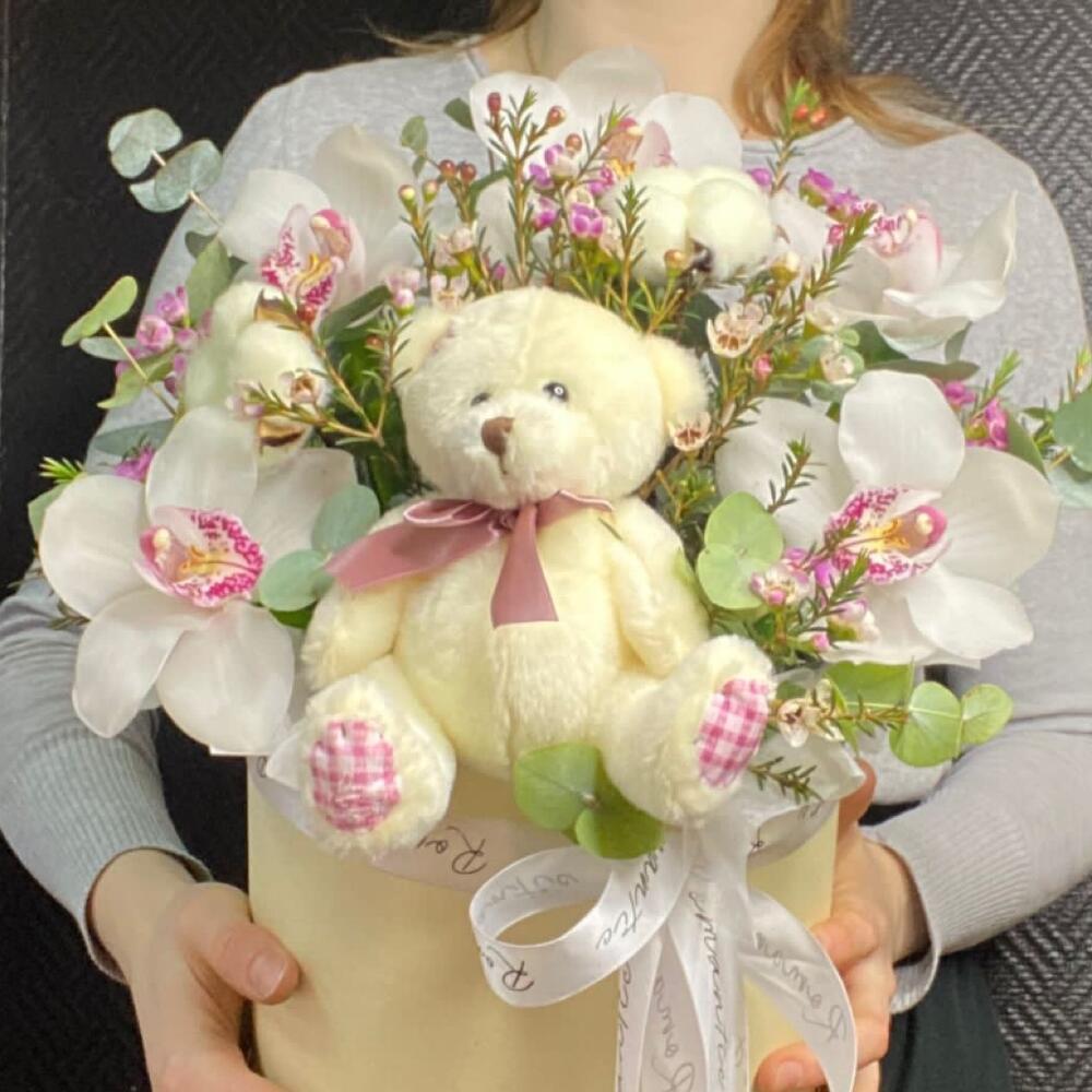 Ваксфлауэр - 2 шт. Орхидея Цимбидиум - 5 шт. Зелень - 1 шт. Лента атласная - 1 шт. Коробка шляпная - 1 шт. Медведь плюшевый - 1 шт. Оазис флористический - 1 шт. Эвкалипт Baby Blue - 1 шт.
