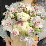 Весенняя композиция с ароматными орхидеями и плюшевым медведем , приятно удивит вашу избранницу , а так же можно подарить коллеги . Порадуйте своих родных и близких .