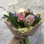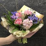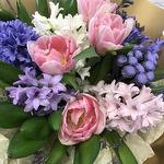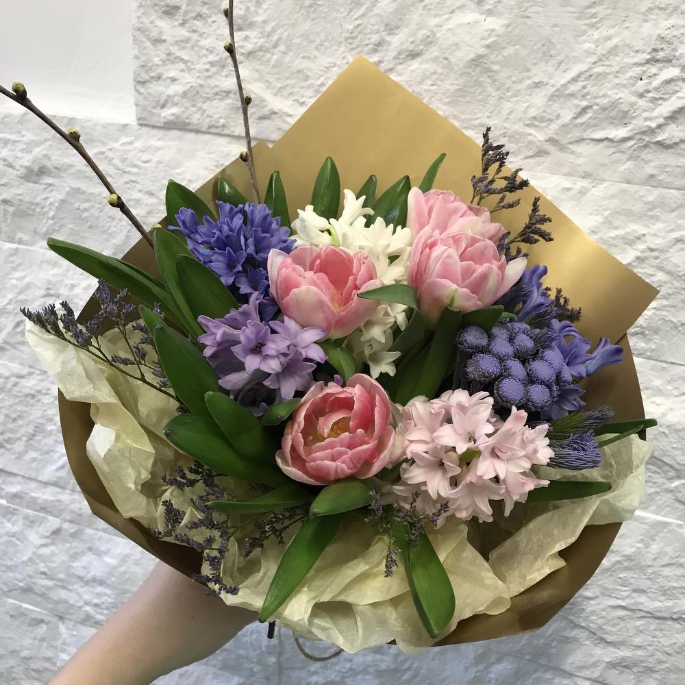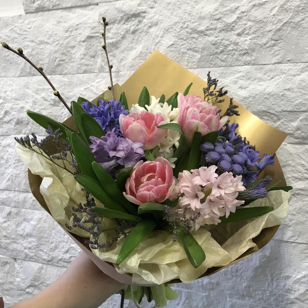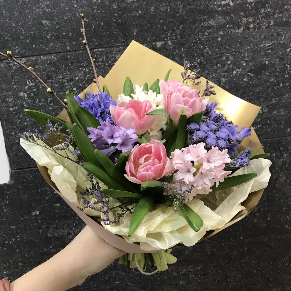 Гиацинт - 5 шт. Лимониум - 1 шт. Тюльпан - 4 шт. берзелия ланугиноса синяя - 1 шт. Прунус - 1 шт. упаковка дизайнерская матовая - 2 шт.