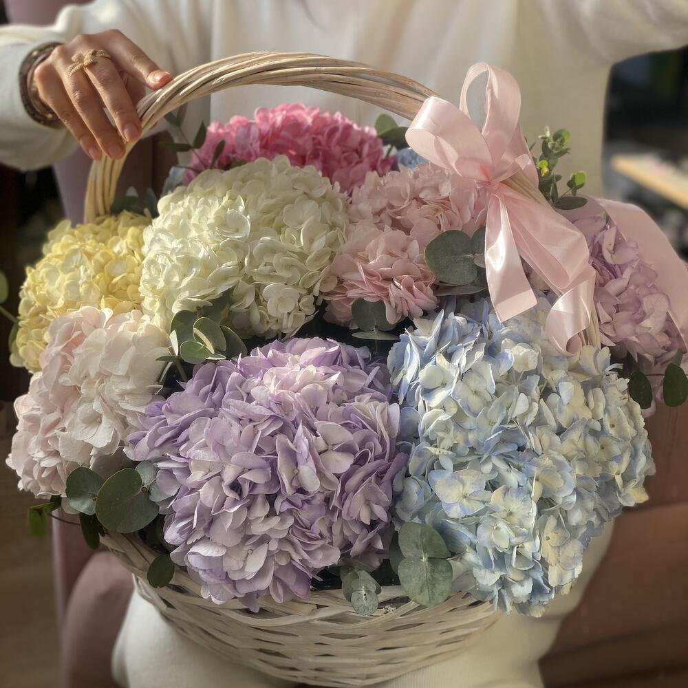 Гортензия - 11 шт. Эвкалипт - 15 шт. Корзина плетеная - 1 шт. Оазис флористический - 2 шт.