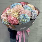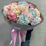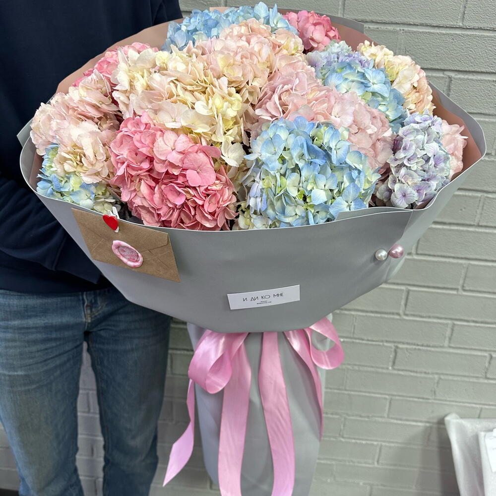 Гортензия - 15 шт. Лента атласная - 1 шт. Дизайнерская упаковка - 1 шт. аквабокс с водой - 1 шт.