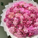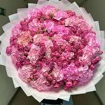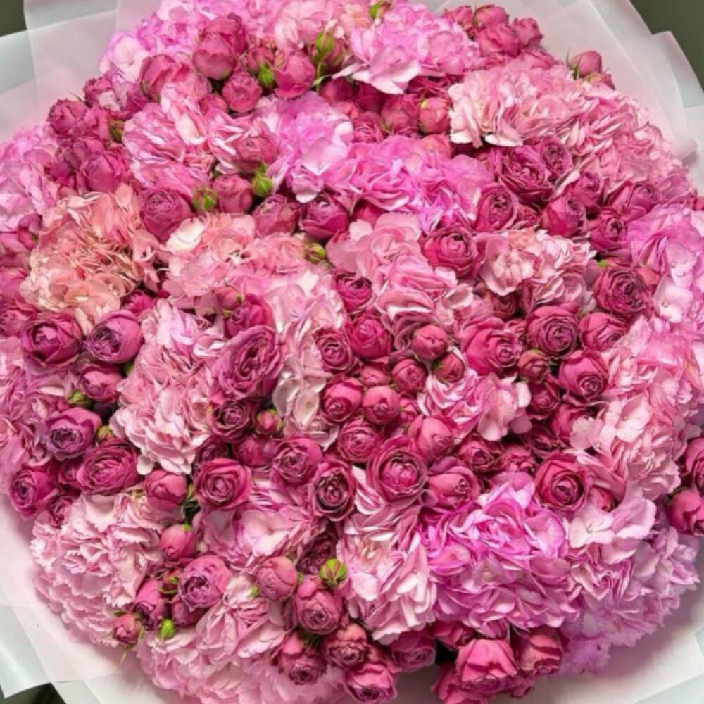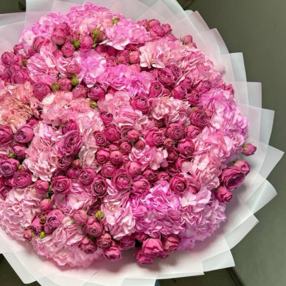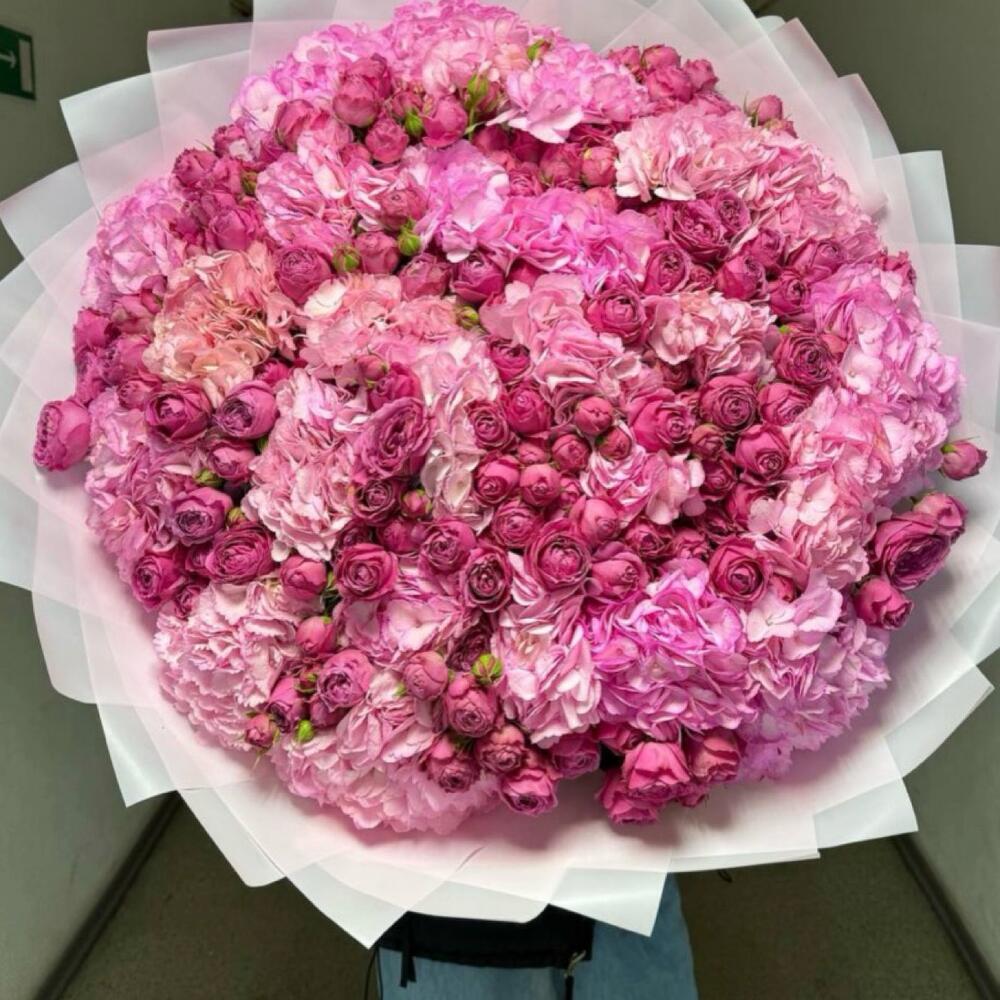 Лента атласная - 1 шт. Кустовая пионовидная роза - 10 шт. Гортензия розовая - 15 шт. Дизайнерское оформление - 1 шт. букетная записка - 1 шт.