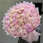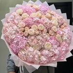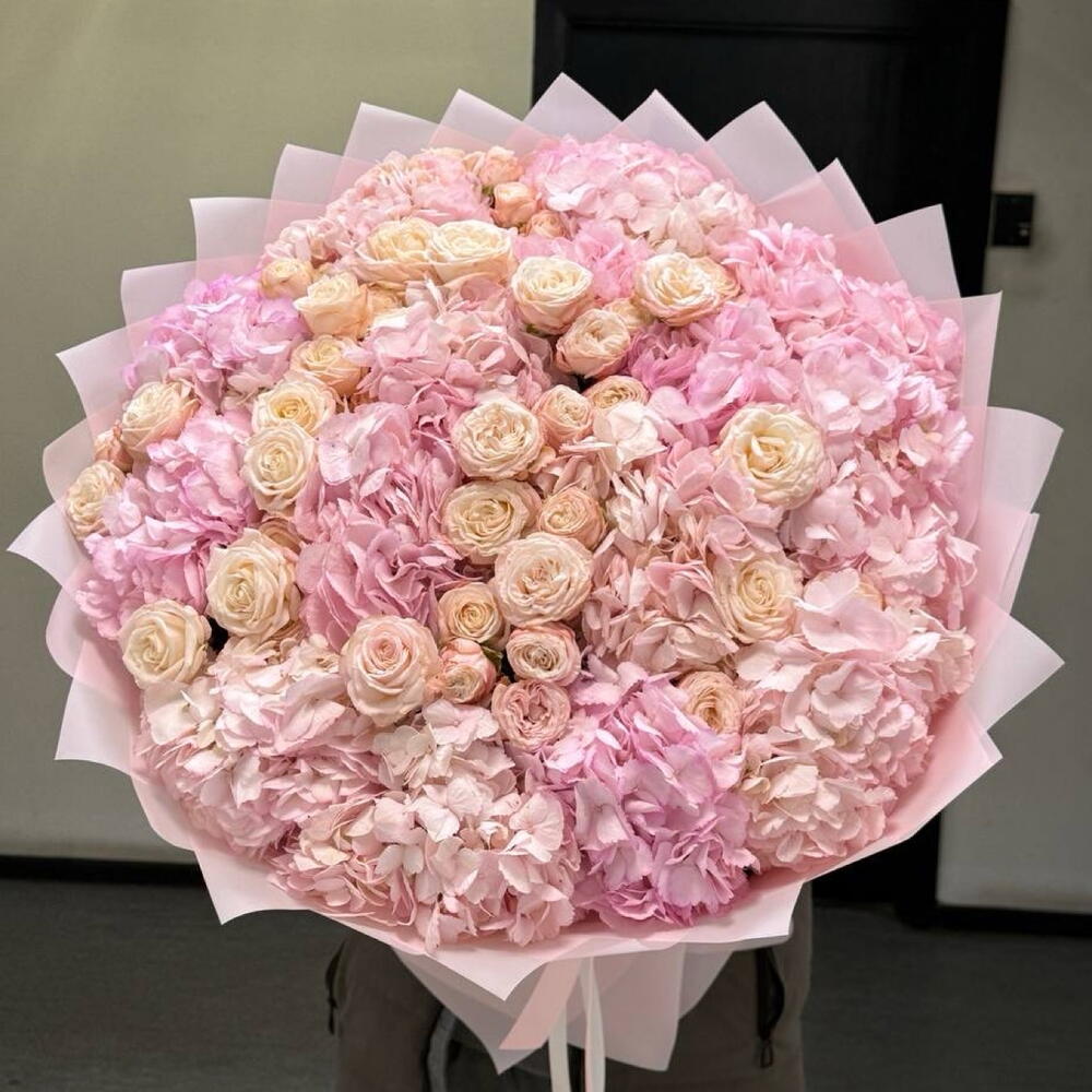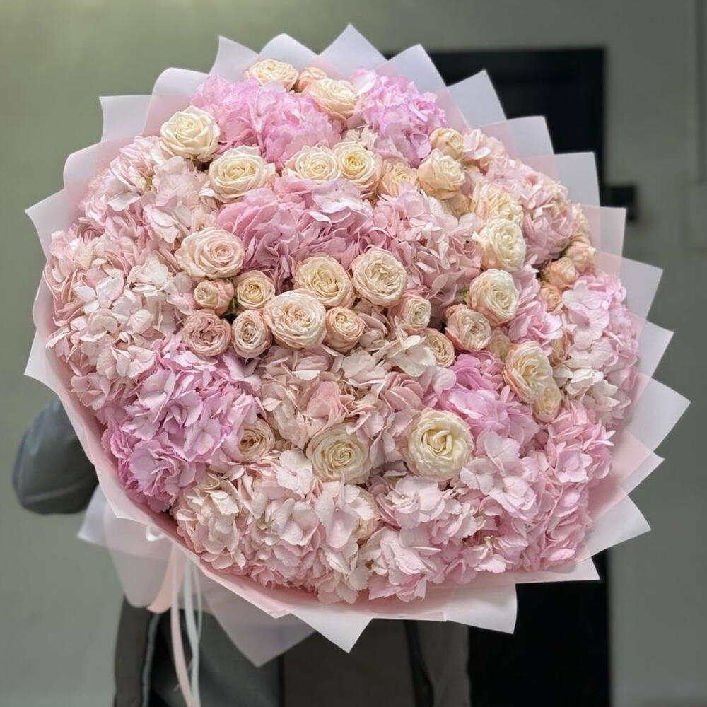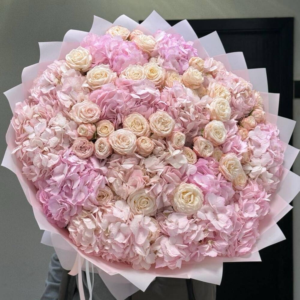 Лента атласная - 1 шт. Гортензия розовая - 15 шт. Кустовая роза пионовидная - 10 шт. Дизайнерское оформление - 1 шт. букетная записка - 1 шт.
