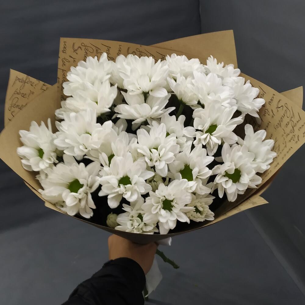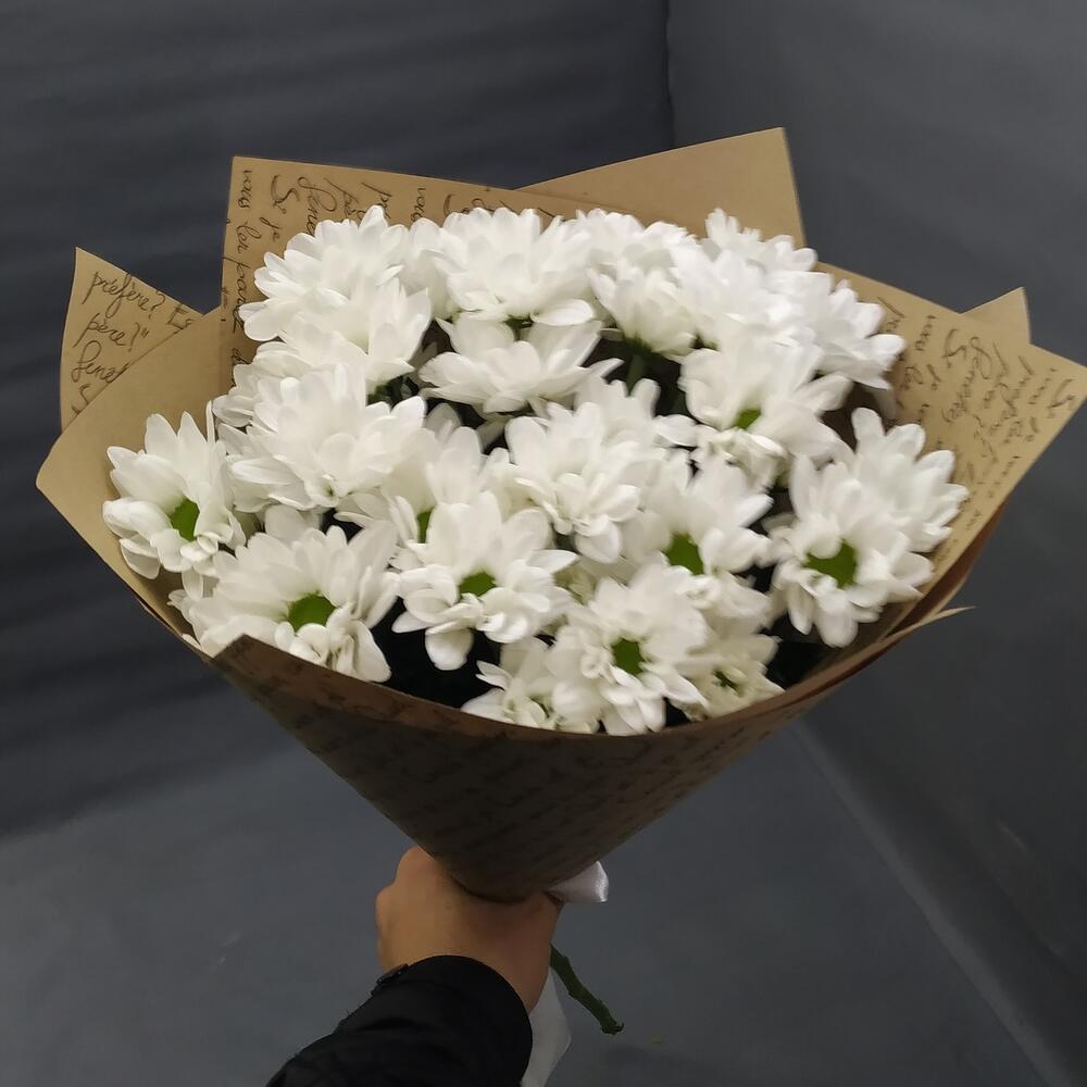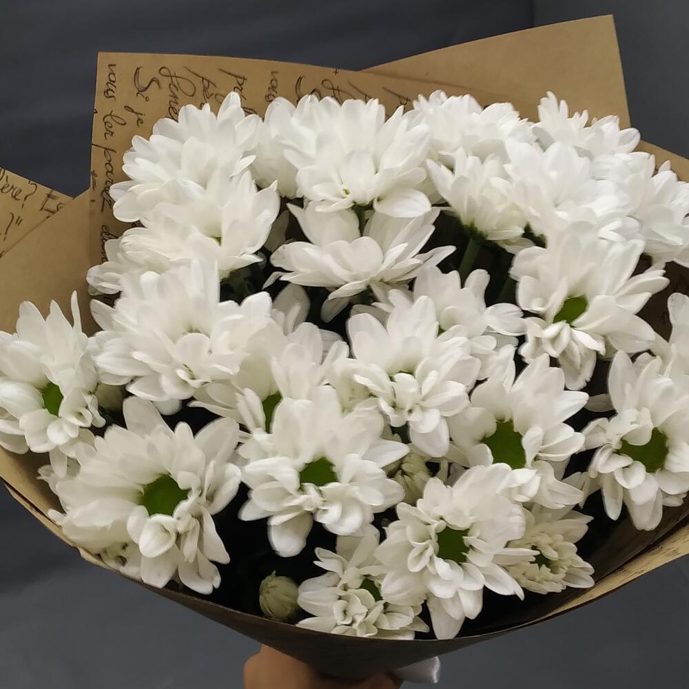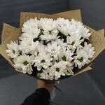 Лента атласная - 1 шт. Хризантема кустовая Белая - 5 шт. Крафт упаковка - 3 шт.