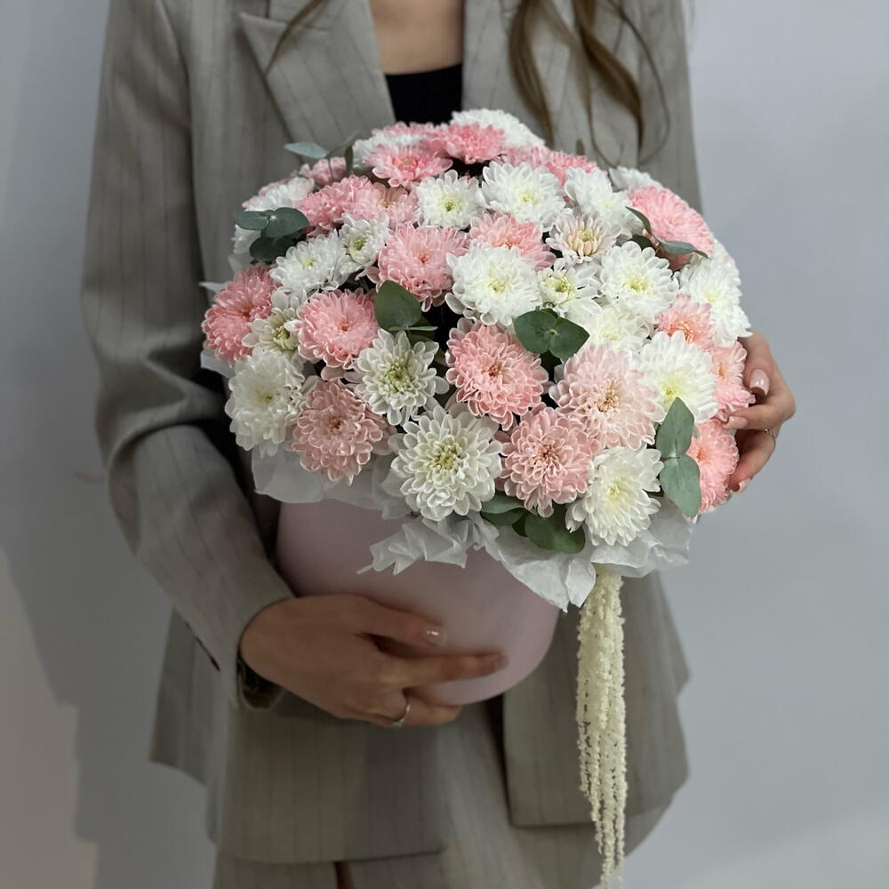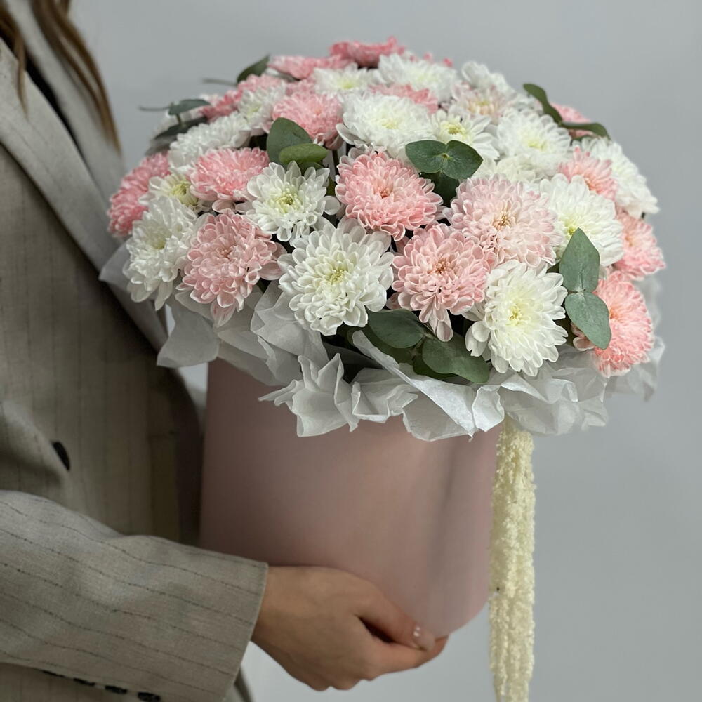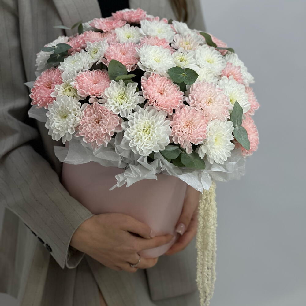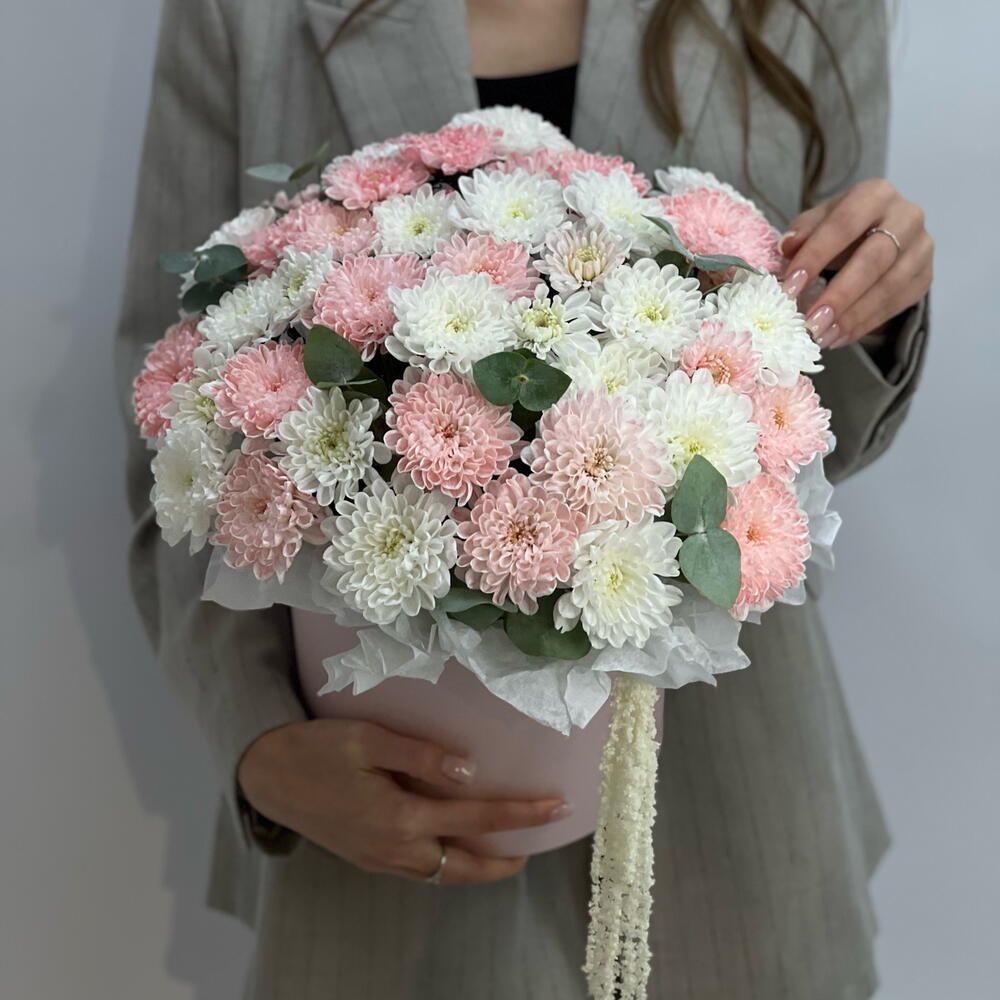 Эвкалипт - 1 шт. Коробка шляпная - 1 шт. Хризантема кустовая Белая - 3 шт. Открыточка с вашими пожеланиями - 1 шт. Оазис флористический - 1 шт. Тишью белое - 2 шт. хризантема кустовая персиковая - 4 шт. амарант стабилизированный - 1 шт.