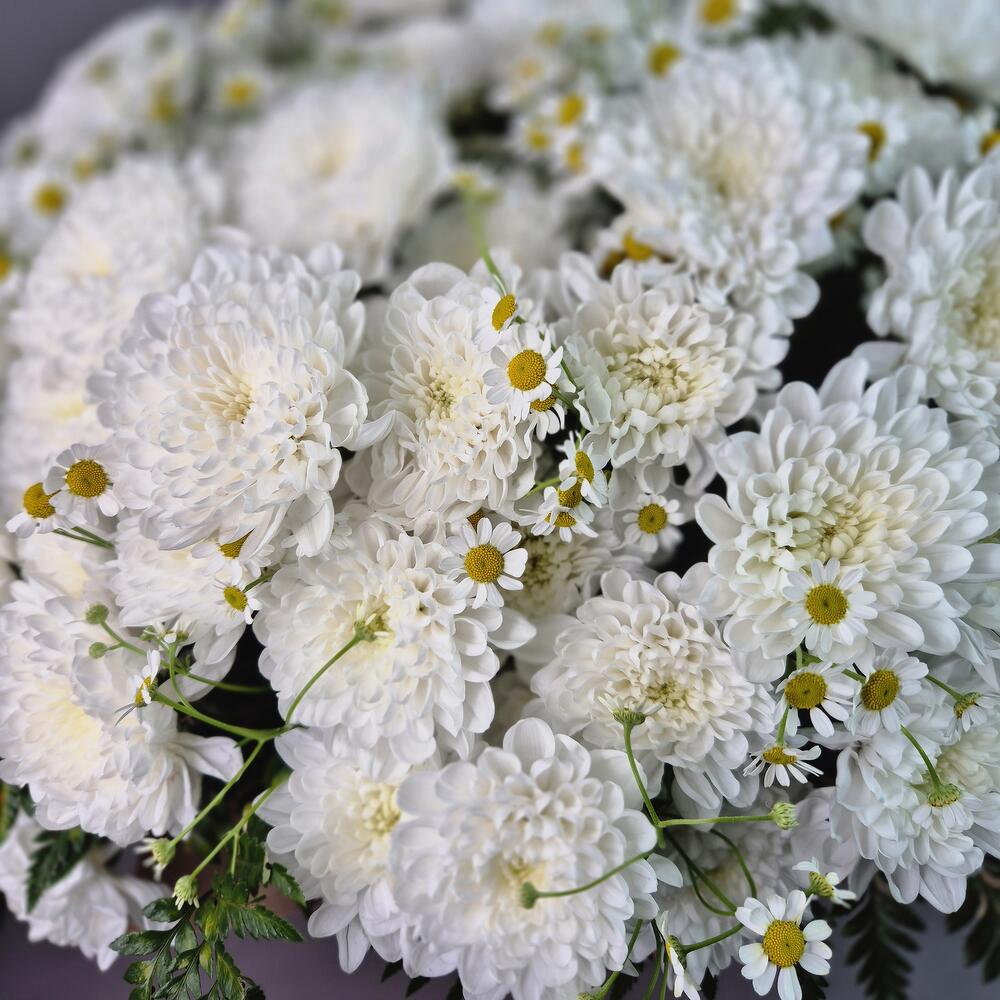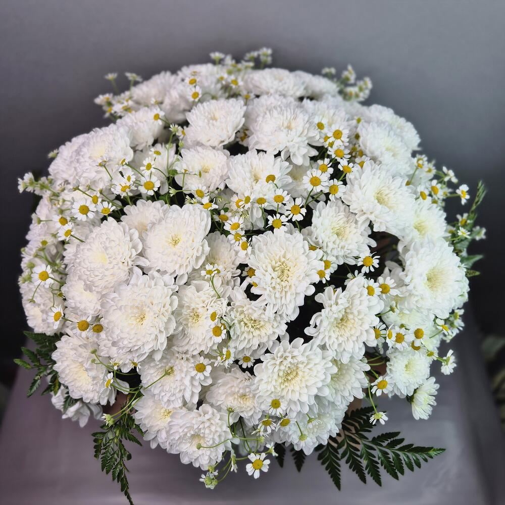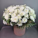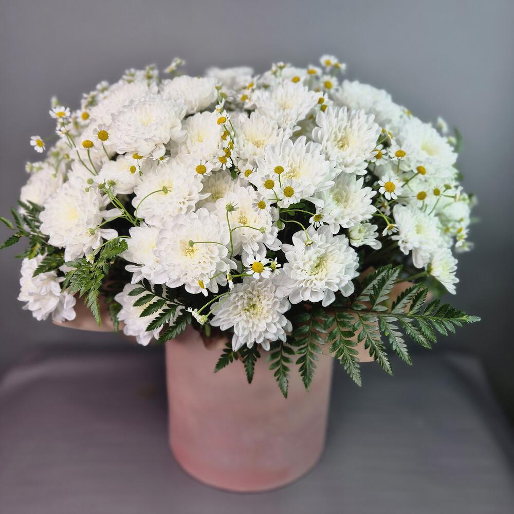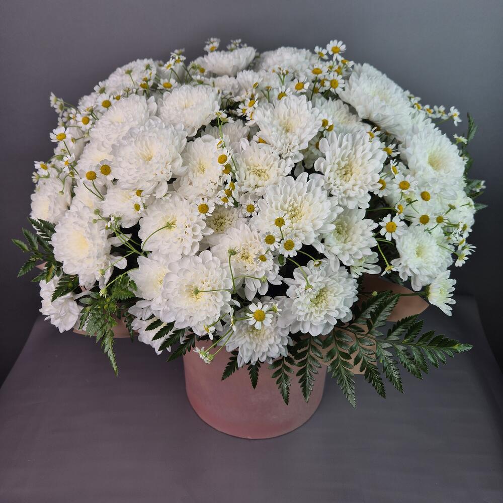 Папоротник - 6 шт. Хризантема кустовая - 15 шт. Коробка шляпная - 1 шт. Матрикария - 10 шт.