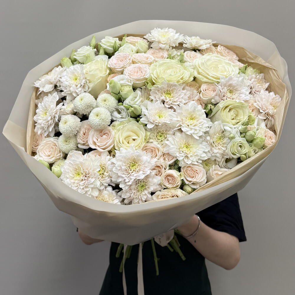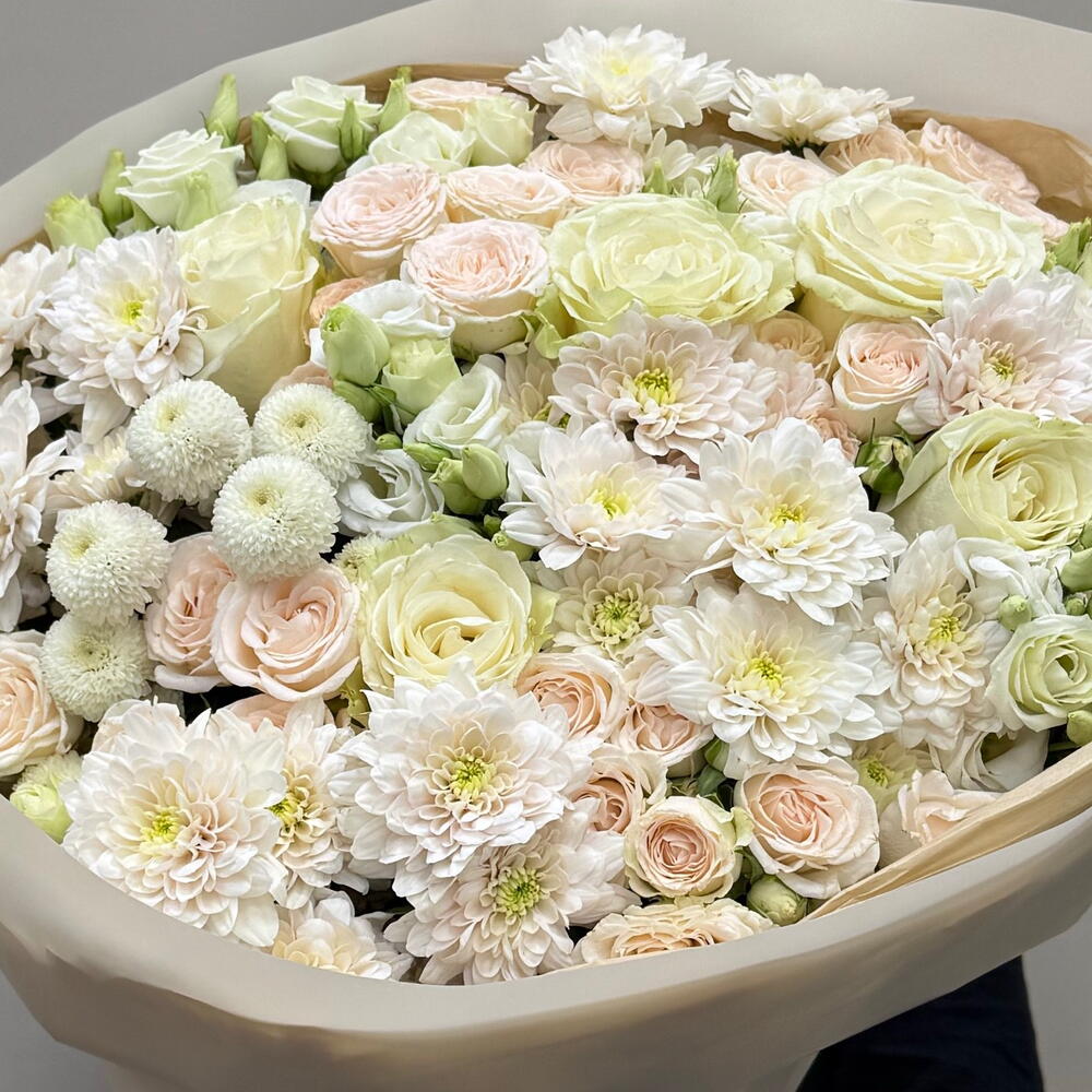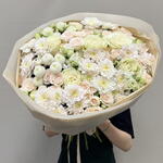 Хризантема Ньютон, кустовая Роза Соня, Пастела Пинк, эустома белая, Одноголовая Роза | огромный авторский сборный букет