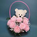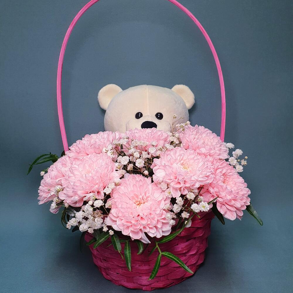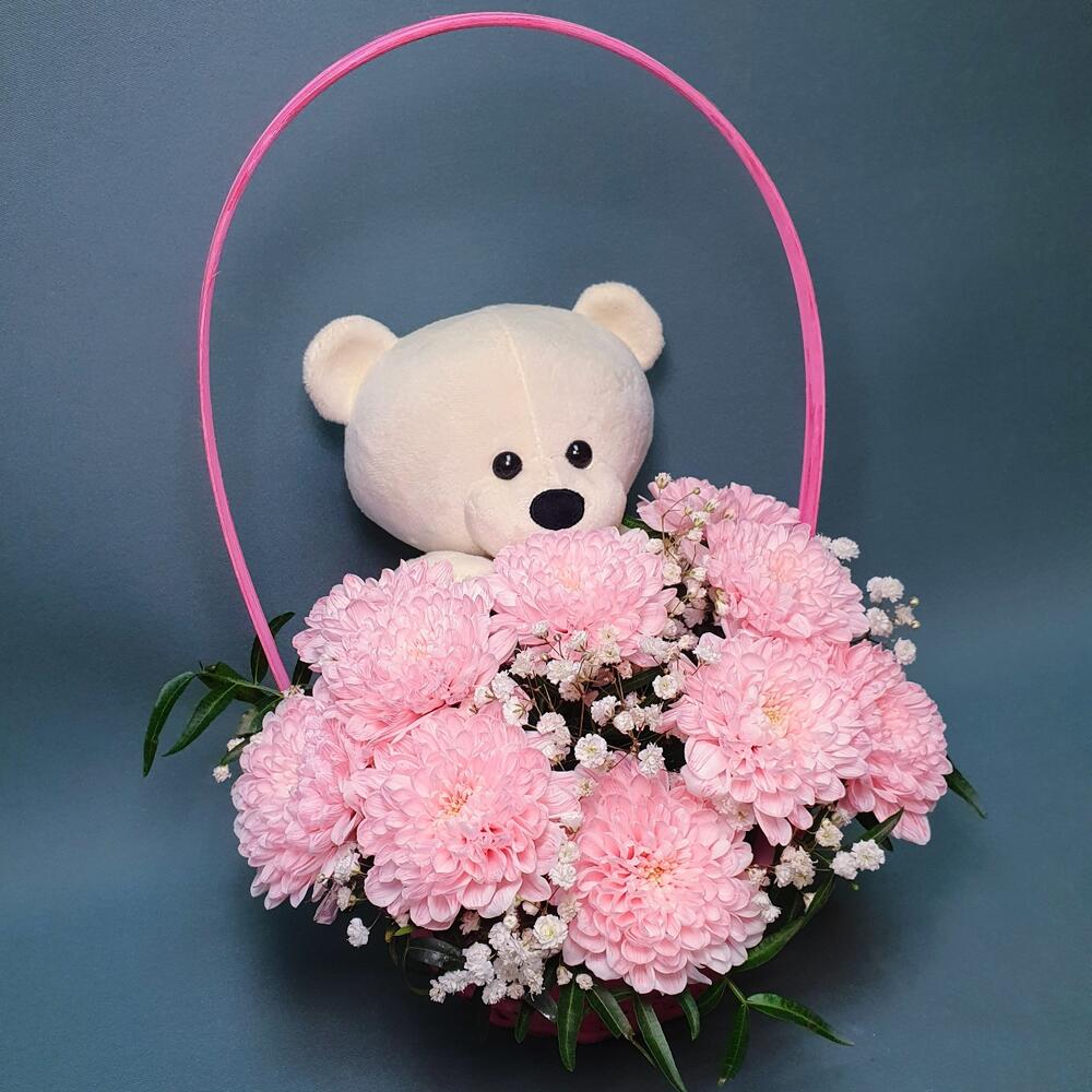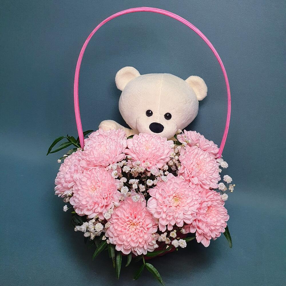 Гипсофила - 1 шт. Хризантема кустовая - 1 шт. Оазис - 1 шт. Фисташка - 1 шт. Игрушка медвежонок - 1 шт. корзинка - 1 шт.