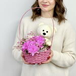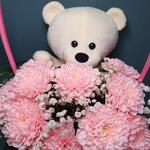 Хризантема в корзинке с медвежонком, дополнительно наполненная гипсофилой и фисташкой на флористической губке пропитанной водой, очень удобный вариант для подарка, так как не требует вазы с водой, можно подарить и не переживать за цветы. Такая композиция Отличный вариант подарка маме❤️, как просто так, так и на самый нежный праздник - День Матери. День Матери не за горами, оформляйте заказы заранее, что бы быть уверенными, что вашей Маме приедут самые лучшие и свежие цветы! Медведь выполнен из качественных материалов Белорусского завода мягких игрушек, безопасных для детей, которого можно использовать отдельно от композиции. Уход за корзинкой: - если дома достаточно сухой воздух, доливать водичку в флористическую губку каждый день по немножку, по всему периметру губки. Радуйте своих любимых необычными композициями. С уважением, Цветов Букеты.