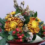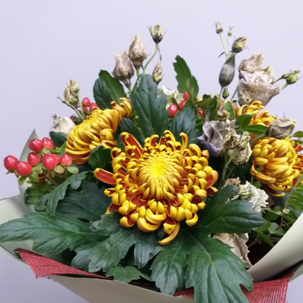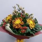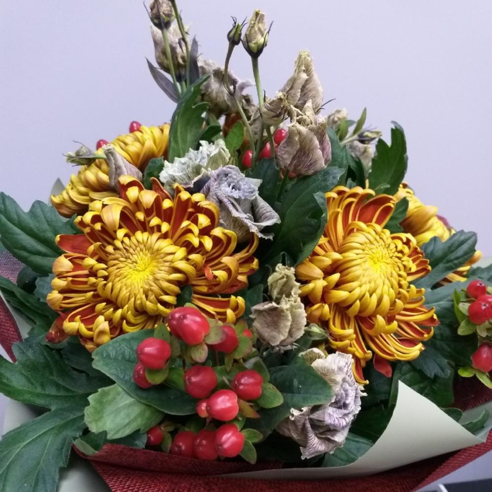 Гиперикум - 4 шт. Хризантема - 5 шт. Эустома - 3 шт. Фисташка - 2 шт.