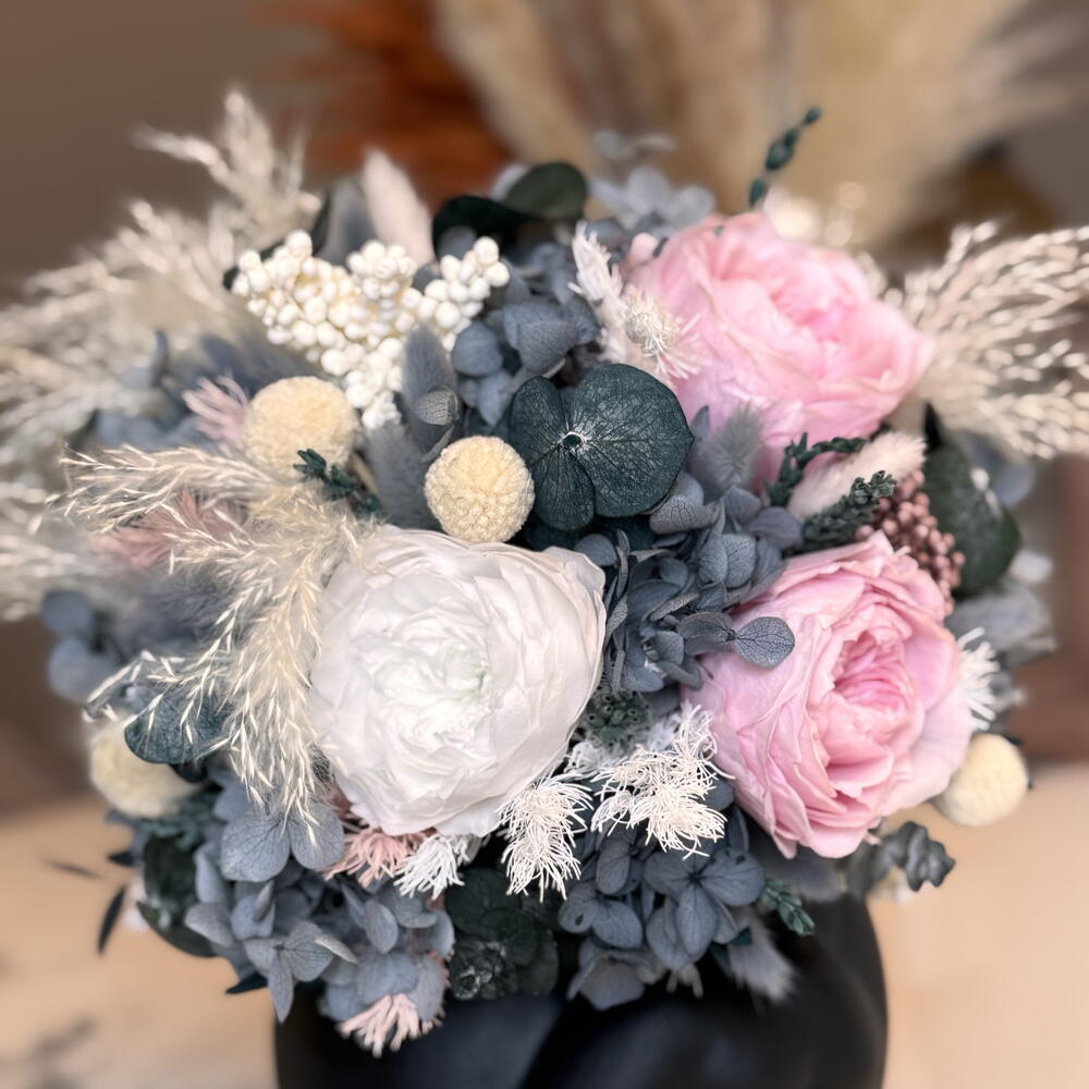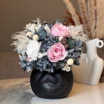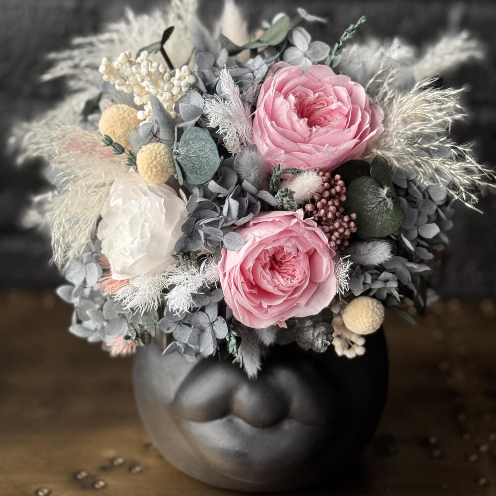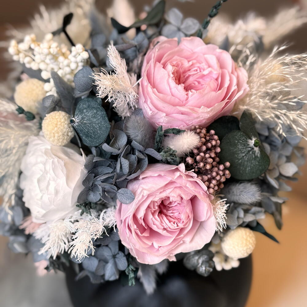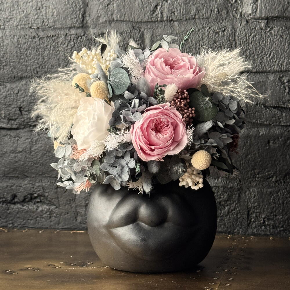 Интерьерная композиция в эффектном кашпо с живыми стабилизированными пионовидными розами