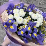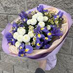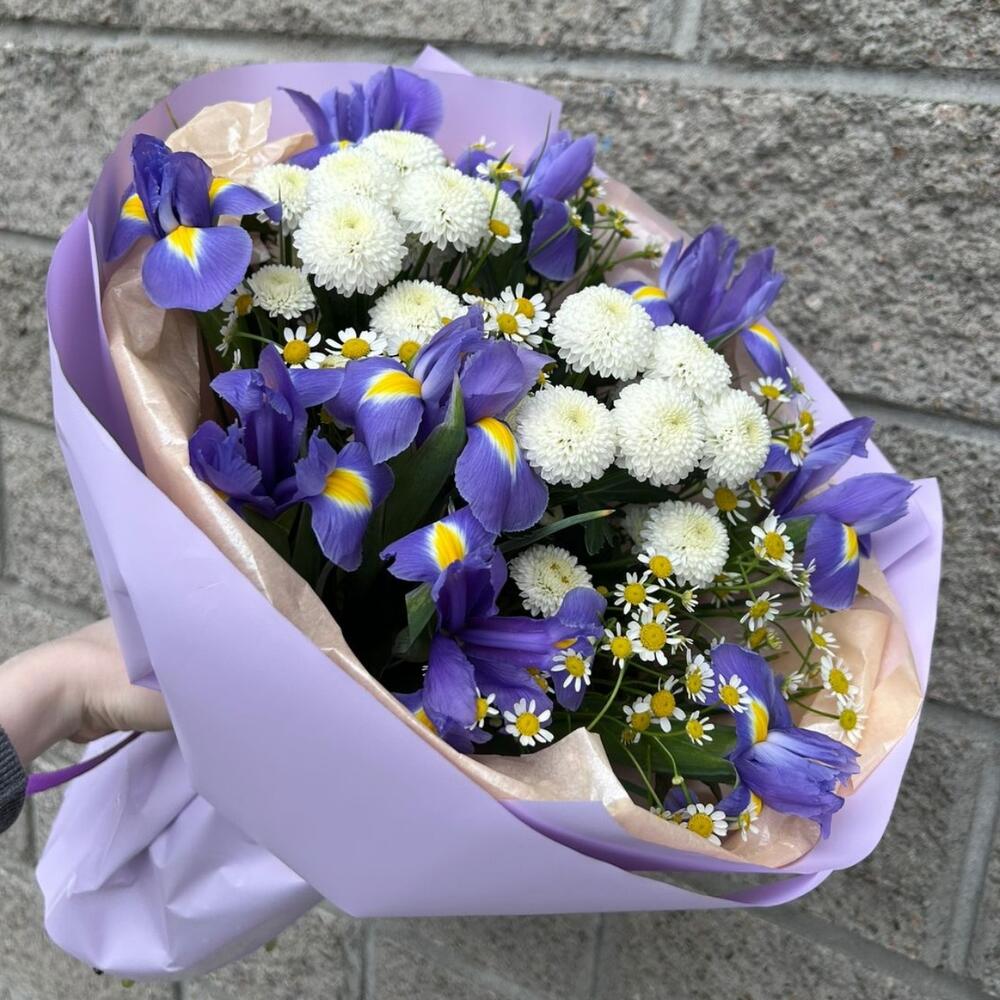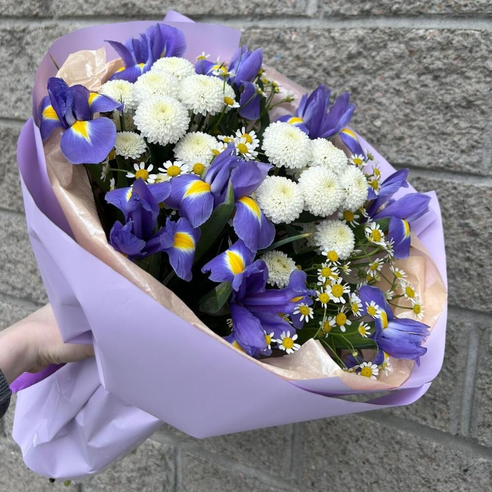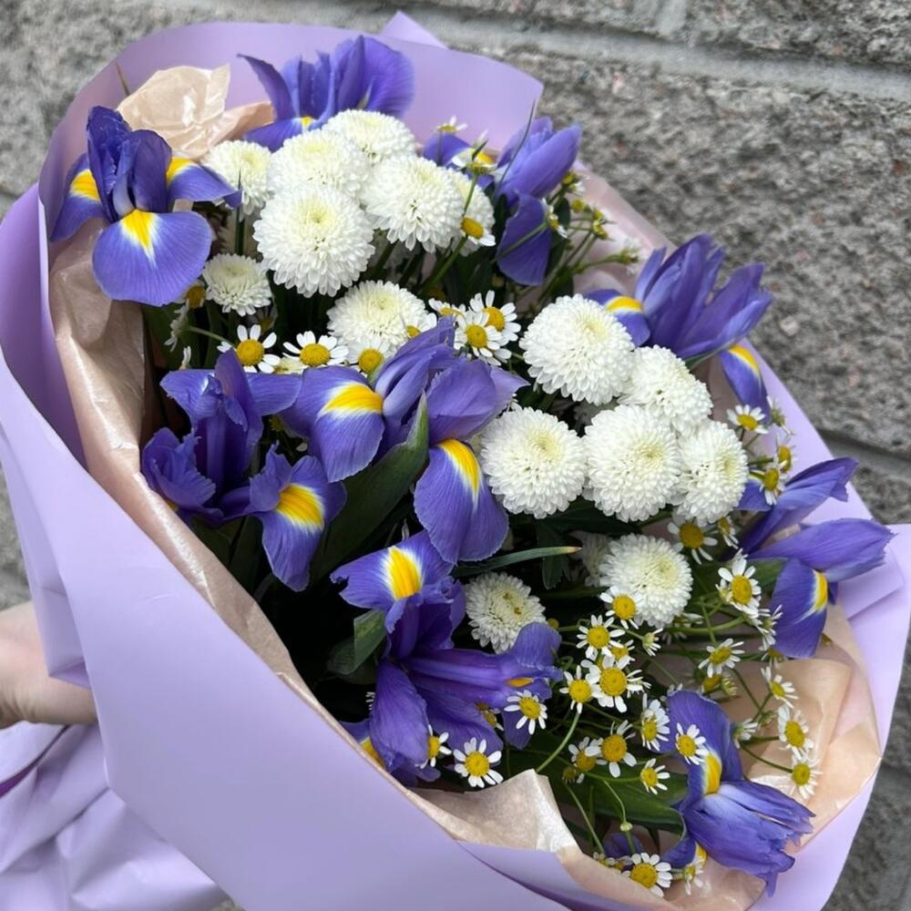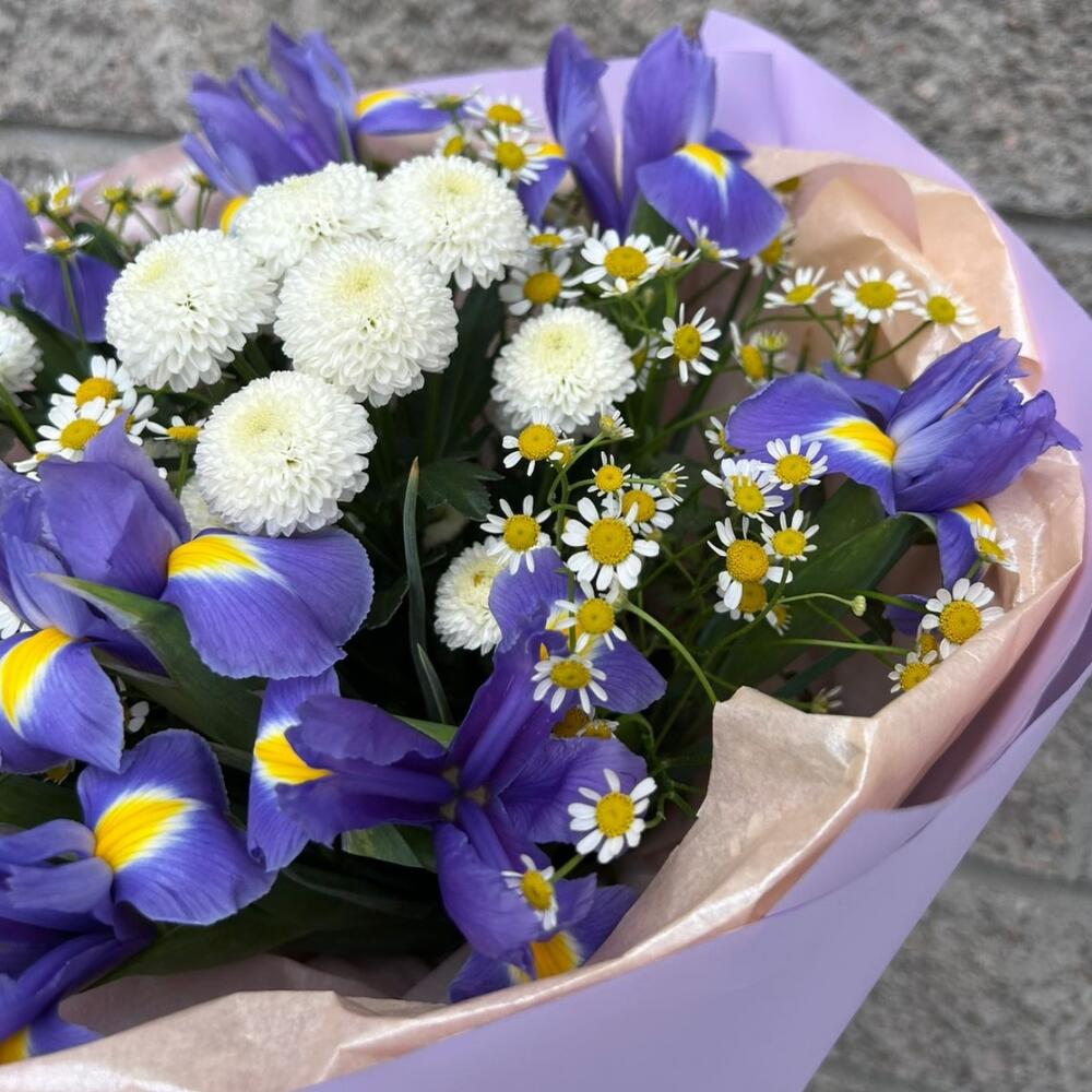 Ирис - 9 шт. Упаковка - 1 шт. Хризантема белая - 2 шт. матрикария (ромашка камилла) - 3 шт.