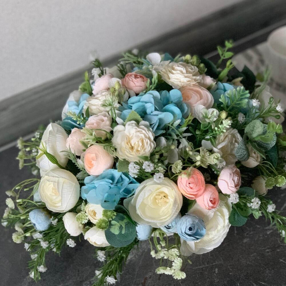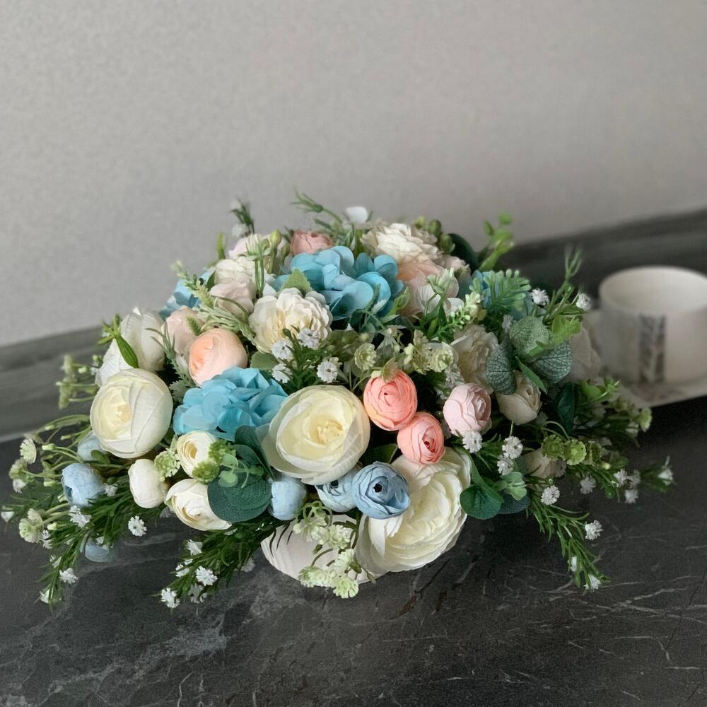 🦋композиция из искусственных интерьерных цветов. Выполнена в керамическом кашпо. Все цветы закреплены. 🌿В нежнейшем цветовом сочетании, низкая овальная форма работы. Универсальный вариант украсить стол/столик, тумбочку, консоль… 🌿Самый практичный вариант декора на долгий срок.