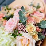Гортензия - 1 шт. Озотамнус - 1 шт. Роза кустовая - 3 шт. Эвкалипт - 7 шт. Роза - 4 шт. Диантус - 3 шт. Диантус кустовой - 1 шт.