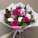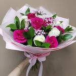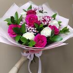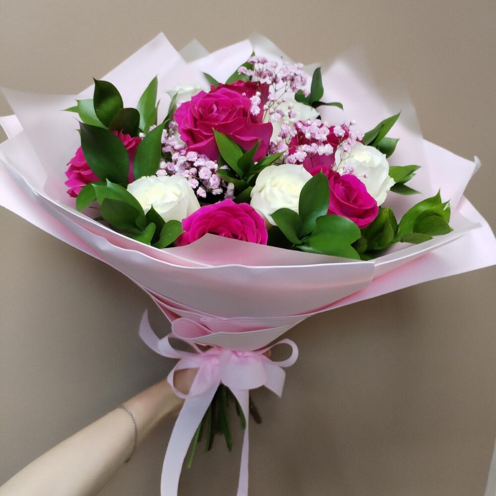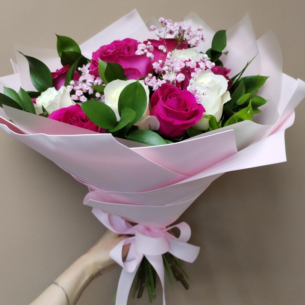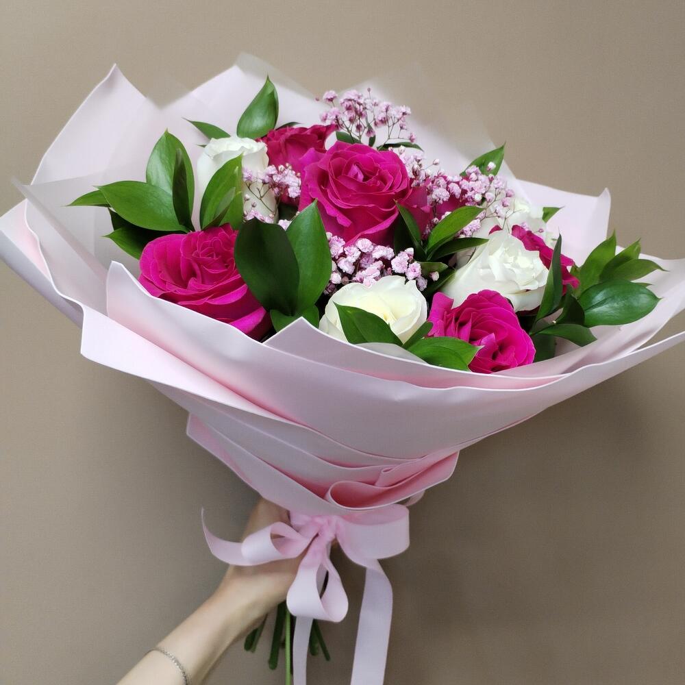 Рускус - 11 шт. Лента атласная - 2 шт. Роза Pink Floyd - 5 шт. Гипсофила Розовая - 1 шт. белые розы 60 см - 6 шт. упаковка полуматовая белая - 2 шт. фоамиран розовая мягкая - 3 шт.