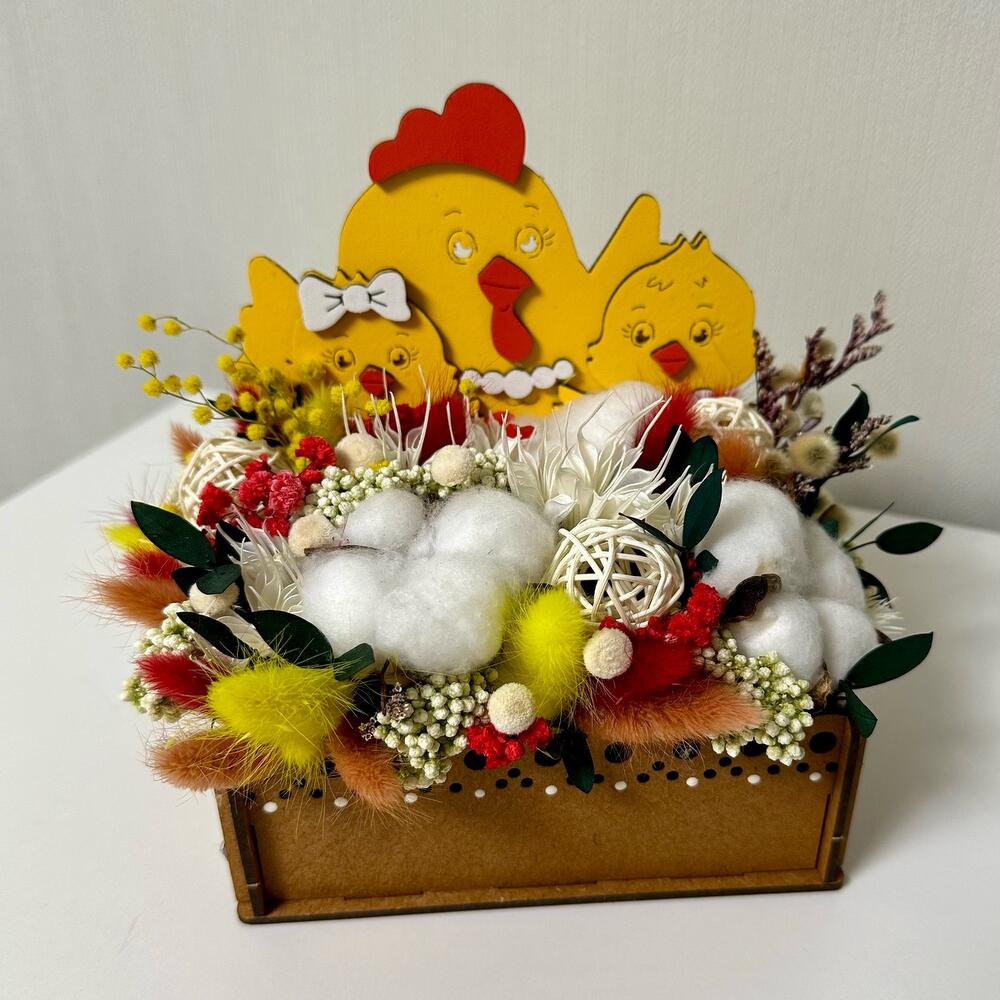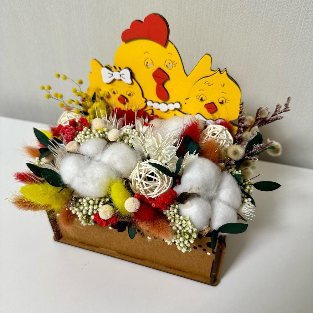 Кашпо «ЦЫПЛЯТА» деревянное 🌼 Яркое солнечное кашпо подарит отличное настроение ❤️ ▫️Состав: ✨стабилизированные- озотамнус, аспарагус,эвкалипт, гортензия, гипсофила, кермек ✨Сухоцветы- Хлопок-3, бадьян-7, лагурус-18, батао-5 Декор- ротанговые шарики-3 🔥МИМОЗА И ВЕРБА🔥 ▫️Параметры Д/ш/в - 20/12/18 Упаковка и открытка в подарок 🎁