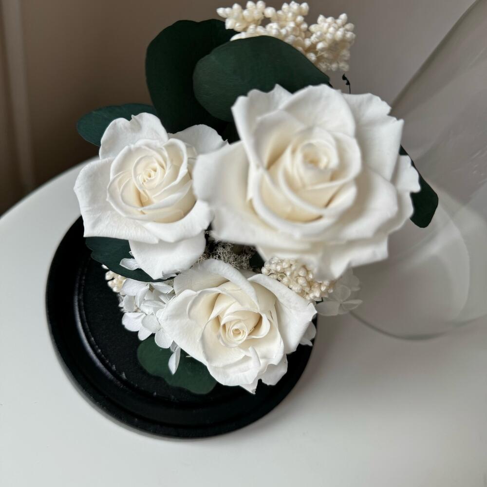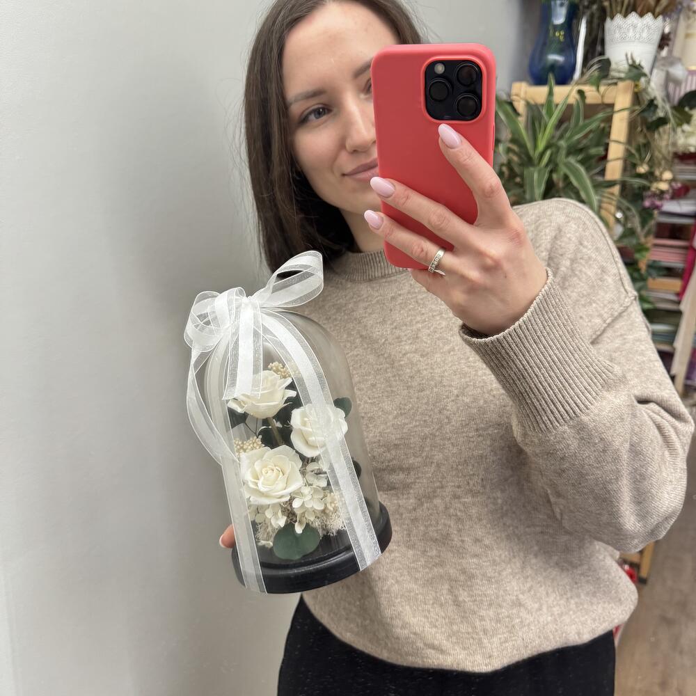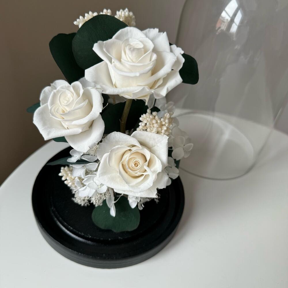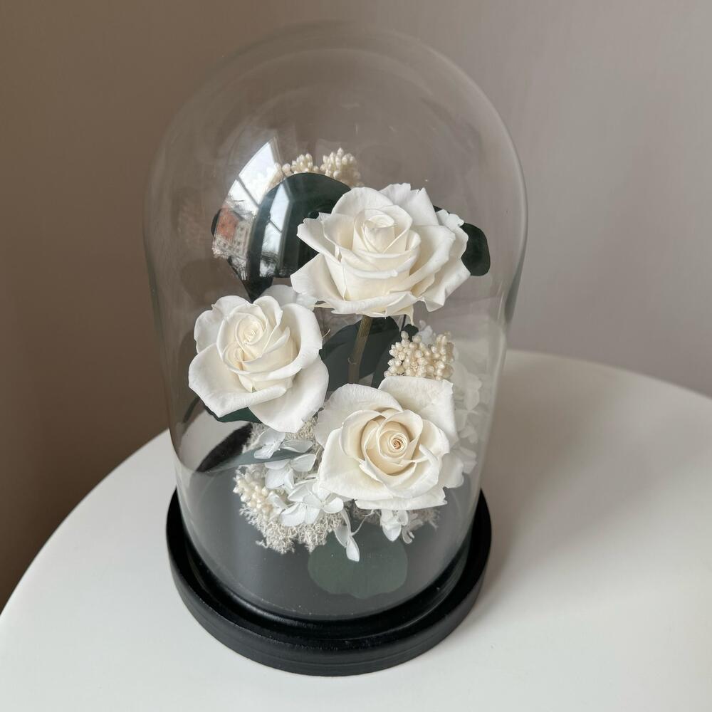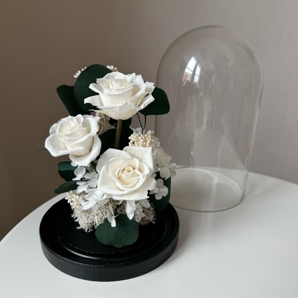 - Итерьерный клош с тремя белыми классическими стабилизированными розами среднего размера, эвкалиптом, гортензией и озотамнусом украсит любой интерьер. - Станет отличным подарком по любому поводу. - Сохранит свой внешний вид не менее года. Розы в колбе только в современном виде: - натуральные цветы - не завянут - не нужна вода - минимальный уход Клош упакован в подарочный пакет и перевязан лентой. Открытка и инструкция по уходу в подарок.