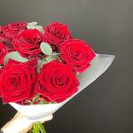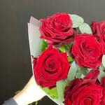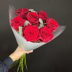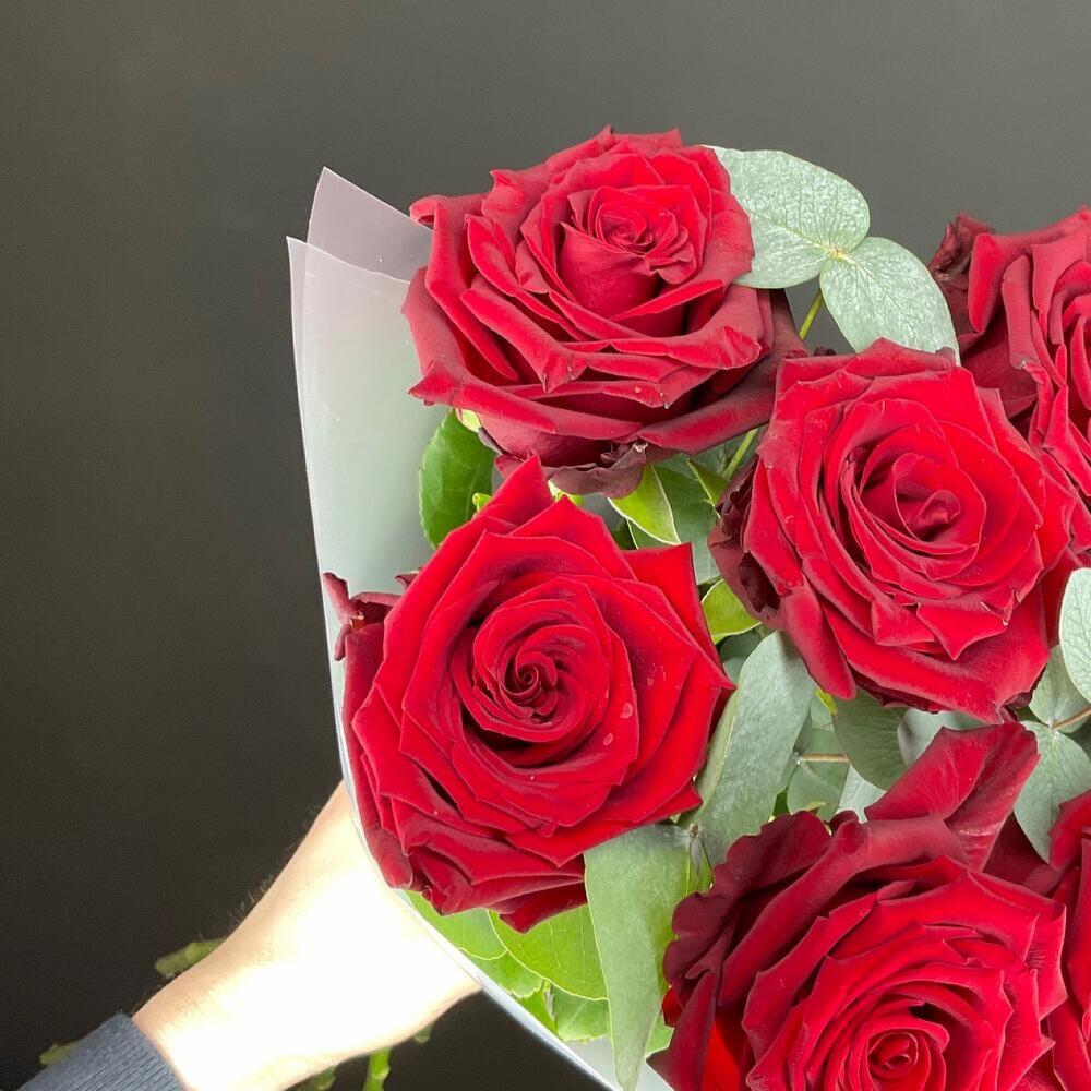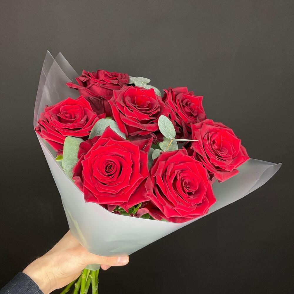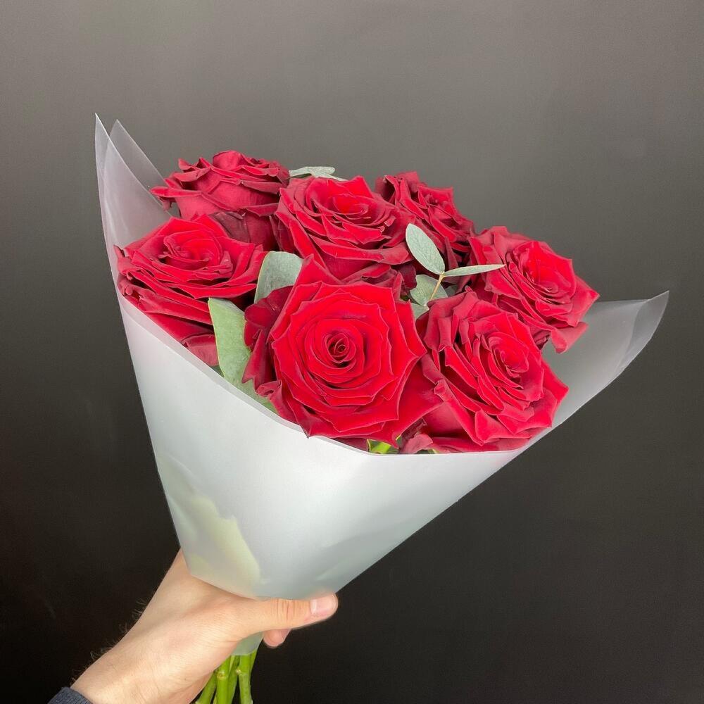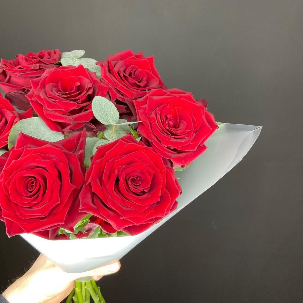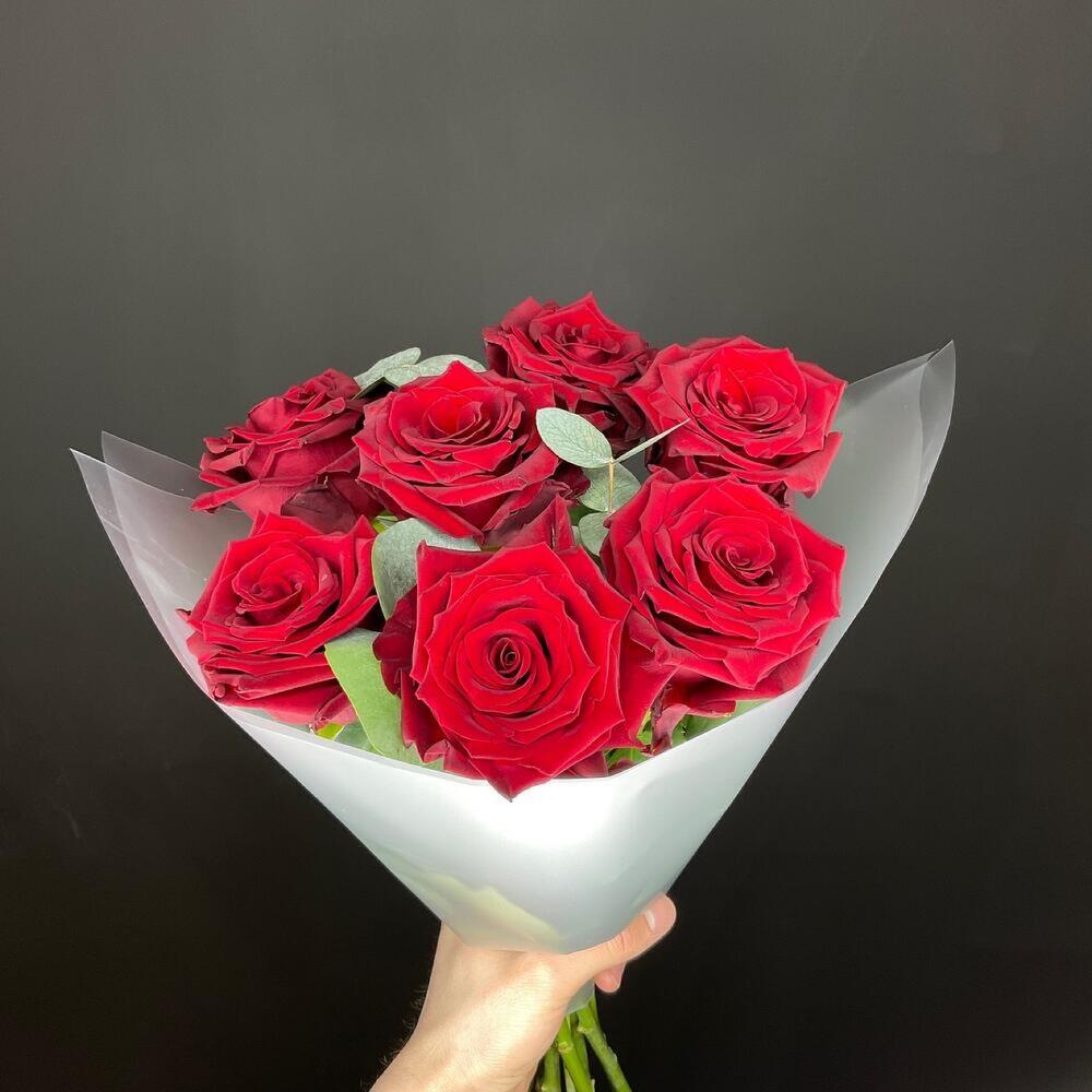Эвкалипт - 1 шт. сборка в декор бумагу - 1 шт. роза красная 50 см (кения) - 7 шт.